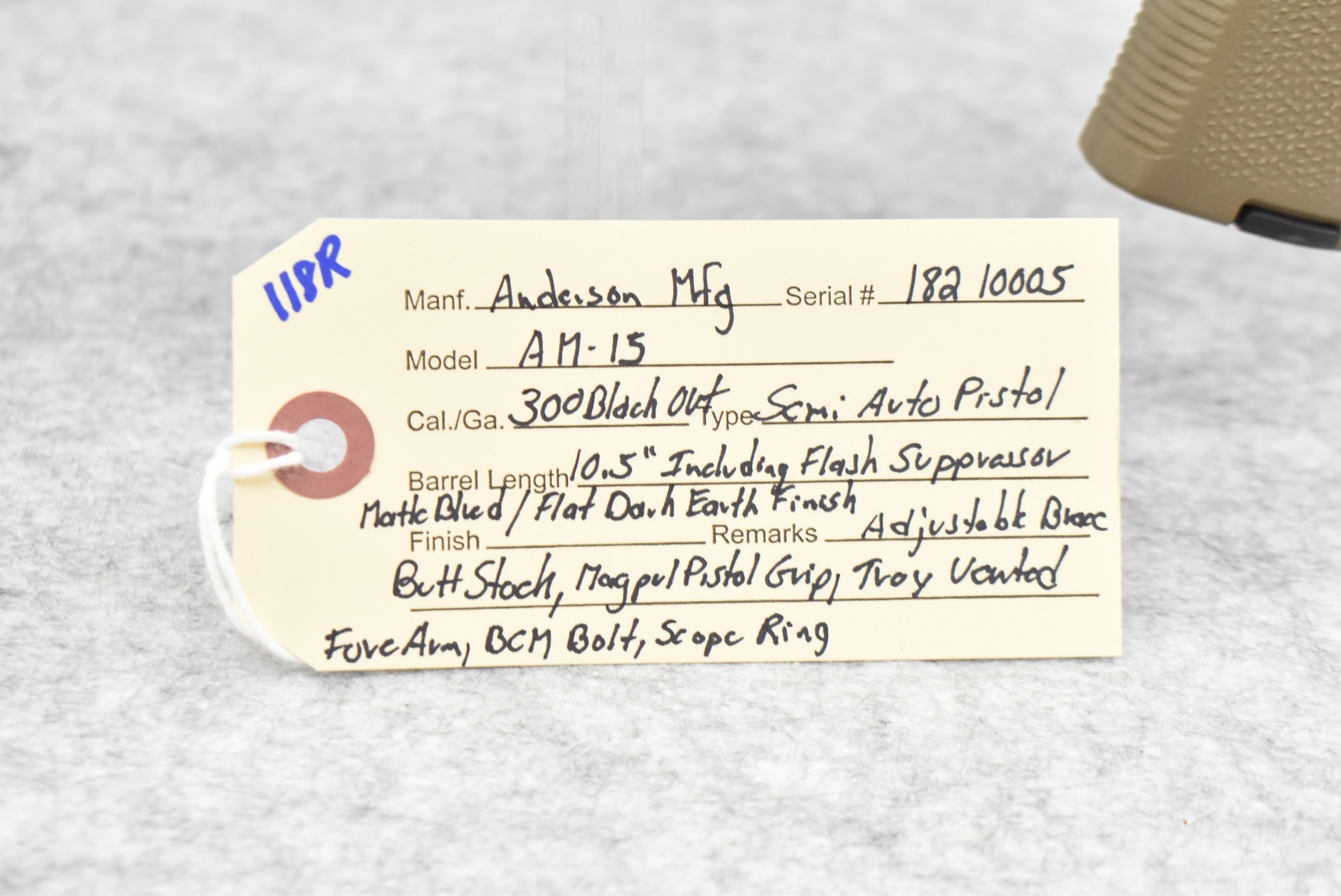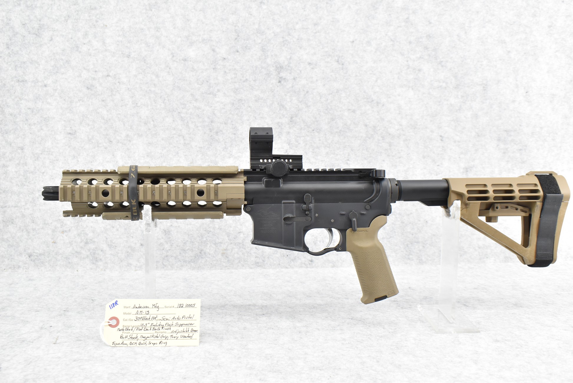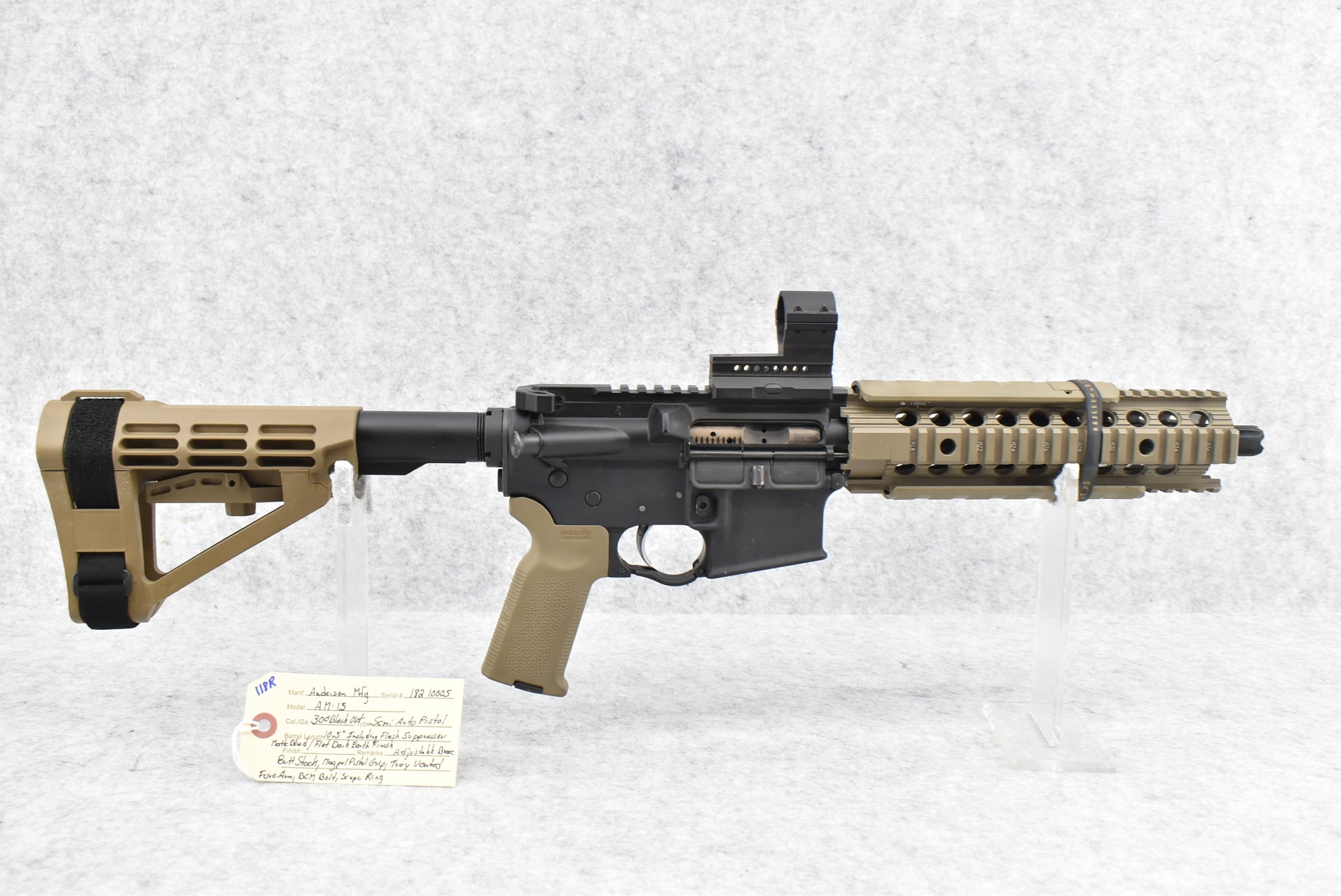 118R. Anderson – Mod. AM-15 – 300 Black Out Cal. Semi-Auto Pistol – w/10.5” Barrel Including Flash Hider – Matte Blued/Flat Dark Earth Finish – w/Adj. Brace Butt Stock, MagPul Pistol Grip & Troy Vented Forearm – w/BCM Bolt – w/Scope Ring