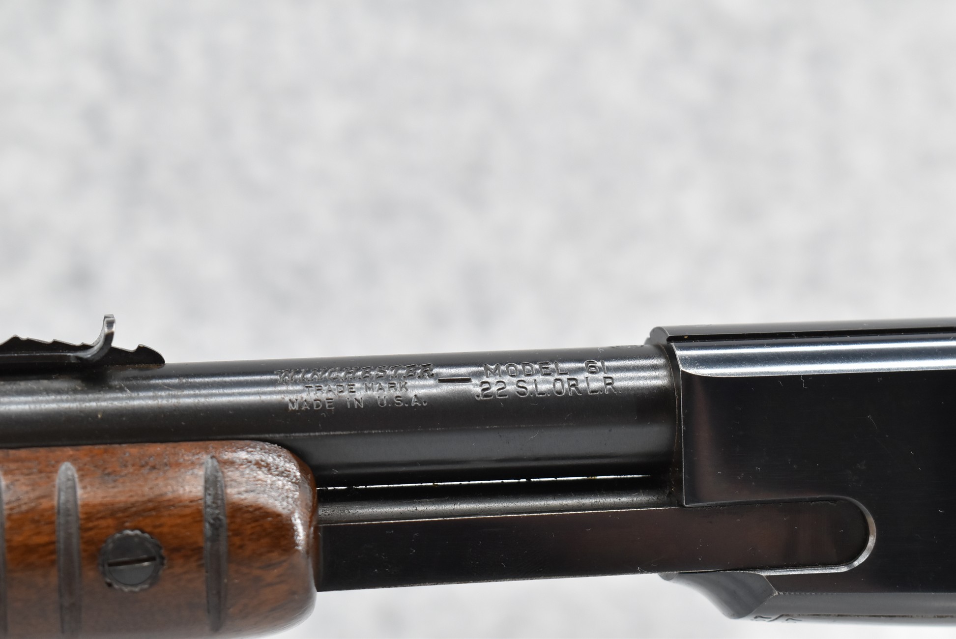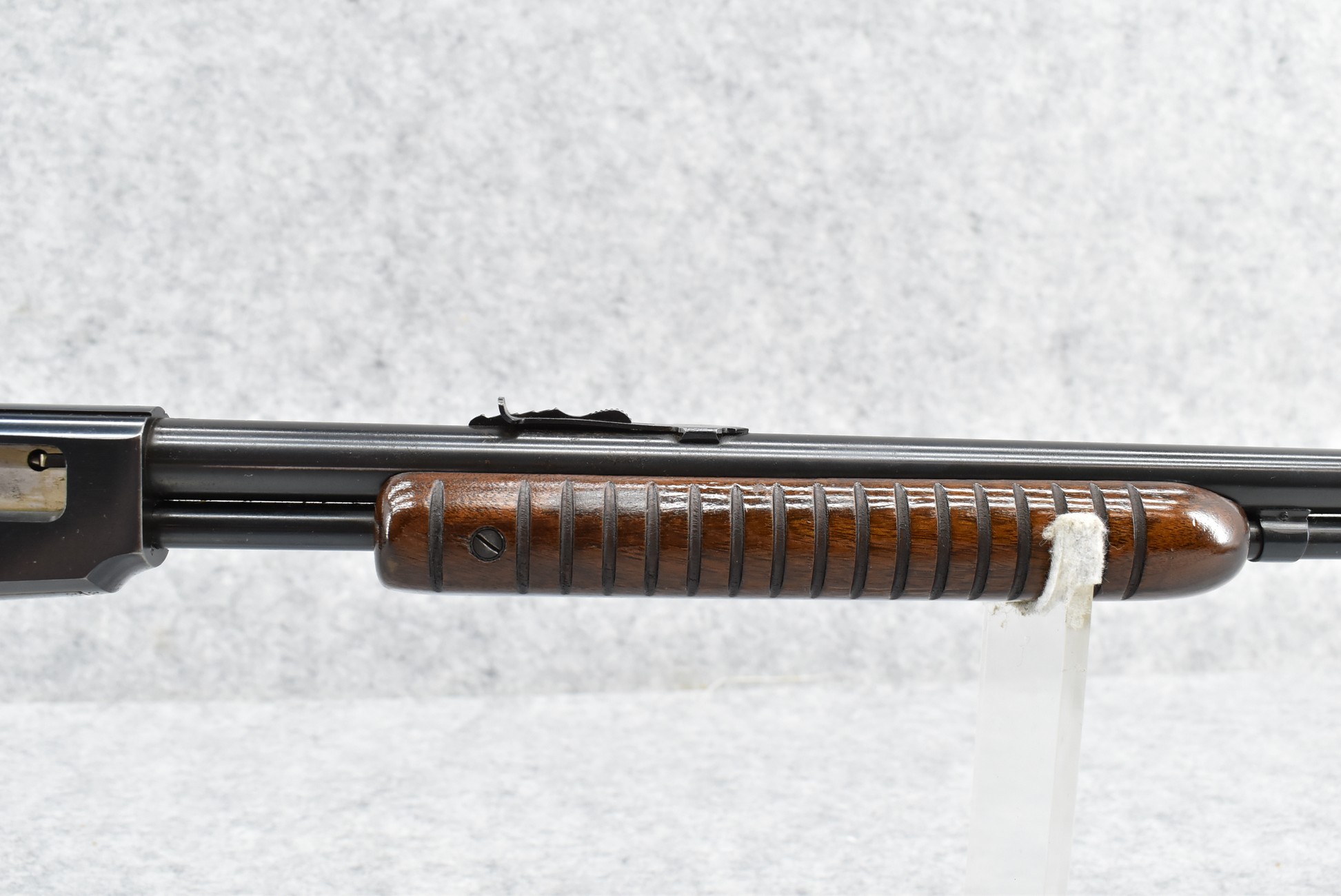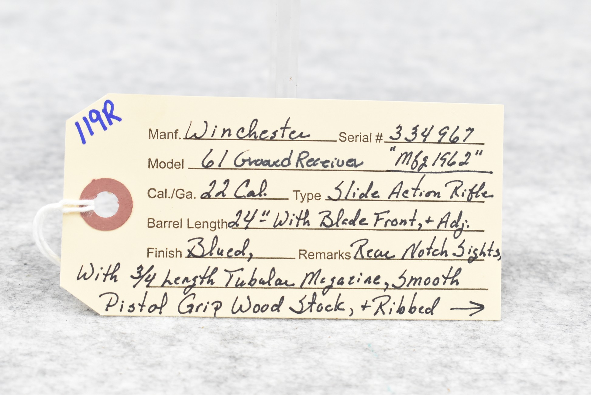 119R. Winchester – Mod. 61 Grooved Receiver – 22 Cal. Pump Action Rifle – w/24” Barrel w/Blade Front & Adj. Rear Notch Sights w/3/4 Length Tubular Magazine – Blued Finish – w/Smooth Pistol Grip Wood Stock & Ribbed Forearm w/Factory Checkered Butt Plate – Mfg. 1962
