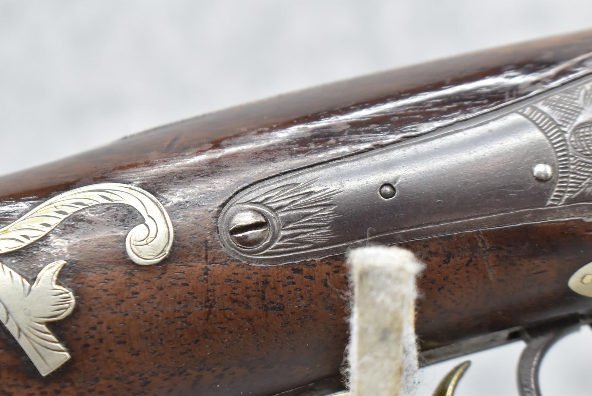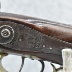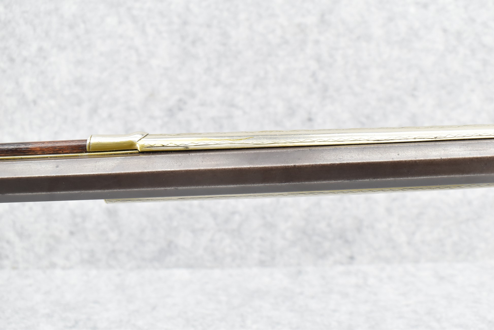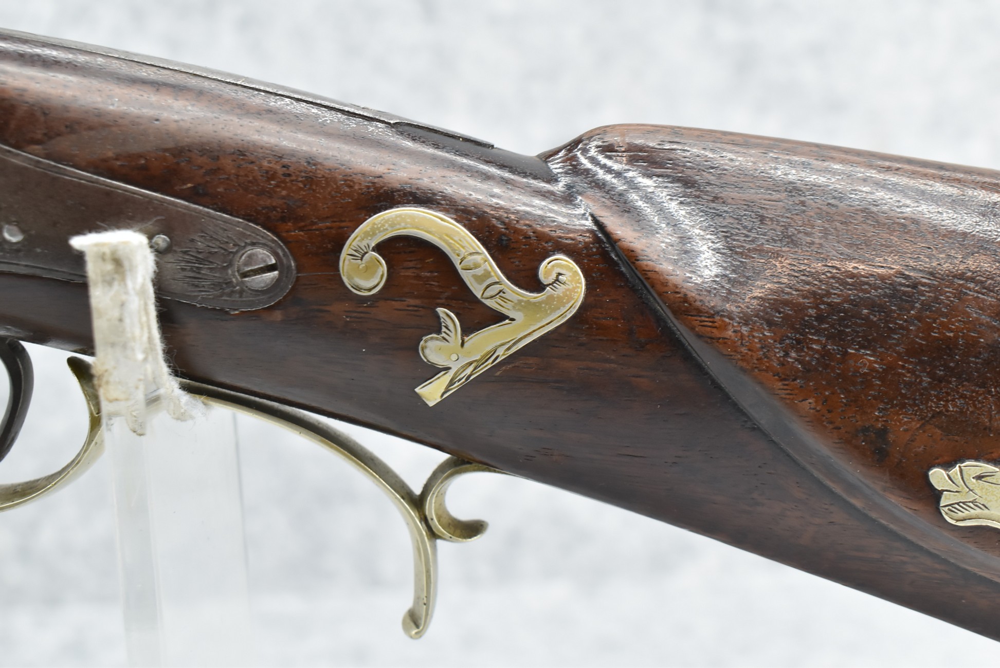 120. Very High Quality Unknown Mfg. 45 Cal. Over-Under Combo Percussion Lock Rifle – Both Barrels are 45 Cal. w/Top Barrel Rifled & Bottom Barrel Smoothbore – Both Barrels Are 34”, Octagon – Top Barrel Has Front & Rear Sights – Half Butt Stock w/Silver Butt Plate, Silver Fitted Furniture Including the Engraved Cap Box, 6 Unusual Silver Inlays, The Silver Furniture is Engraved – Gun Has Double Triggers w/One Being a Set Trigger – The Sides of the Barrels Are Full Silvered as Well – A Must See!!