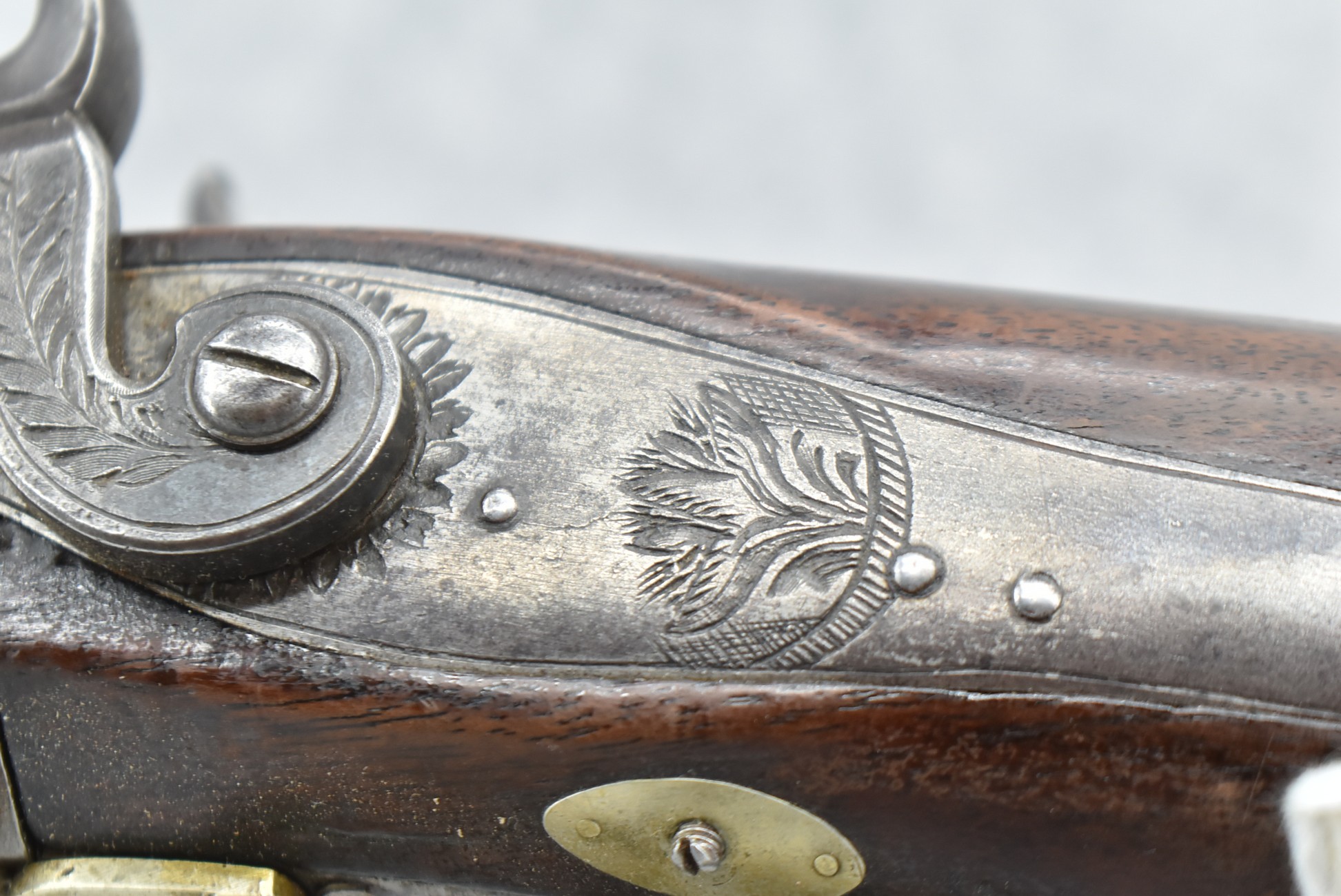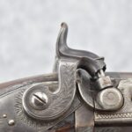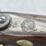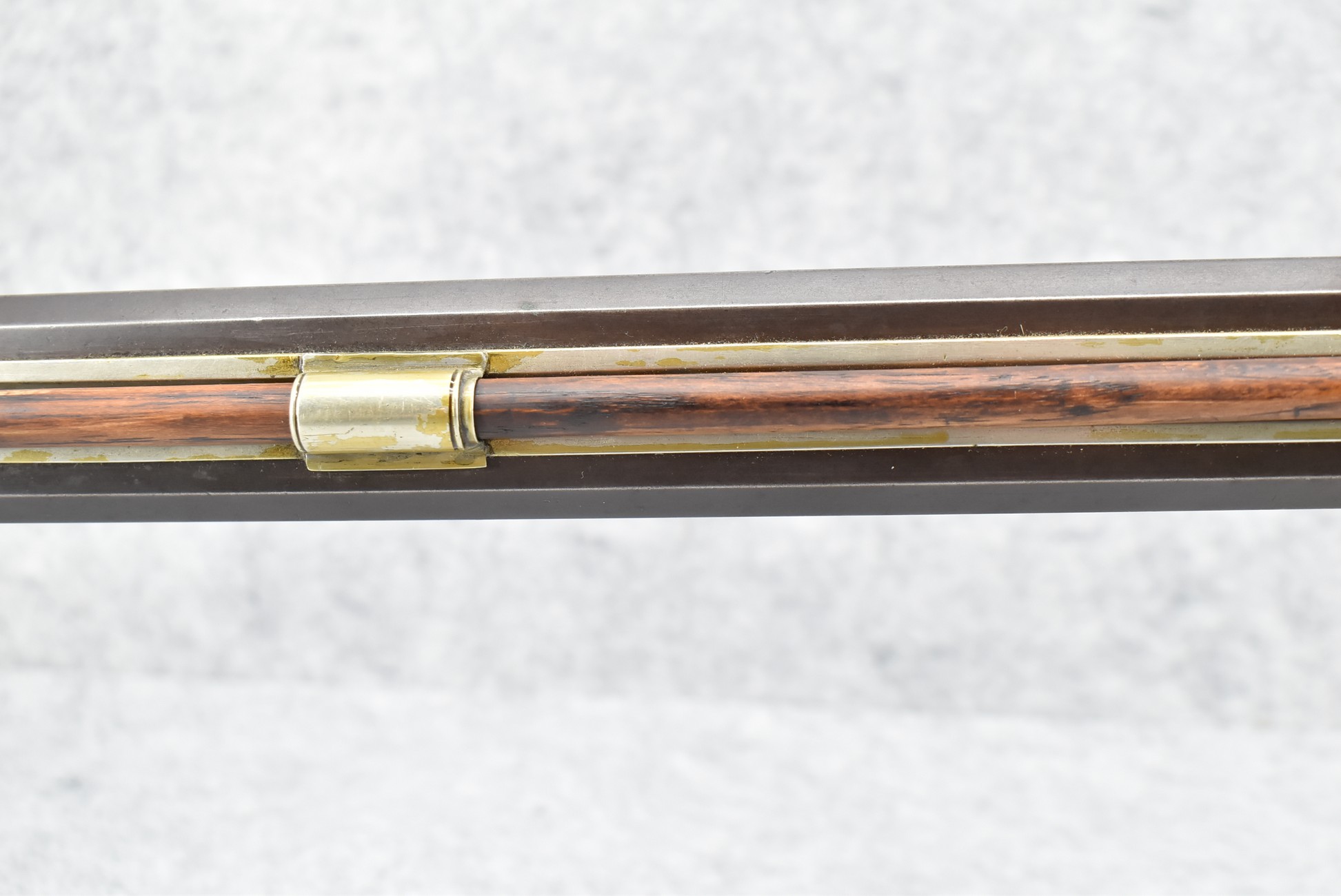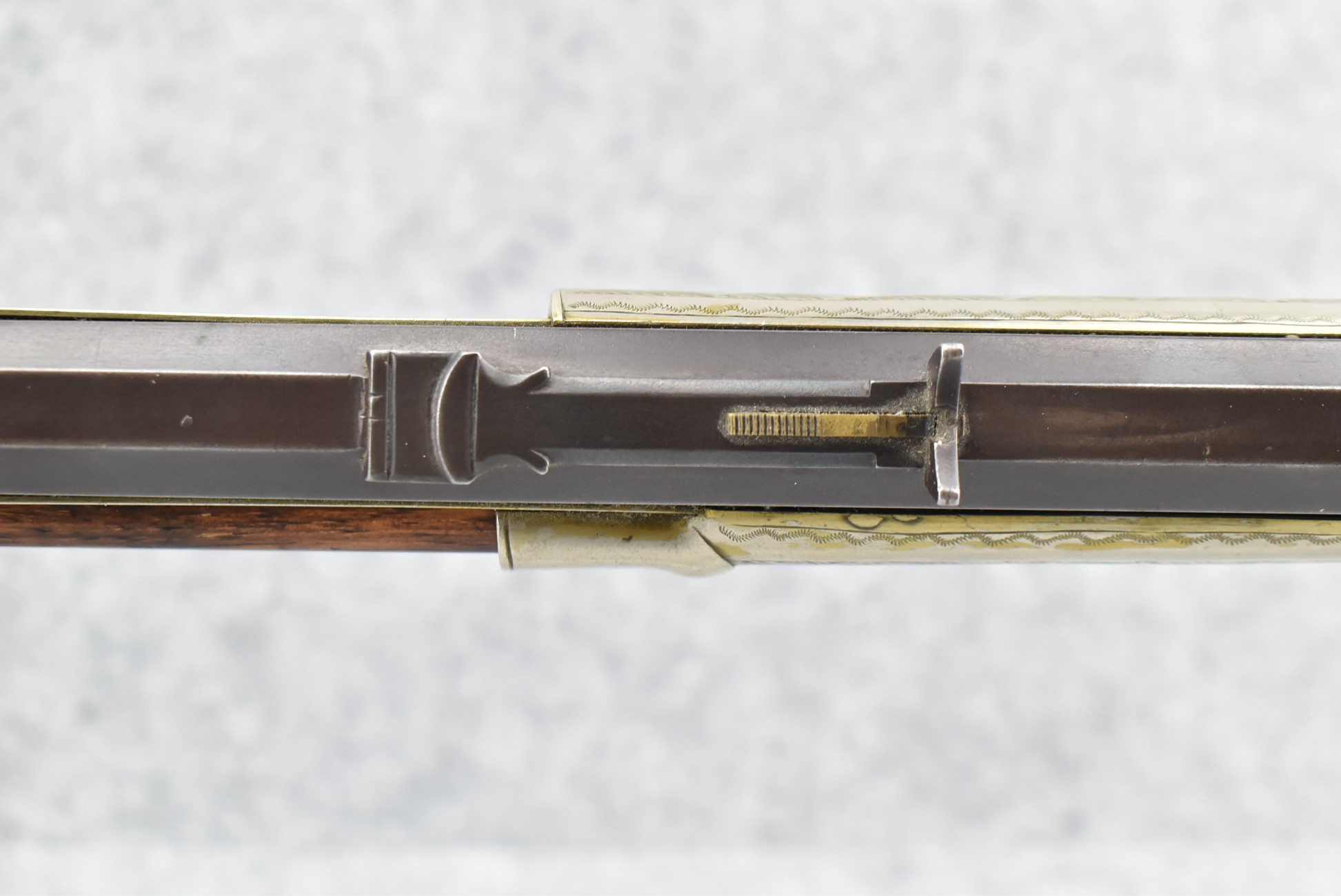 120. Very High Quality Unknown Mfg. 45 Cal. Over-Under Combo Percussion Lock Rifle – Both Barrels are 45 Cal. w/Top Barrel Rifled & Bottom Barrel Smoothbore – Both Barrels Are 34”, Octagon – Top Barrel Has Front & Rear Sights – Half Butt Stock w/Silver Butt Plate, Silver Fitted Furniture Including the Engraved Cap Box, 6 Unusual Silver Inlays, The Silver Furniture is Engraved – Gun Has Double Triggers w/One Being a Set Trigger – The Sides of the Barrels Are Full Silvered as Well – A Must See!!