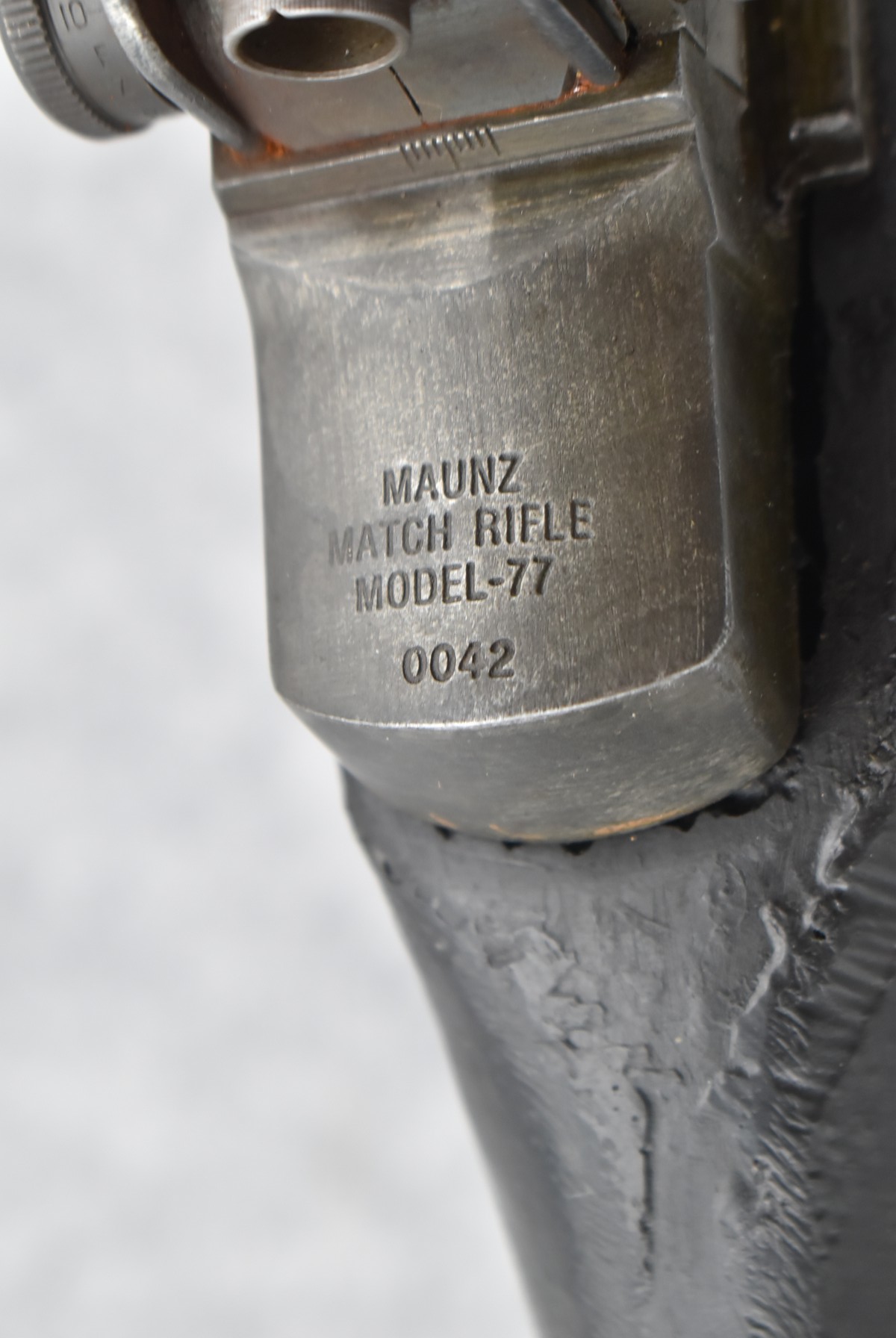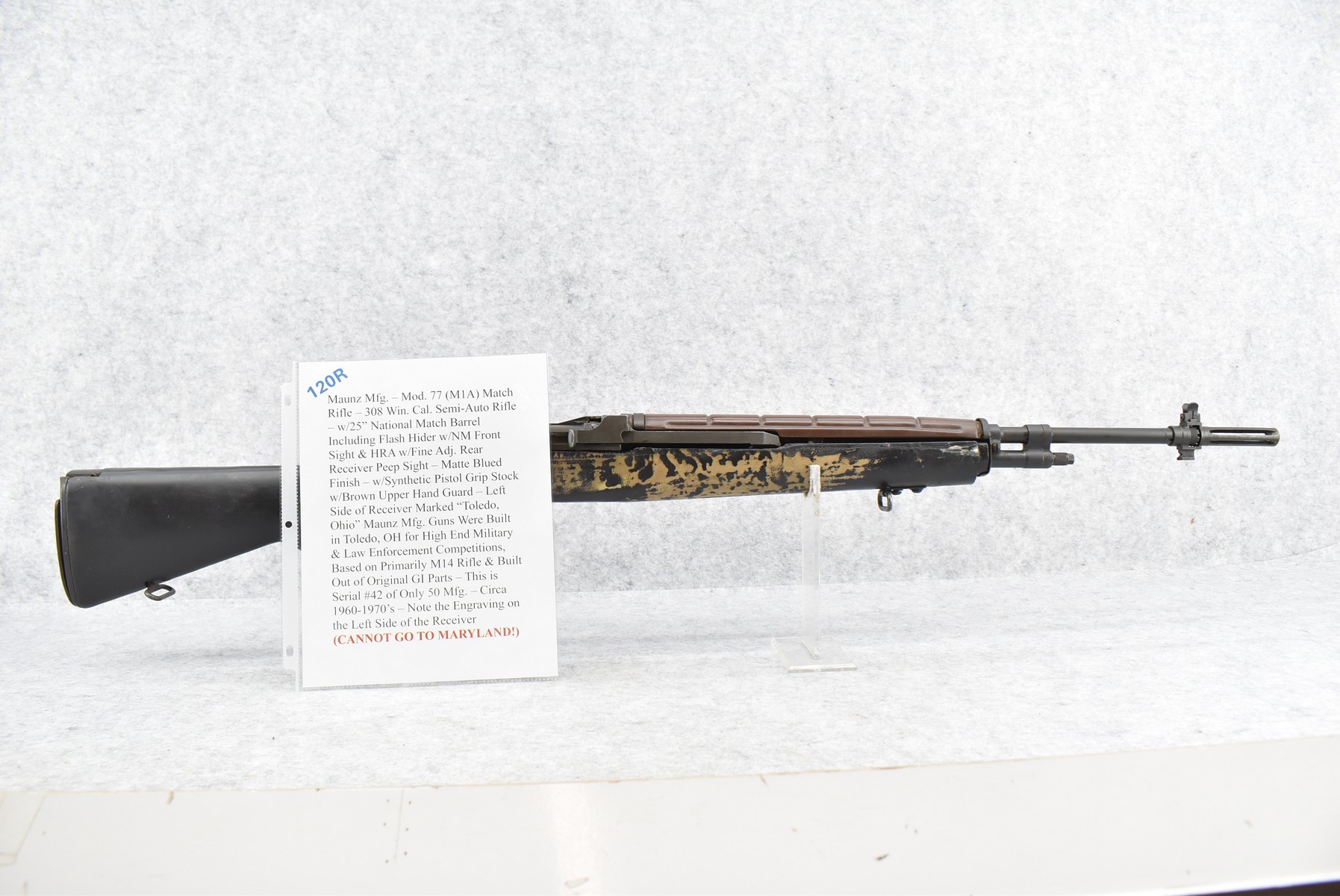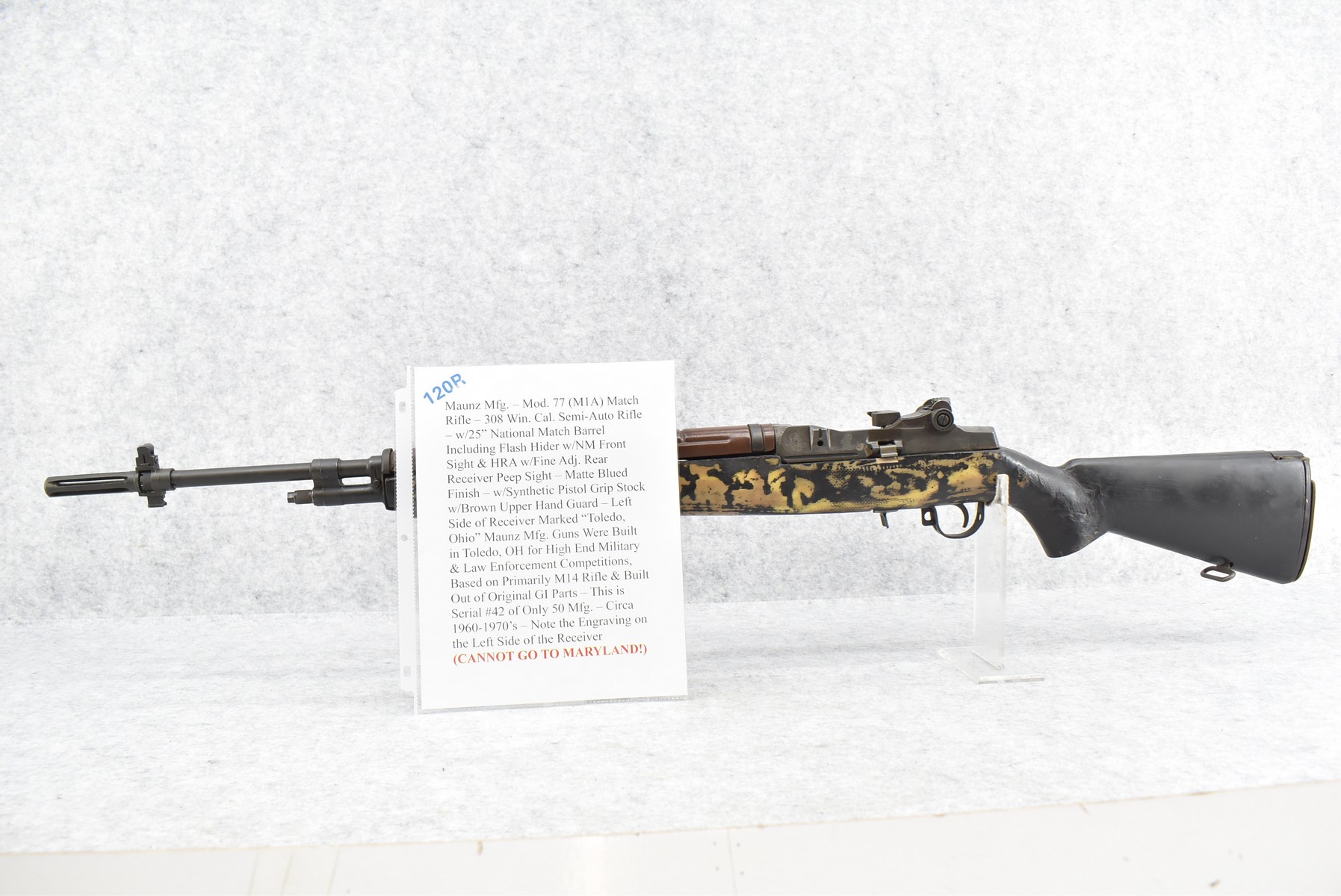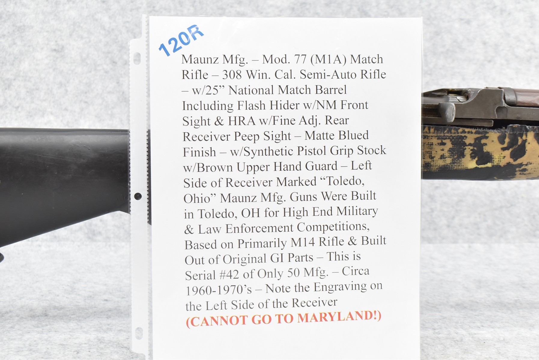 120R. Maunz Mfg. – Mod. 77 (M1A) Match Rifle – 308 Win. Cal. Semi-Auto Rifle – w/25” National Match Barrel Including Flash Hider w/NM Front Sight & HRA w/Fine Adj. Rear Receiver Peep Sight – Matte Blued Finish – w/Synthetic Pistol Grip Stock w/Brown Upper Hand Guard – Left Side of Receiver Marked “Toledo, Ohio” – Maunz Mfg. Guns Were Built in Toledo, OH for High End Military & Law Enforcement Competitions, Based on Primarily M14 Rifle & Built Out of Original GI Parts – This is Serial #42 of Only 50 Mfg. – Circa 1960-1970’s – Note the Engraving on the Left Side of the Receiver (CANNOT GO TO MARYLAND!)