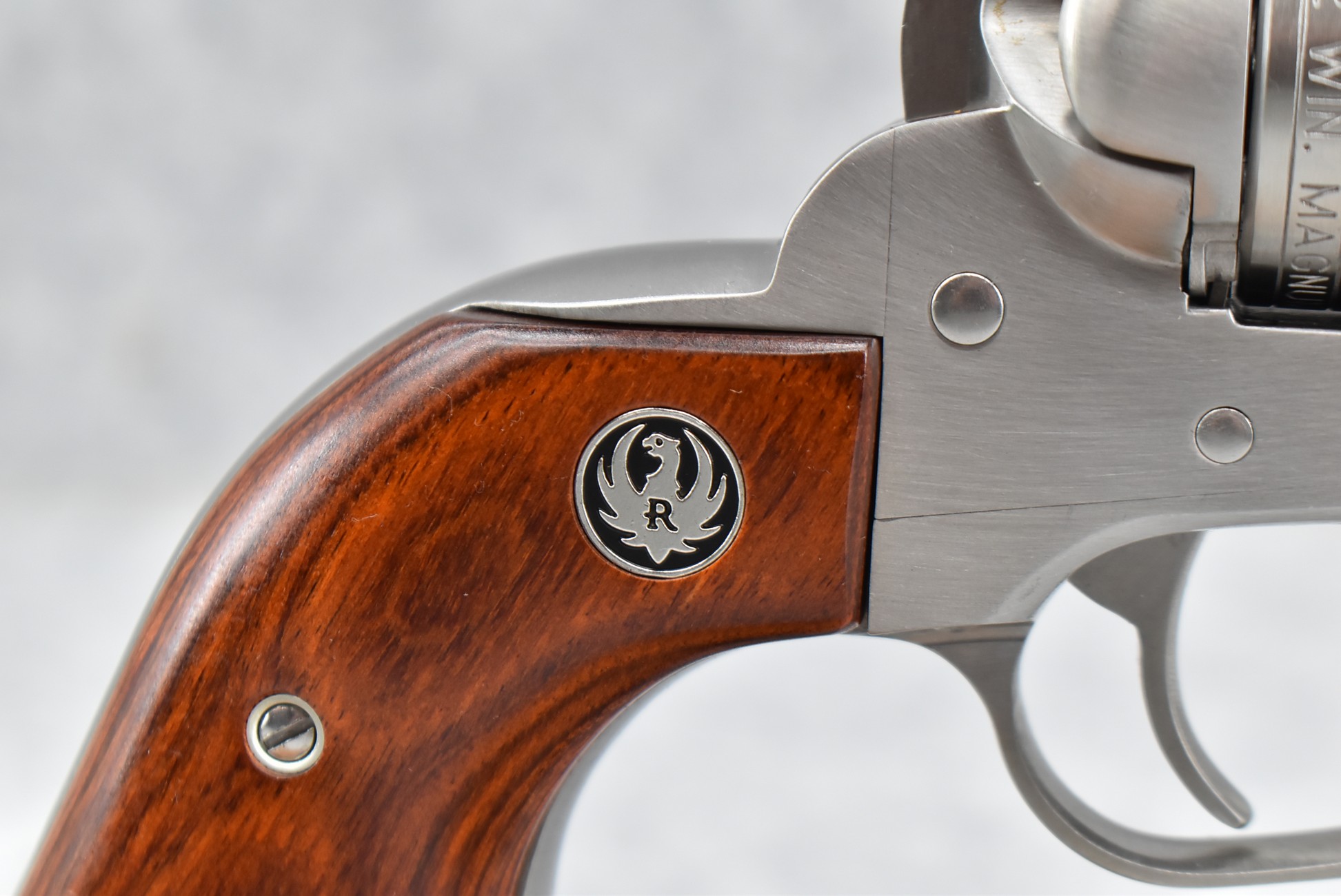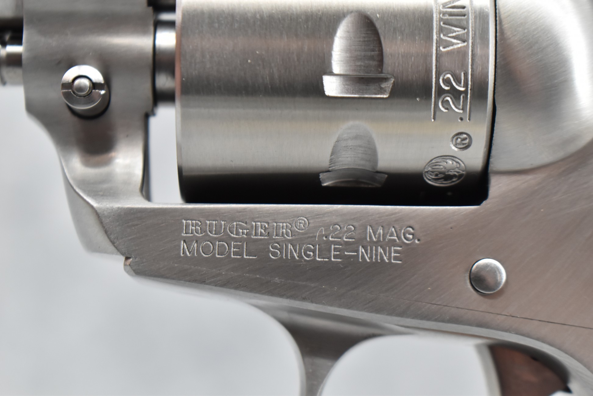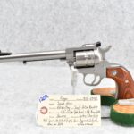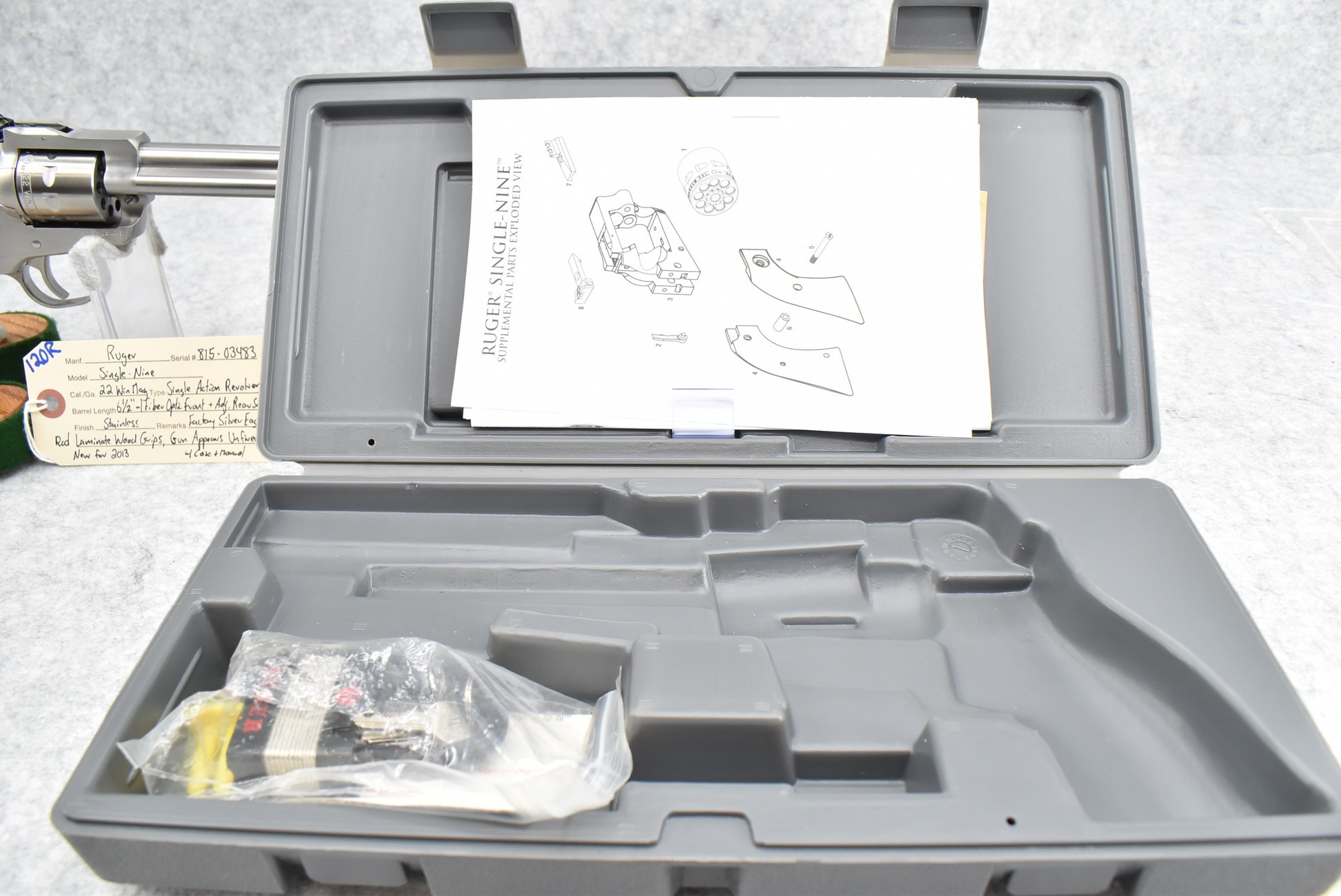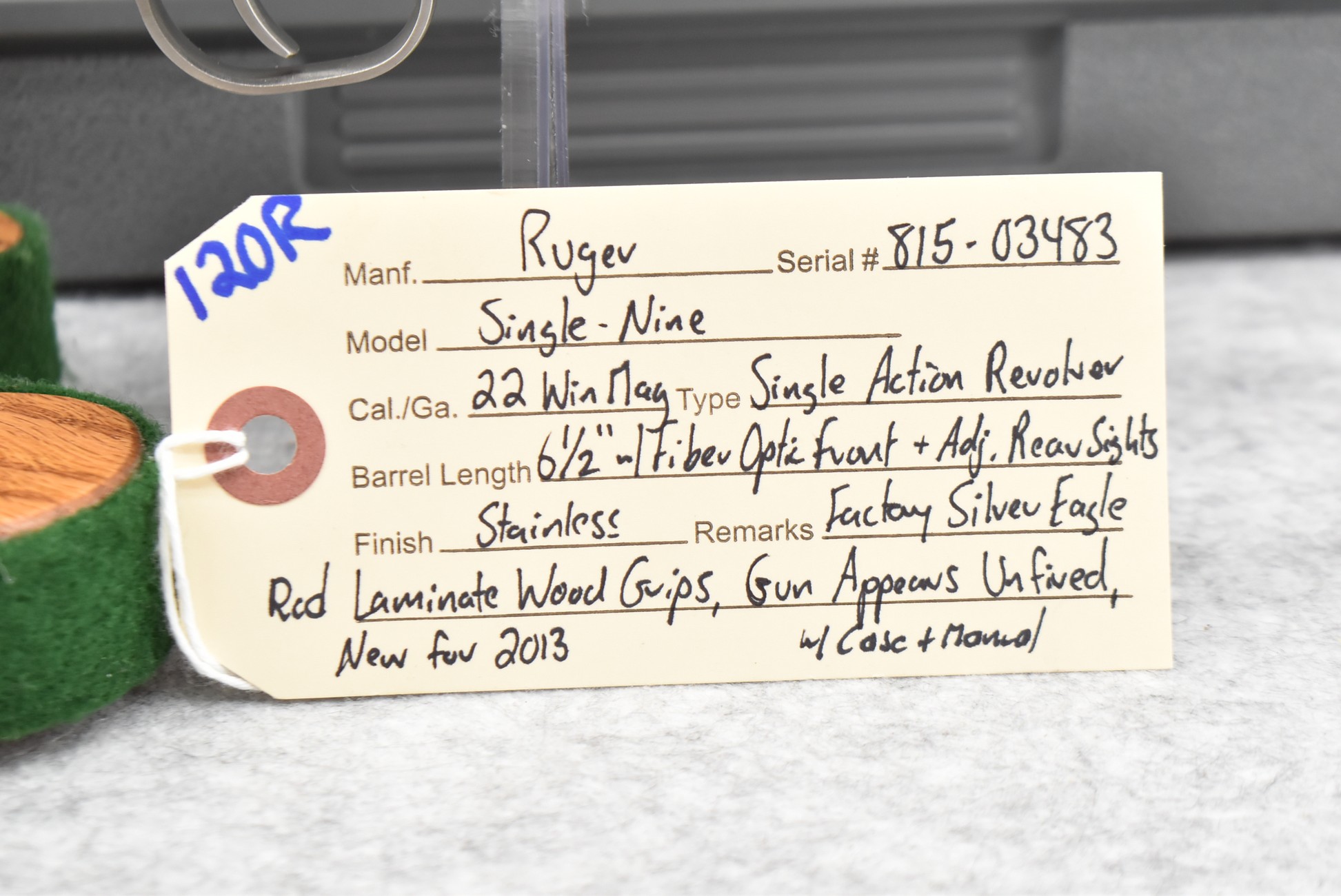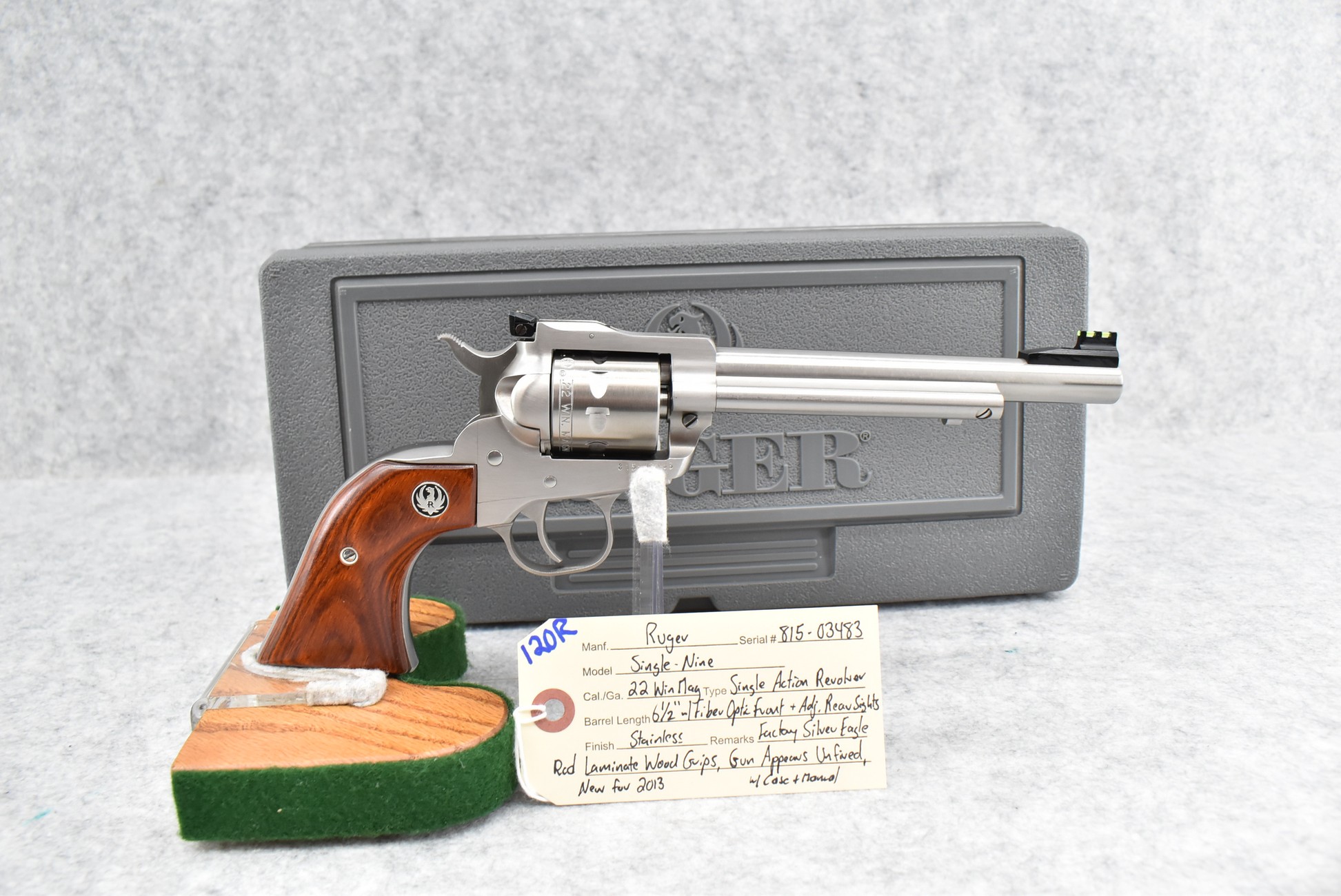 120R. Ruger – Mod. Single-Nine – 22 Win. Mag. Cal. Single Action Revolver – w/6 ½” Barrel w/Fiber Optic Front & Adj. Rear Sights – Stainless Finish – w/Factory Silver Eagle Red Laminate Wood Grip – Gun Appears Unfired w/Case & Manual – New for 2013
