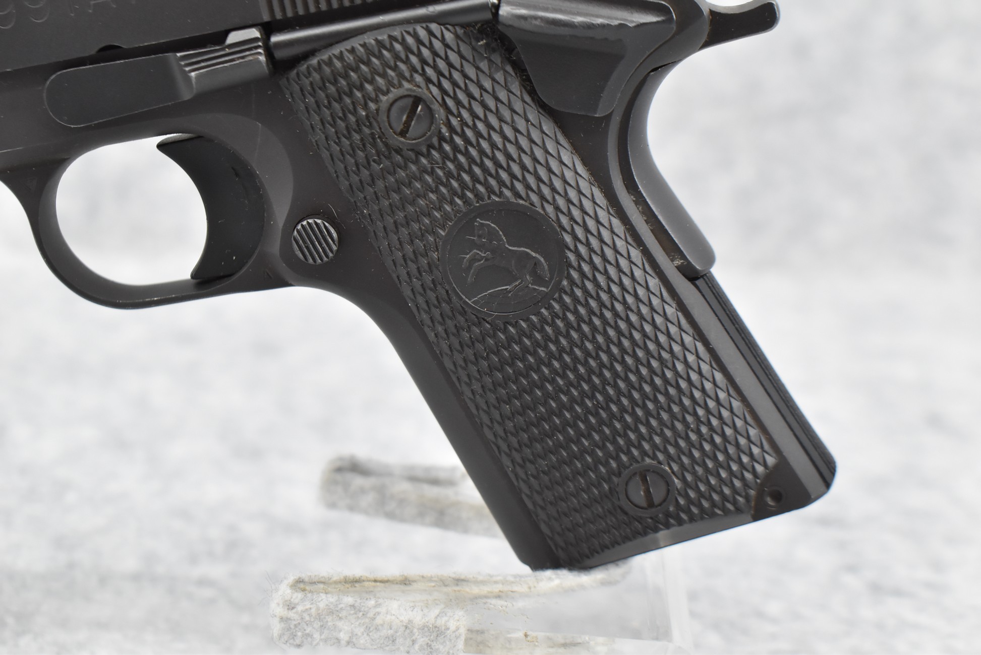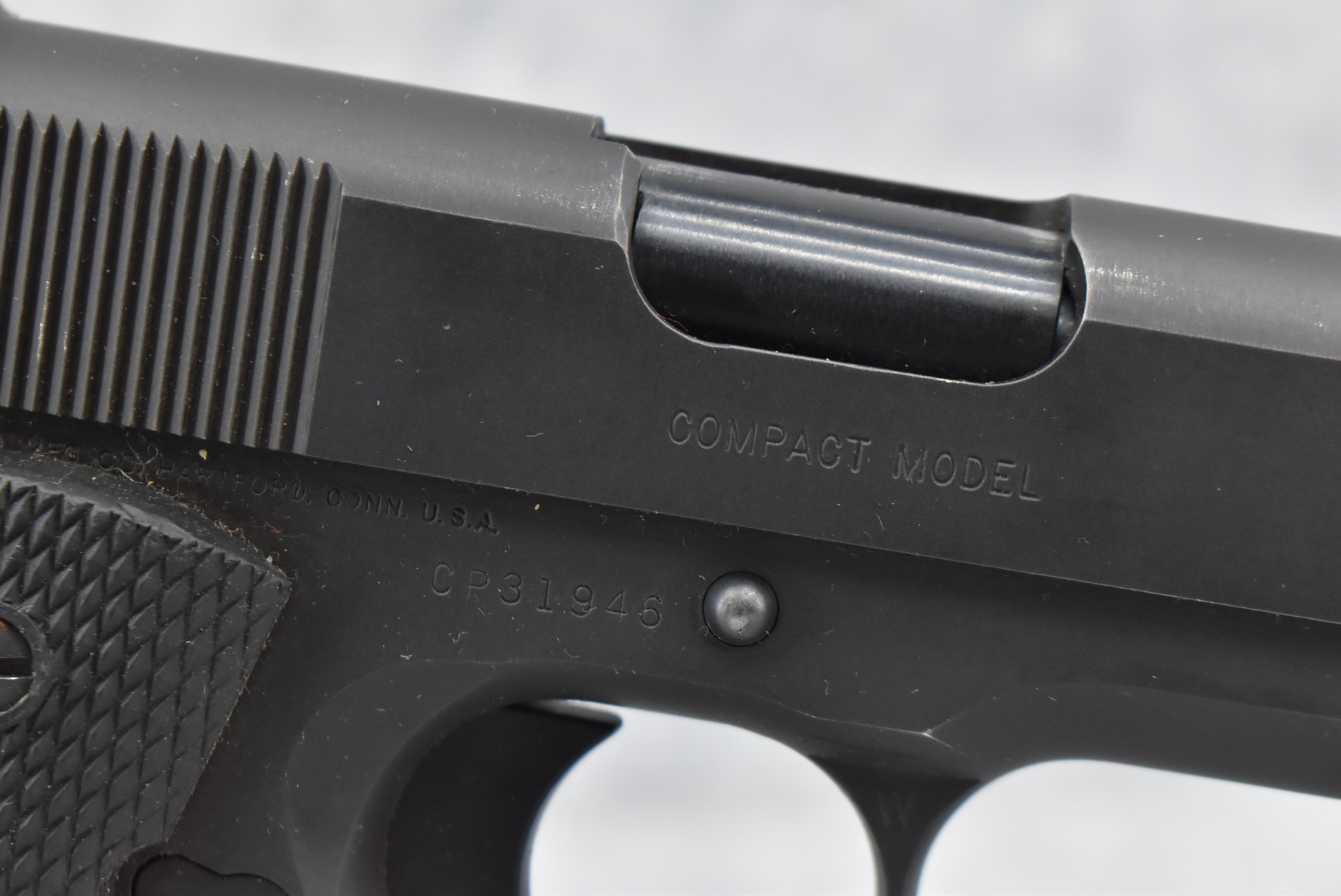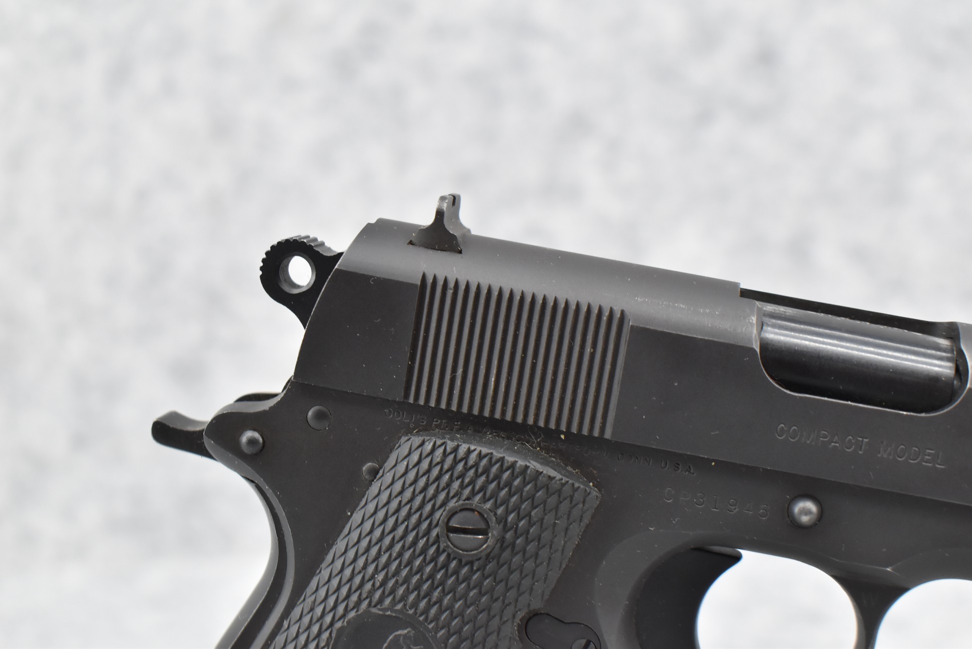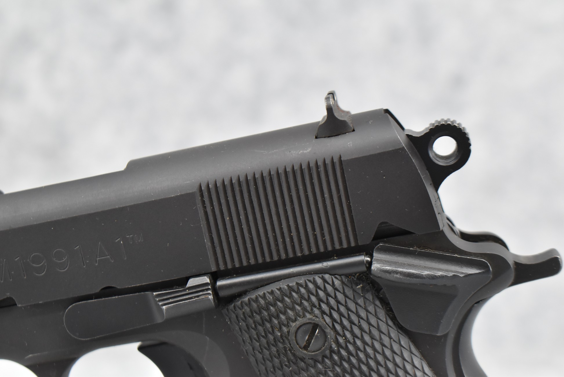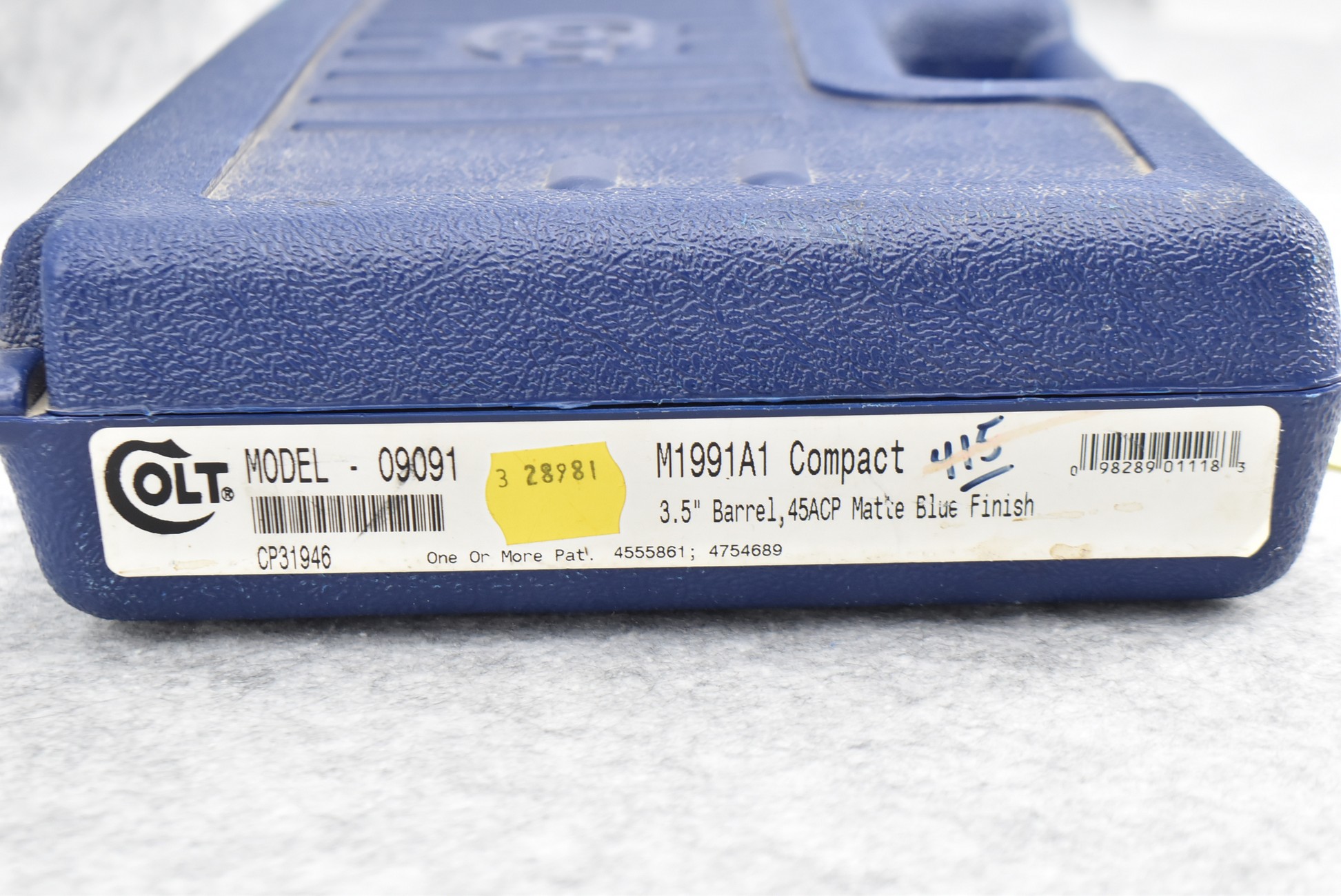 121R. Colt – Mod. M1991A1 Compact Model – 45 Auto Cal. Semi-Auto Pistol – w/3 ½” Barrel w/3-Dot White Sights – Matte Blued Finish – w/Factory Checkered Rubber Grips – w/Factory Hard Case & Manual – No Mag Currently