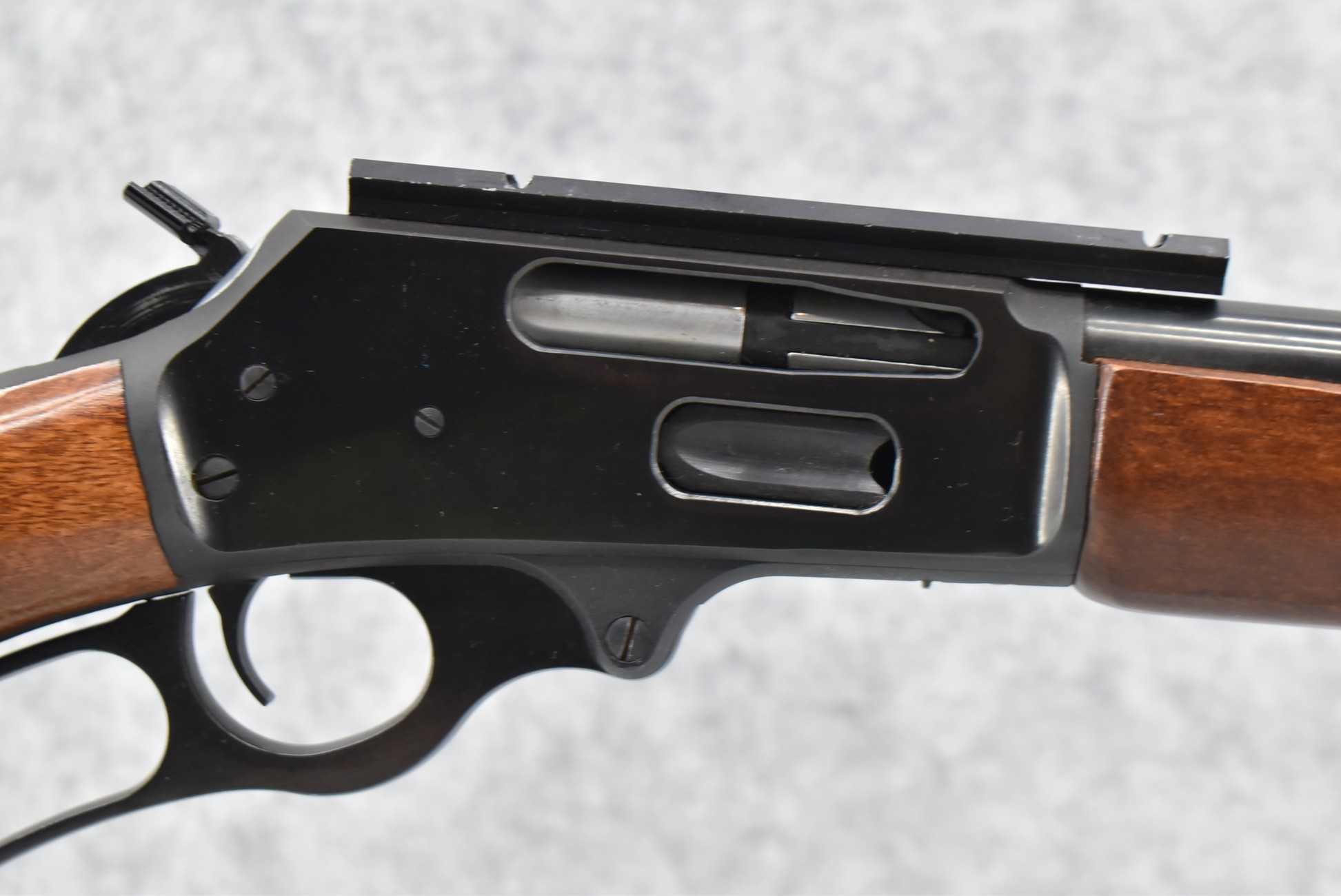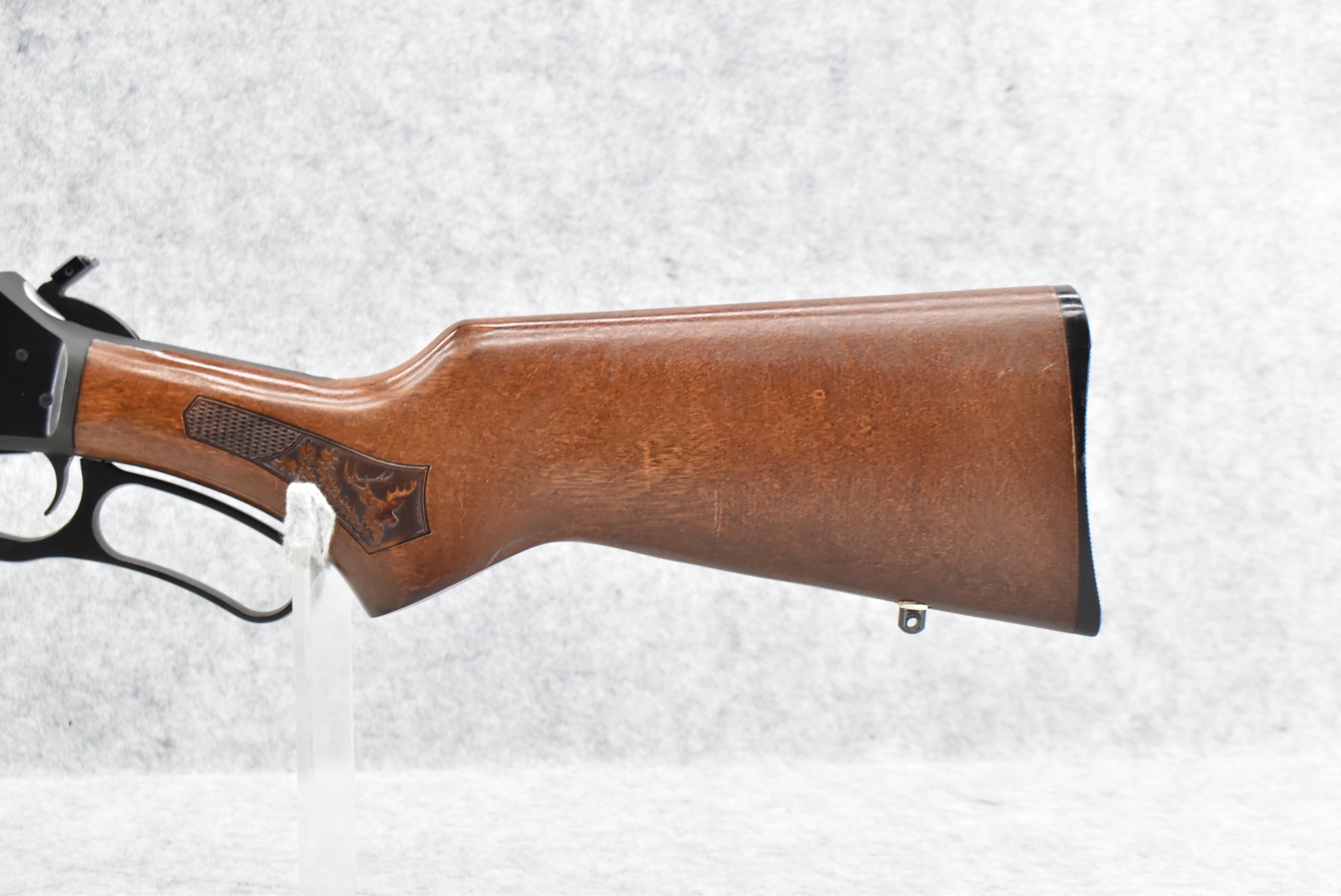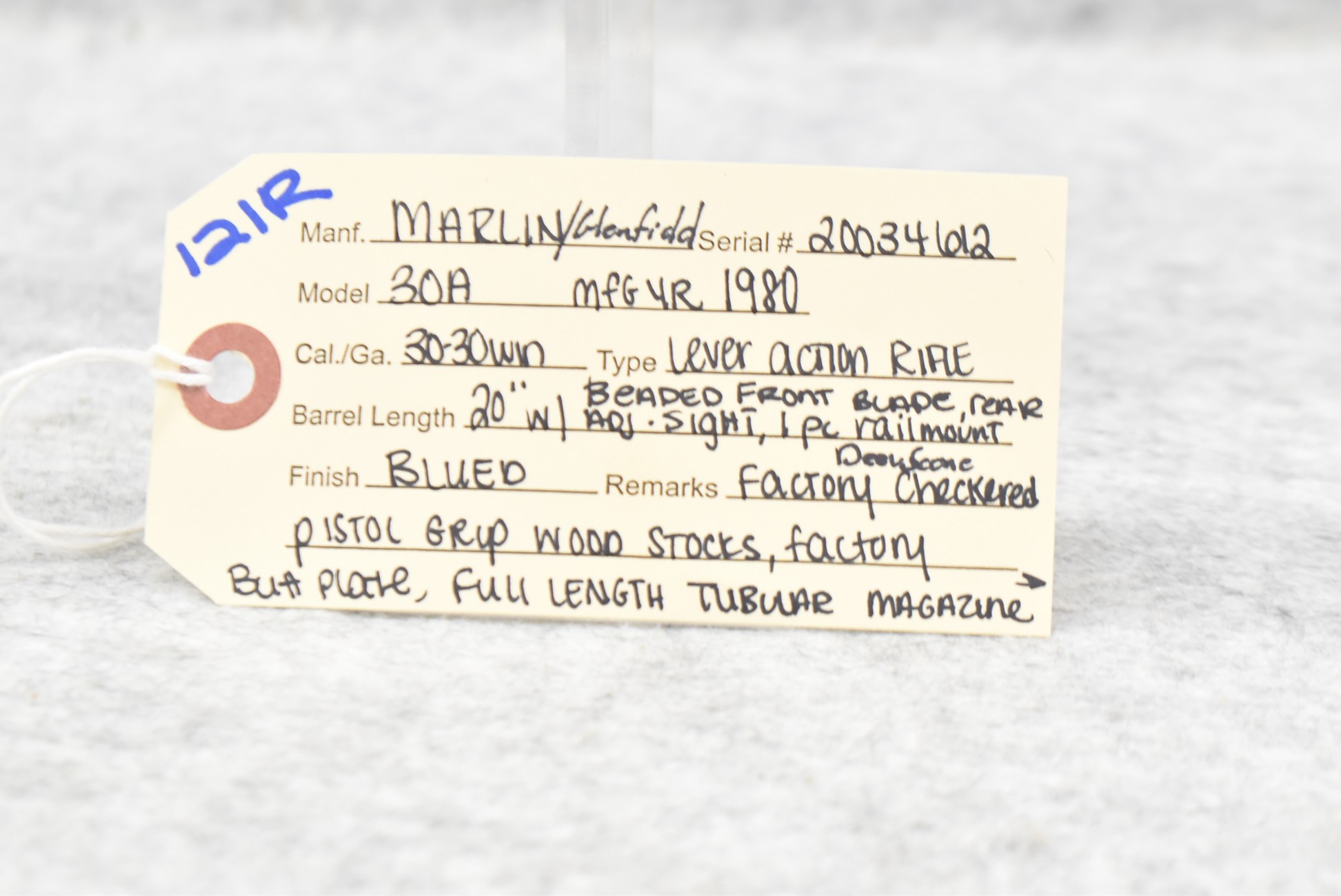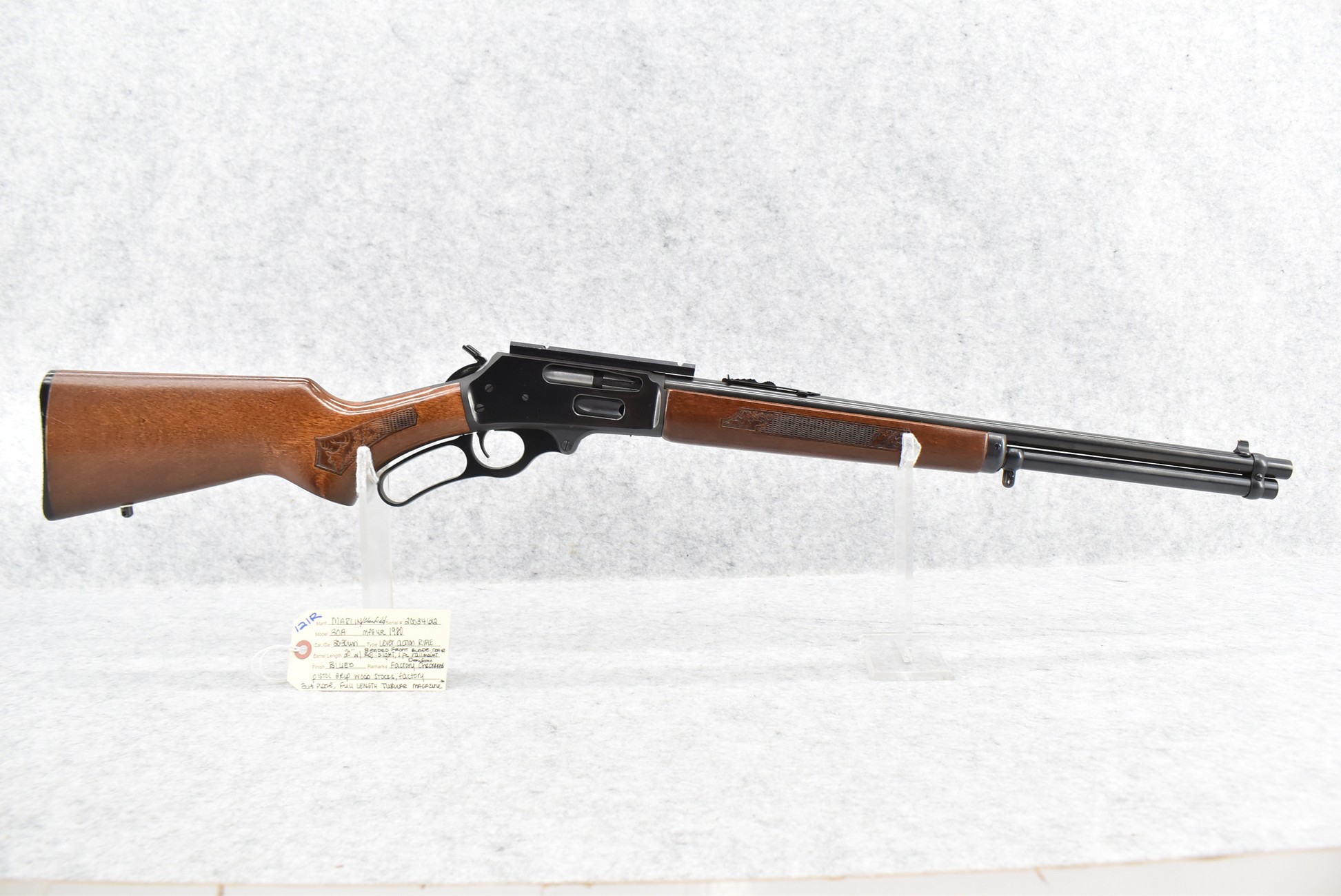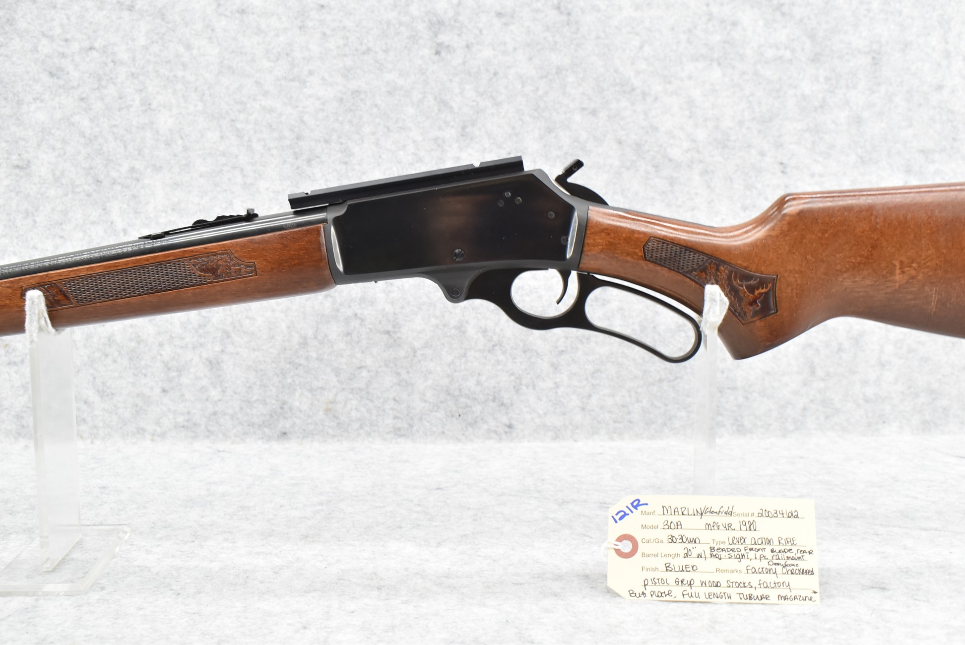 121R. Marlin-Glenfield – Mod. 30A – 30-30 Win. Cal. Lever Action Rifle – w/20” Barrel w/Beaded Blade Front and Adjustable Rear Sights – Blued Finish – w/Factory Deer Scene Checkered Pistol Grip Wood Stocks w/Factory Butt Plate – w/Full Length Tubular Magazine – w/1-Piece Rail Mount – w/Hammer Extension