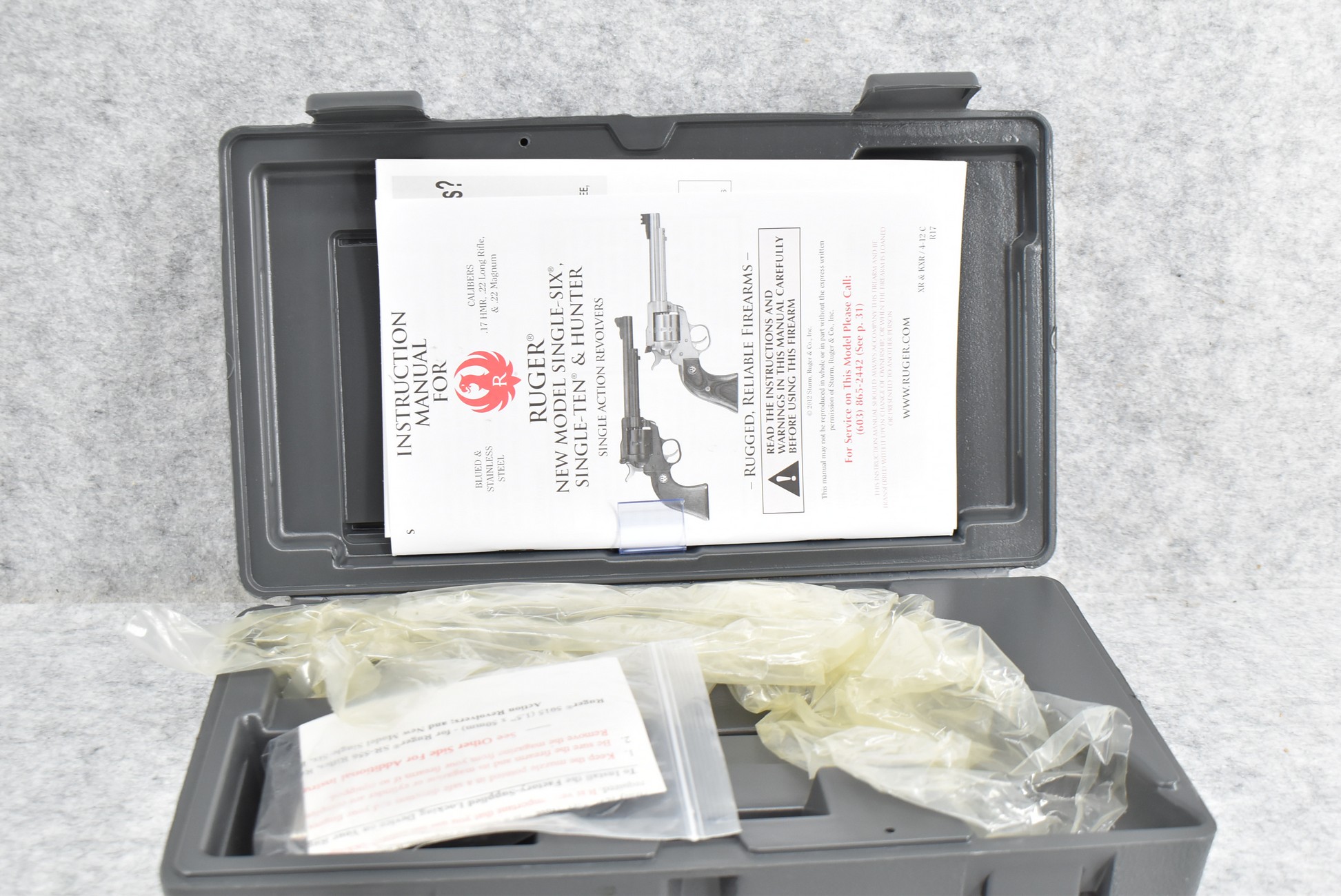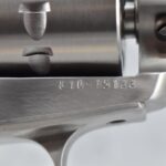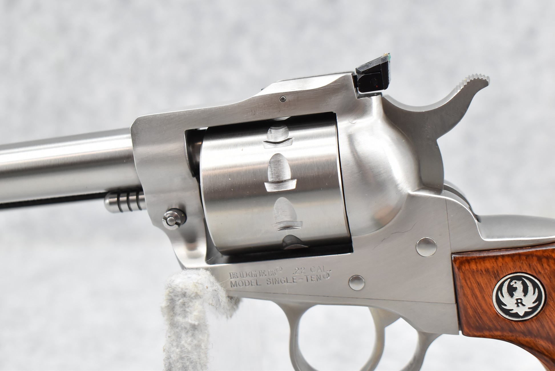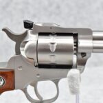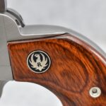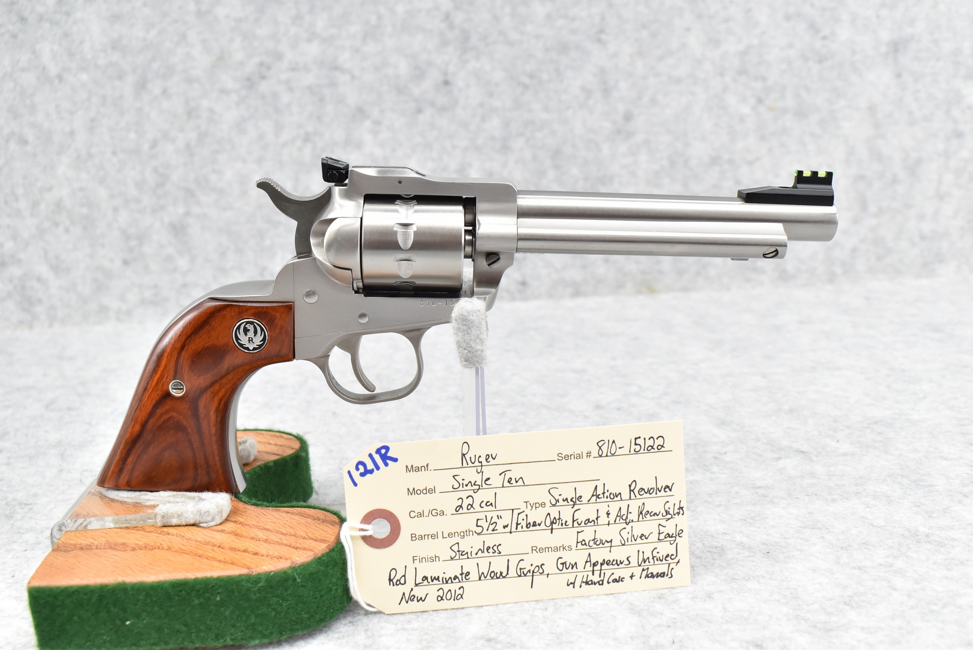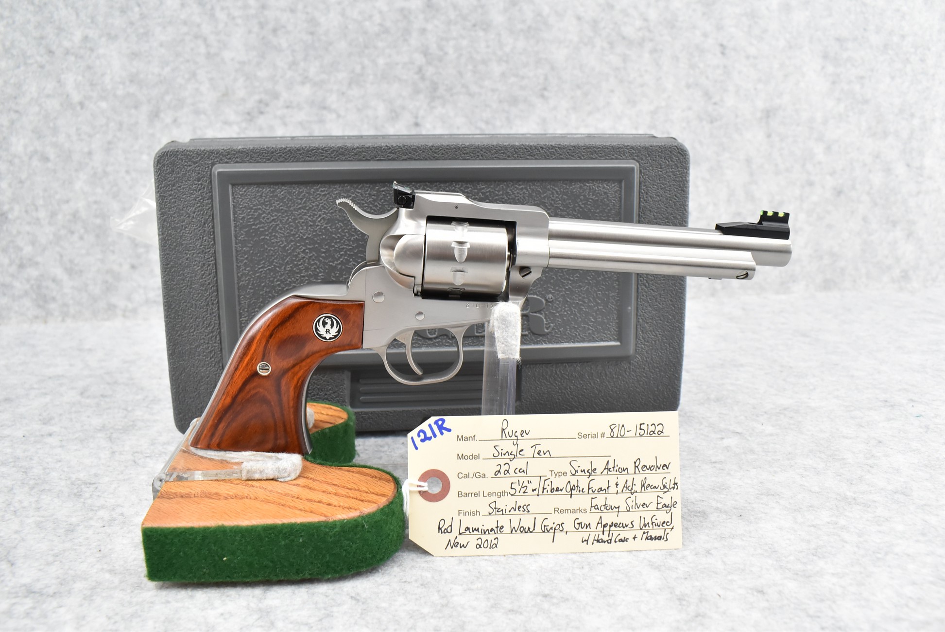 121R. Ruger – Mod. Single Ten – 22 Cal. Single Action Revolver – w/5 ½” Barrel w/Fiber Optic Front & Adj. Rear Sights – Stainless Finish – w/Factory Silver Eagle Red Laminate Wood Grips – Gun Appears Unfired w/Hard Case & Manuals – New for 2012