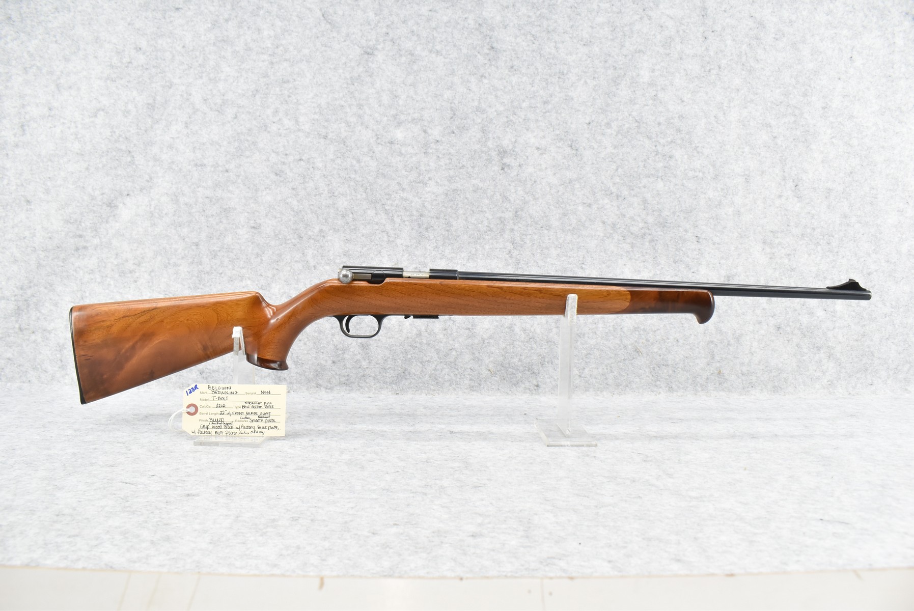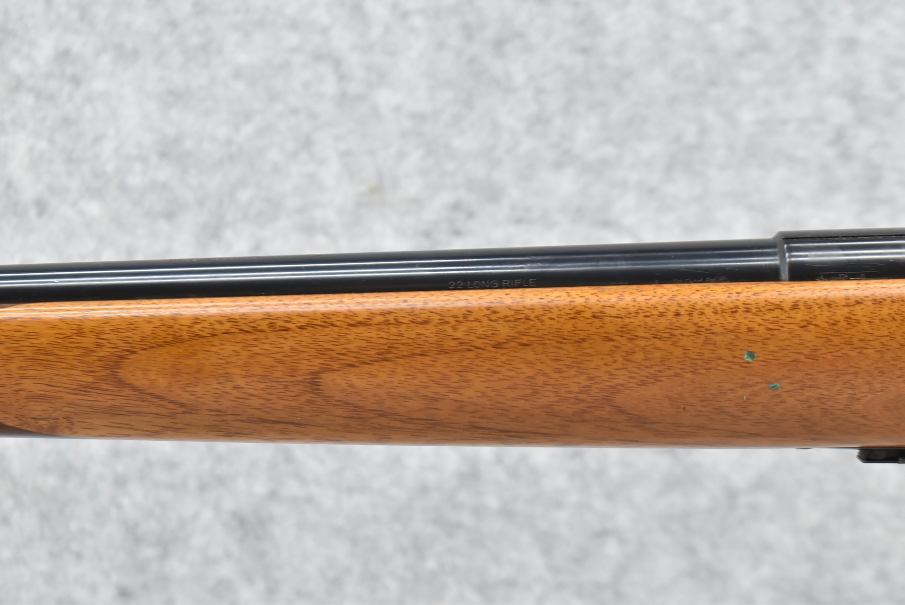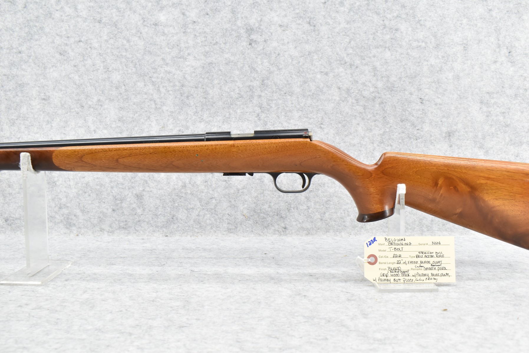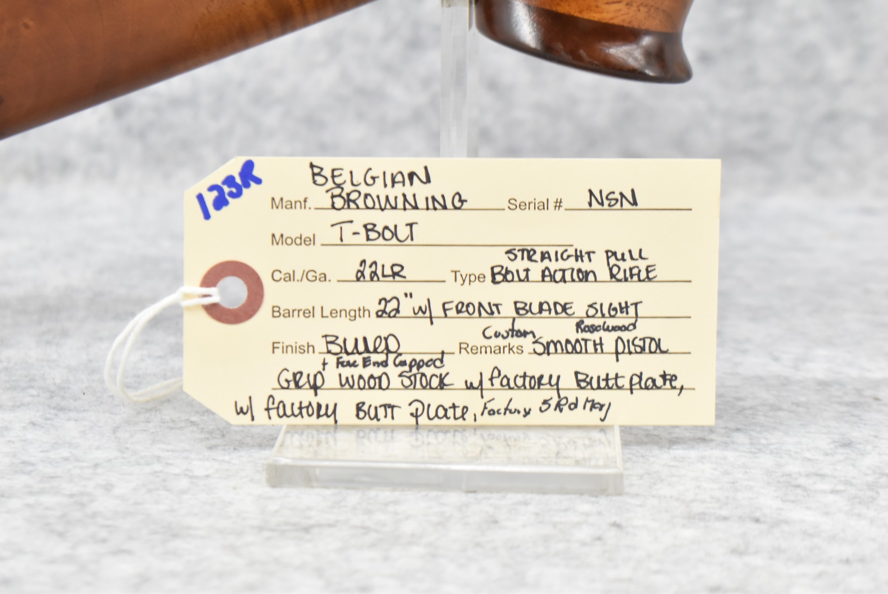 123R. Browning (Belgium) – Mod. T-Bolt – 22LR Cal. Straight Pull Bolt Action Rifle – w/22” Barrel w/Front Blade Sight – Blued Finish – w/Custom Smooth Rosewood Pistol Grip & Forend Capped Wood Stock w/Factory Butt Plate – w/Factory 5Rd Mag