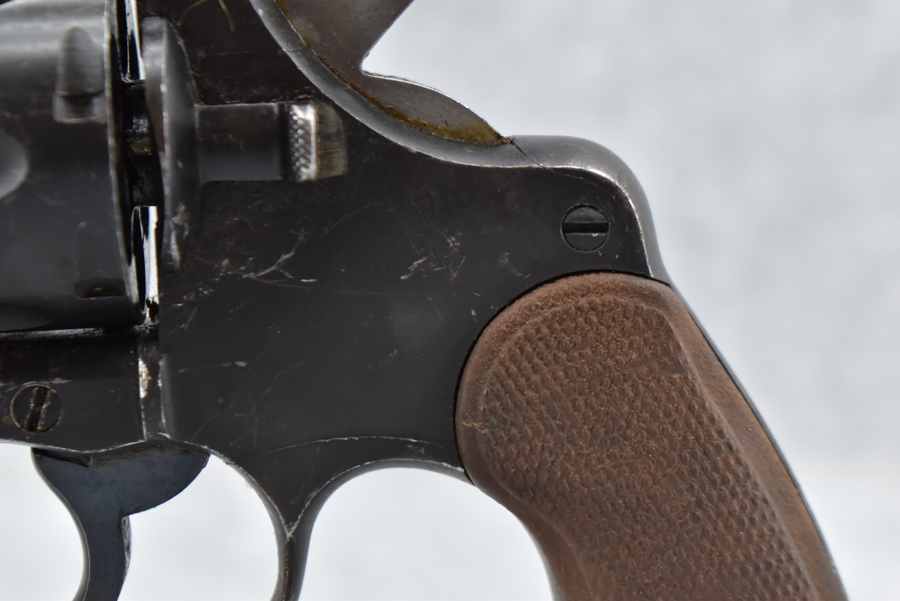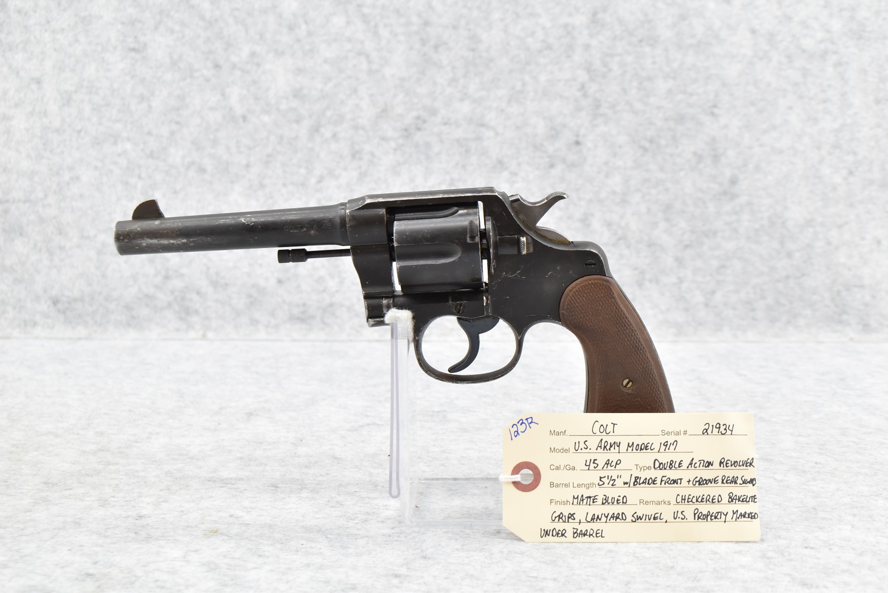 123R. Colt – U.S. Army Model 1917 – 45 ACP Cal. Double Action Revolver – w/5 ½” Barrel w/Blade Front & Groove Rear Sights – Matte Blued Finish – w/Checkered Bakelite Grips – w/Lanyard Swivel – U.S. Property Marked Under Barrel