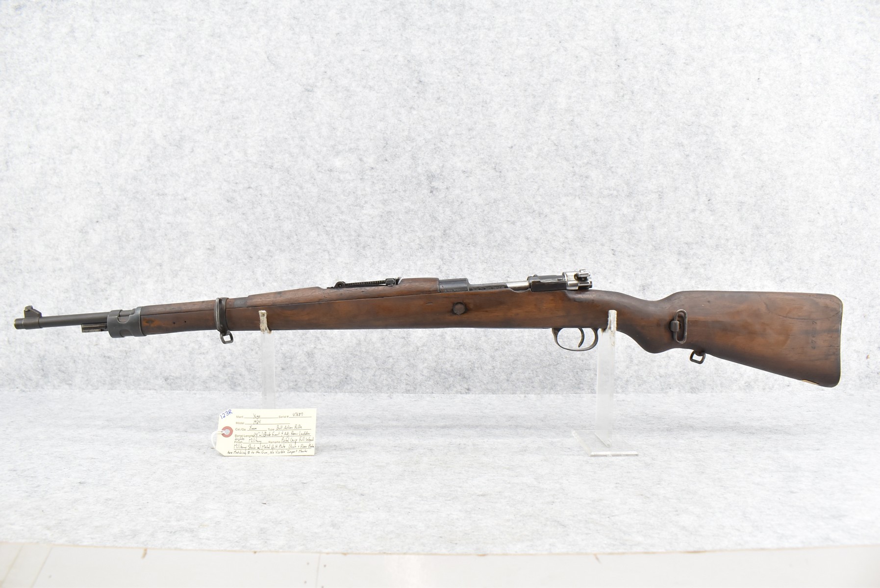 123R. Yugo – Mod. 1924 – 8mm Cal. Bolt Action Rifle – w/24” Barrel w/Blade Front & Adj. Rear Ladder Sights – Military Finish – w/Pistol Grip Full Wood Military Stock w/Metal Butt Plate – Stock & Floor Plate Are Matching # to the Gun – No Visible Import Marks