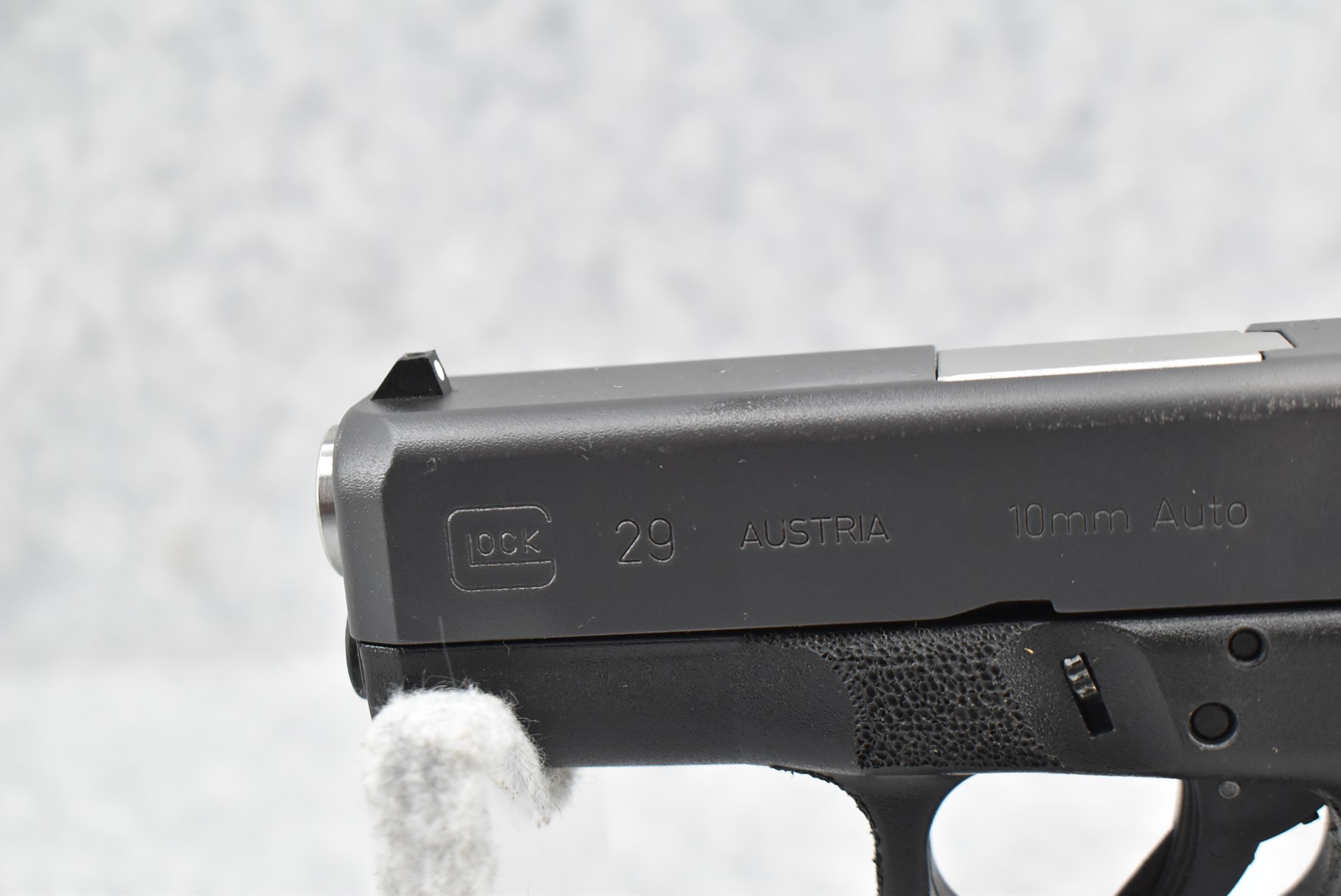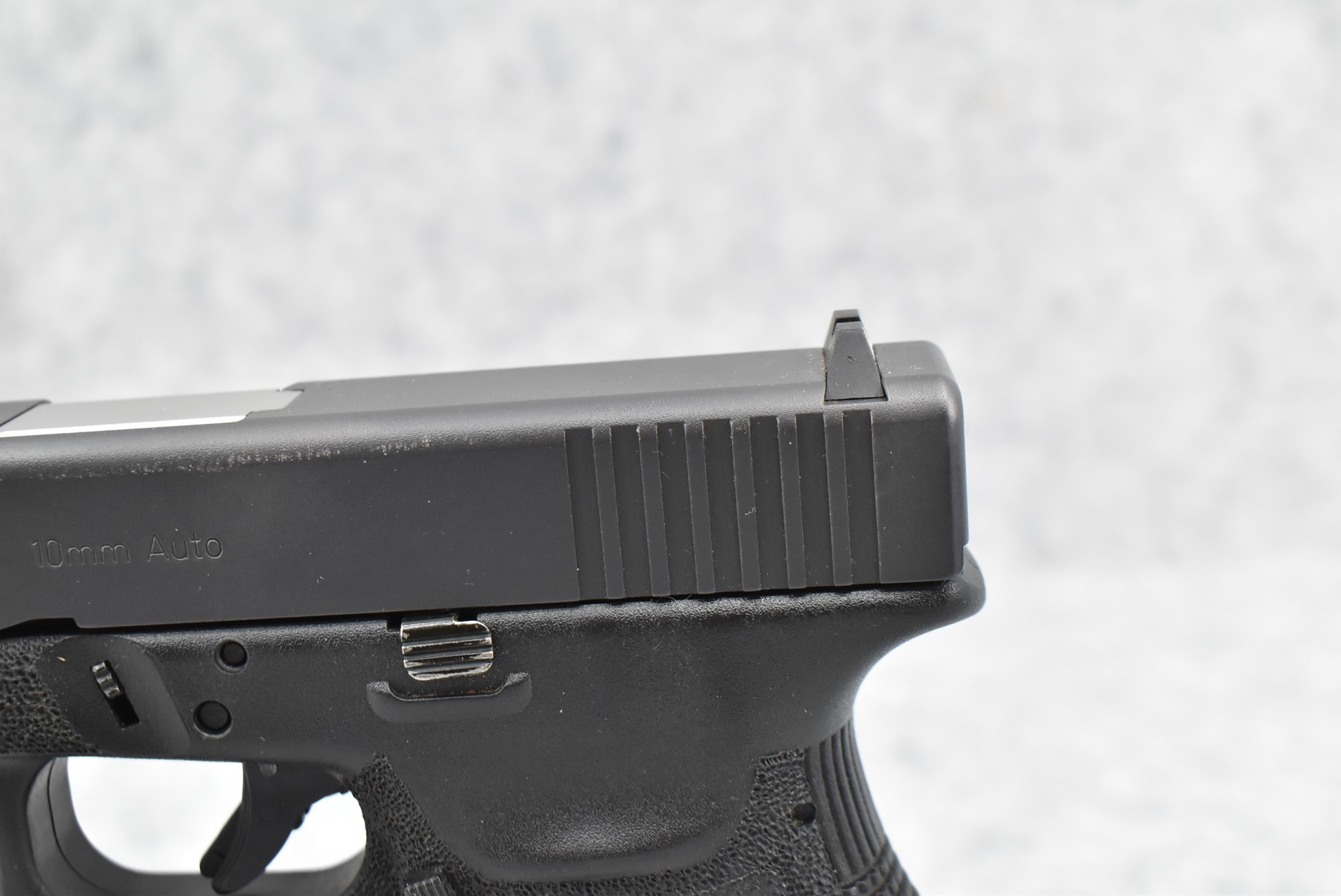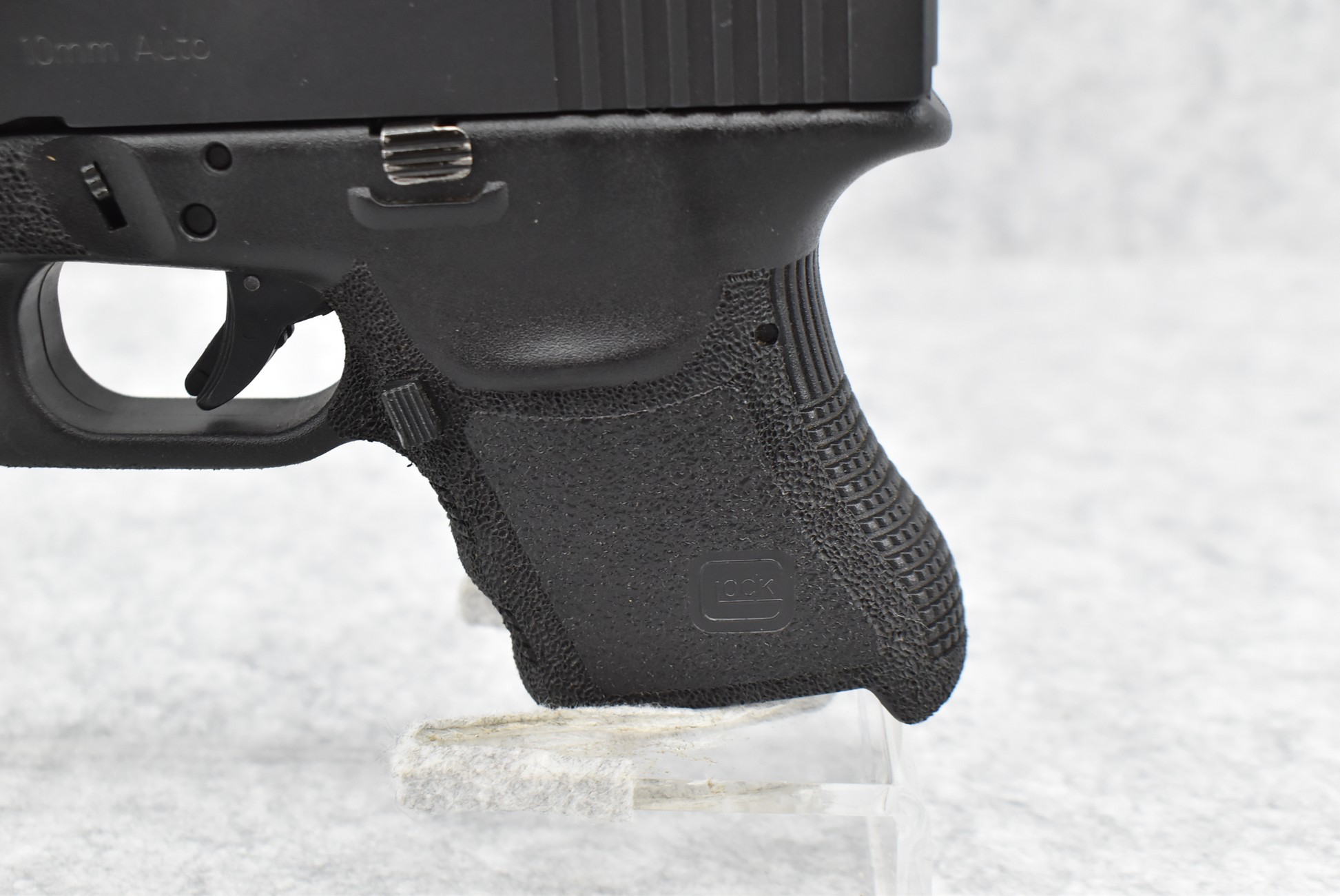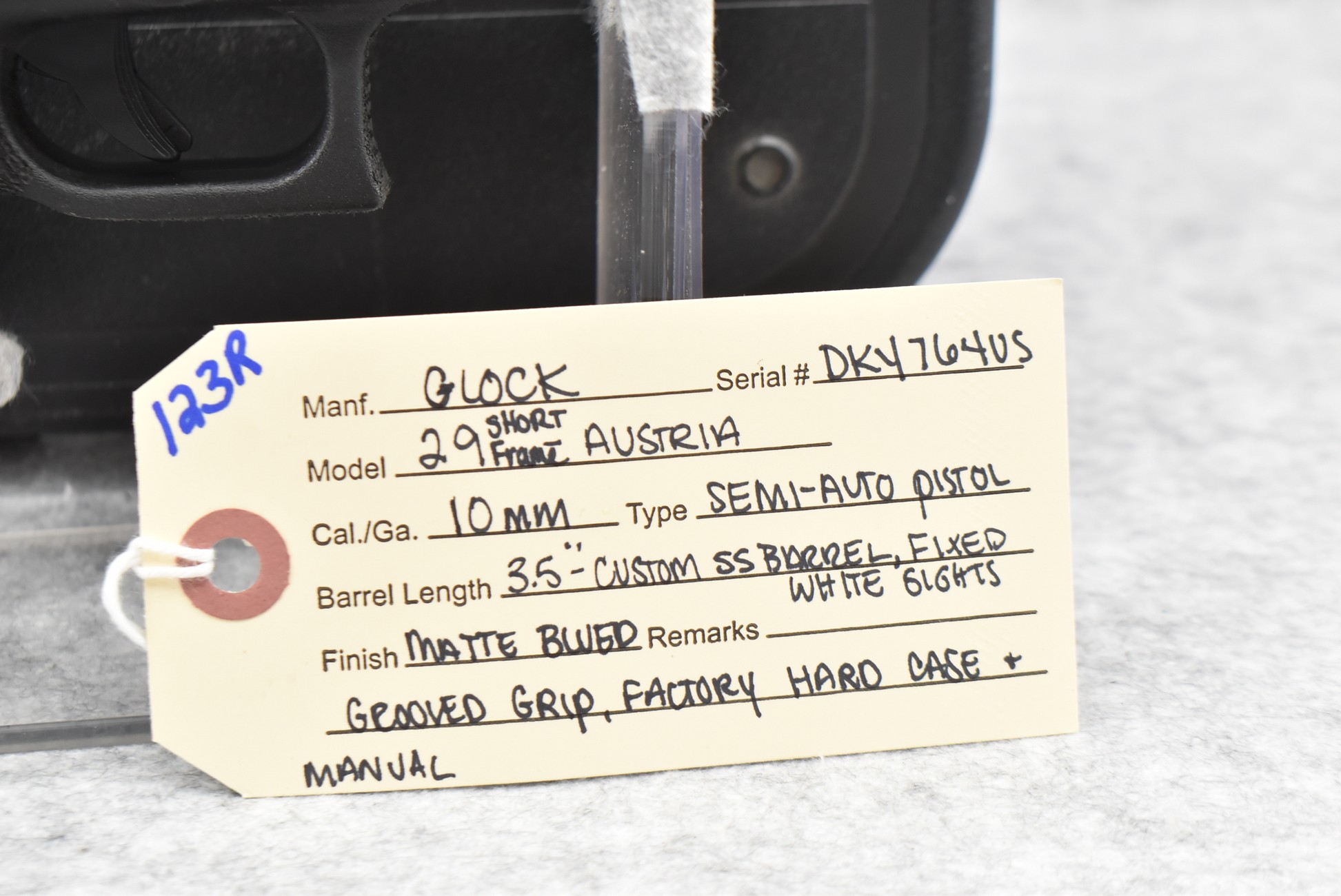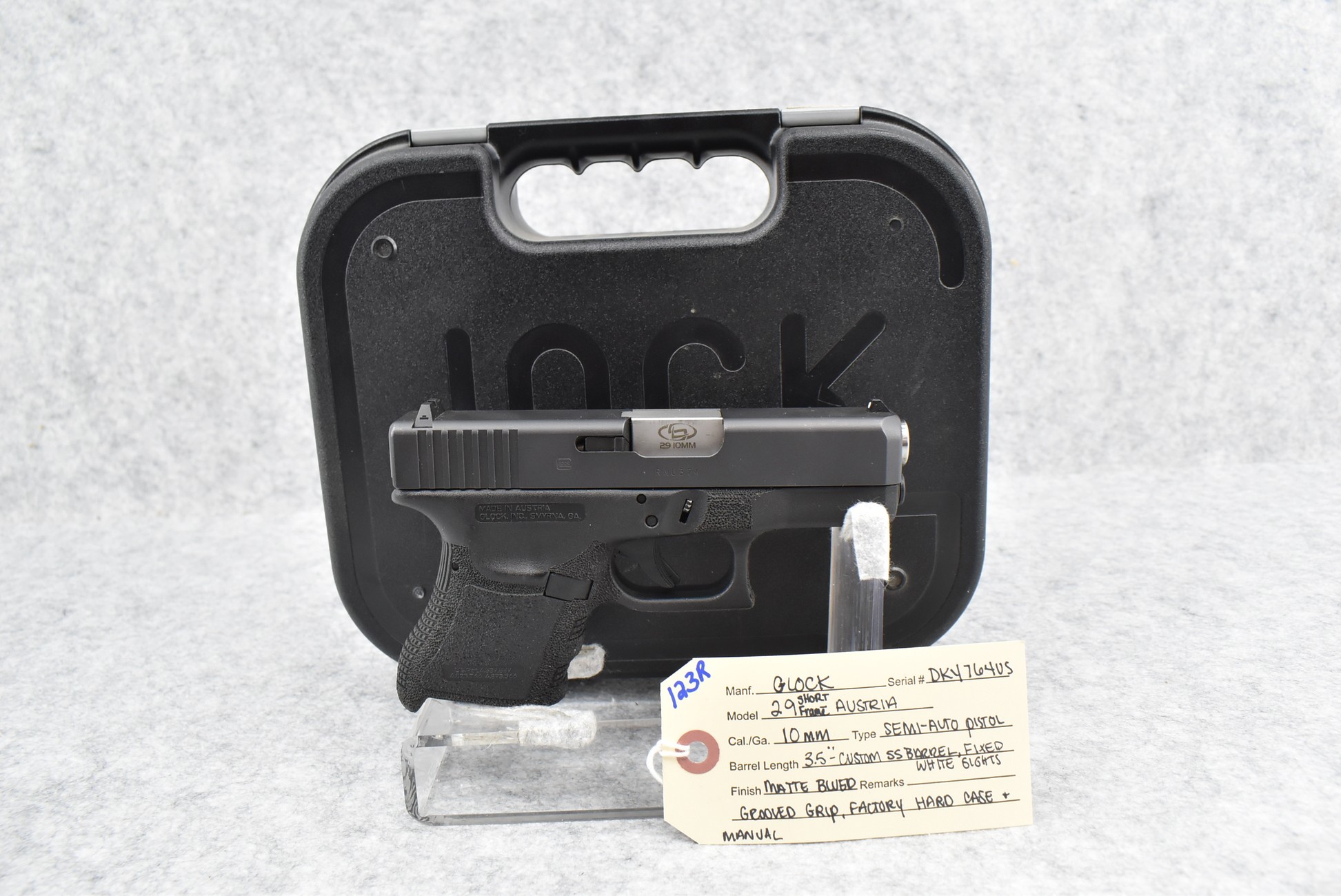 123R. Glock – Mod. 28 Short Frame – 10mm Cal. Semi-Auto Pistol – w/3.5” Custom Stainless Steel Barrel w/Fixed White Sights – Matte Blued Finish – w/Grooved Grip – w/Factory Hard Case & Manual – No Mag Currently
