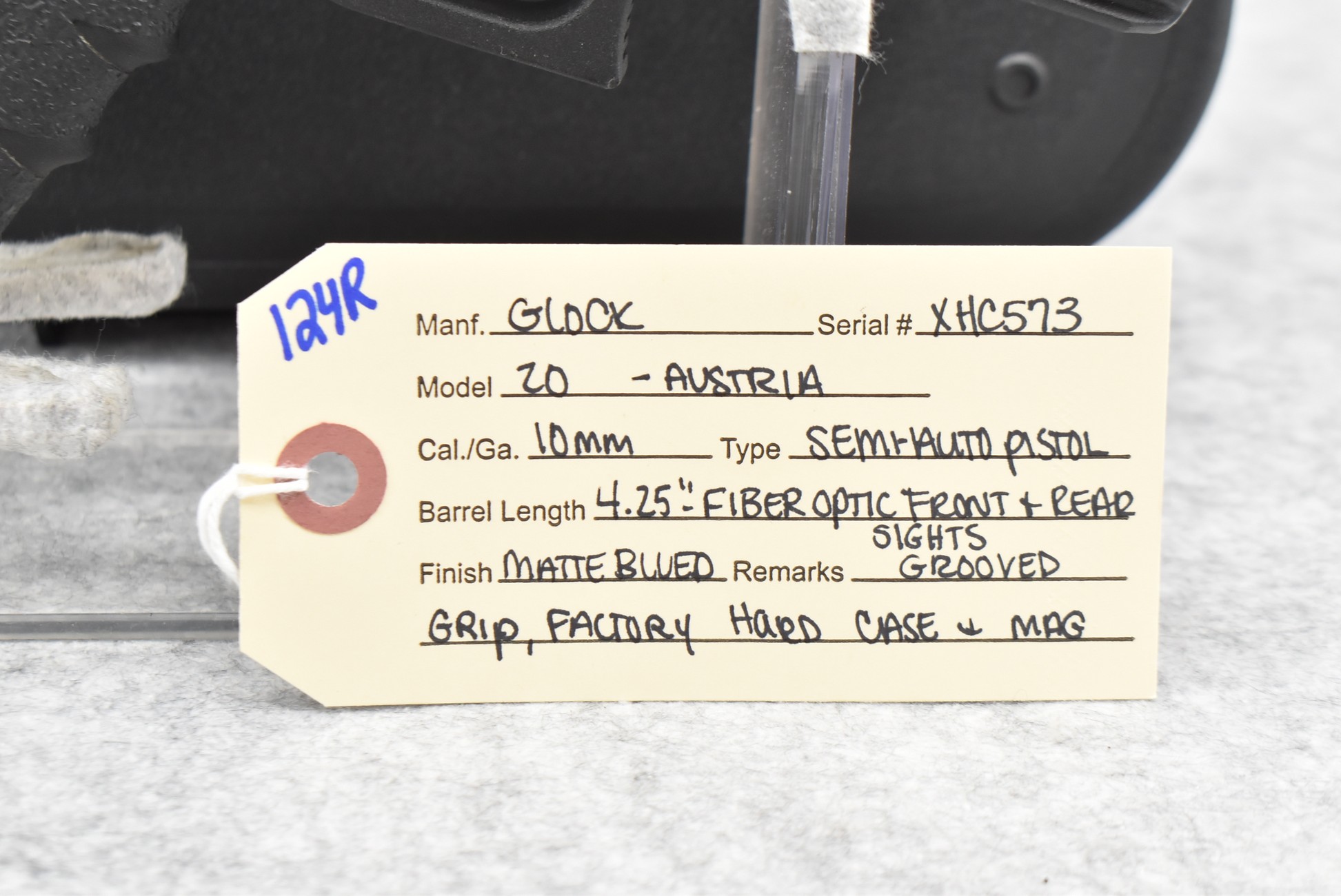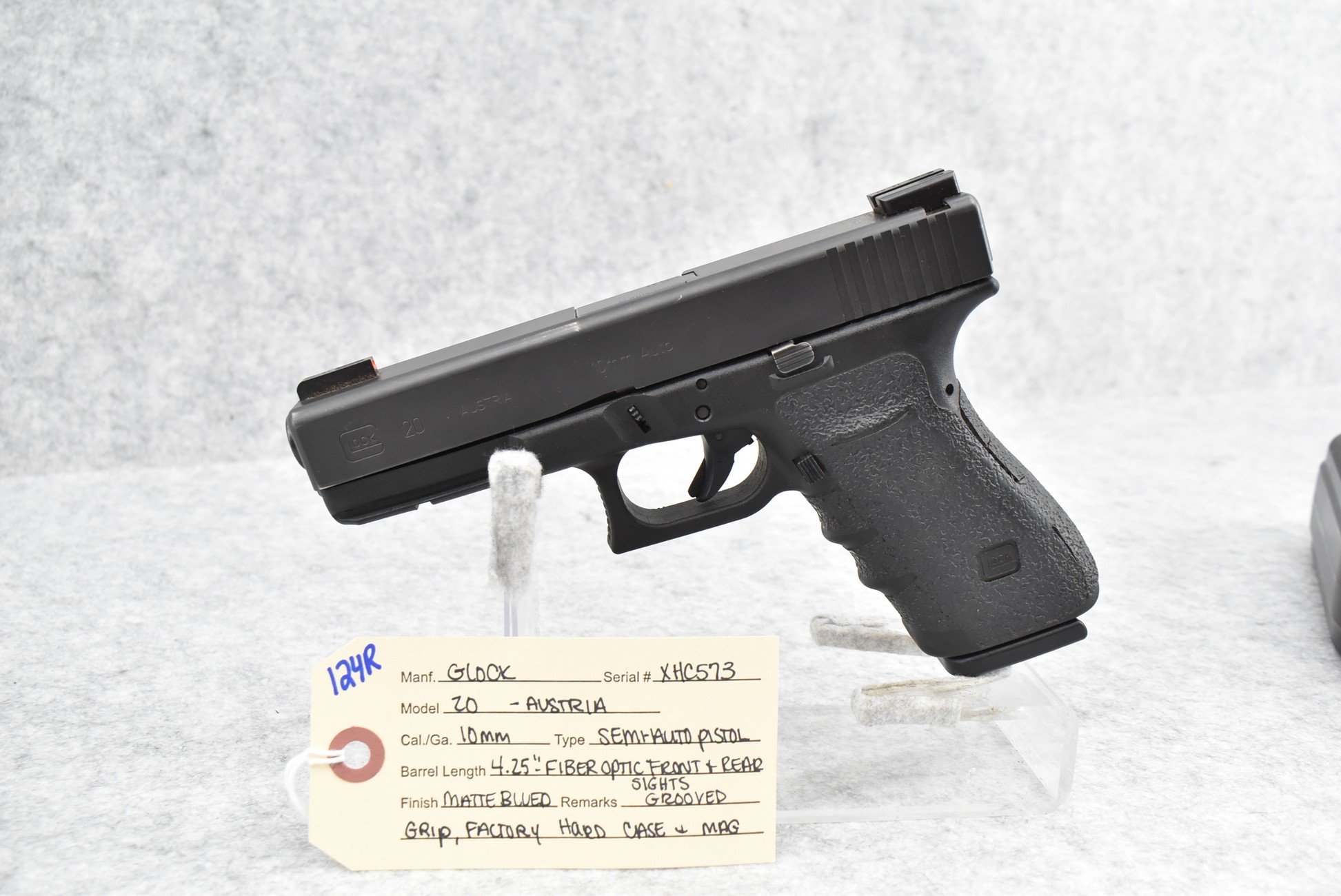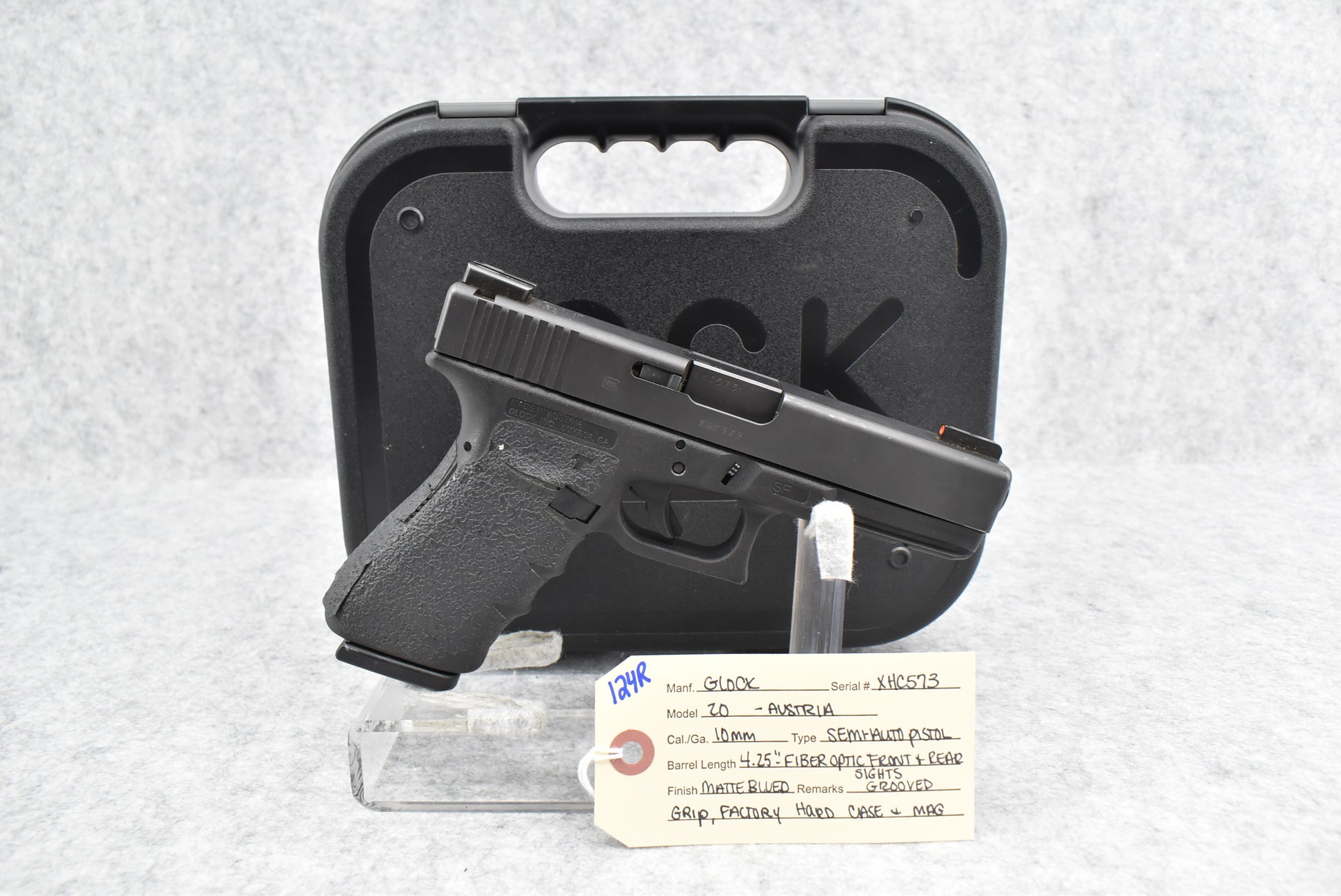 124R. Glock – Mod. 20 – 10mm Cal. Semi-Auto Pistol – w/4.25” Barrel w/Fiber Optic Front & Rear Sights – Matte Blued Finish – w/Grooved Grip – w/Factory Hard Case & Mag