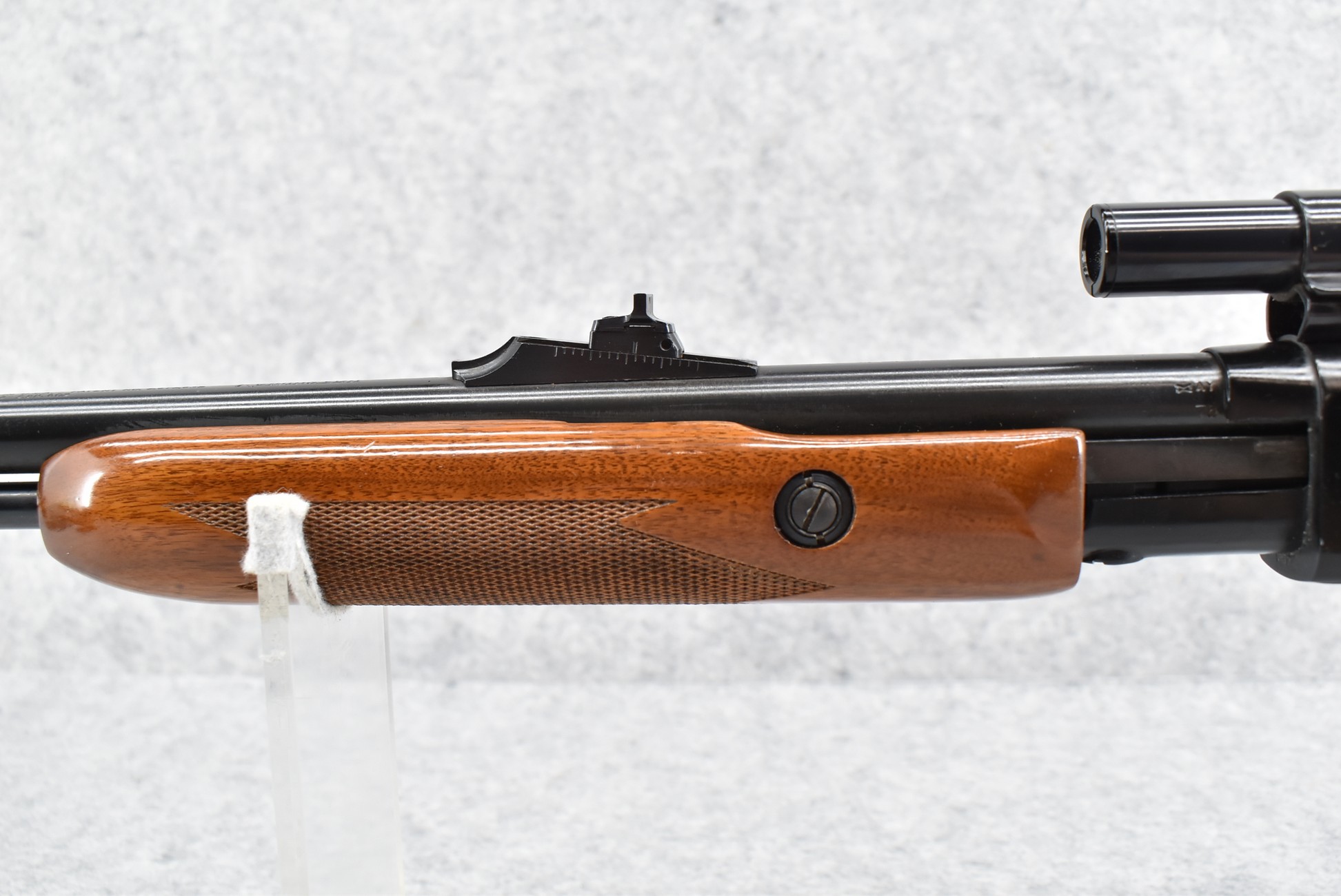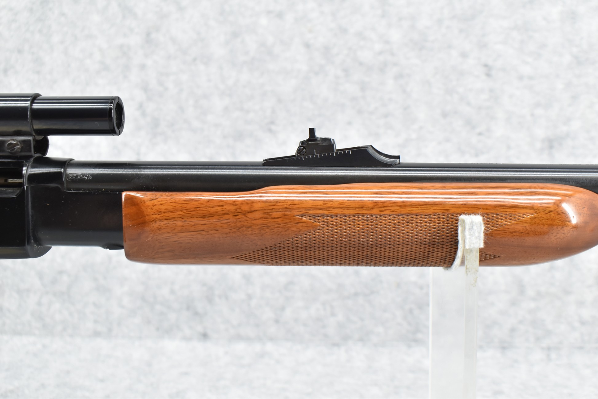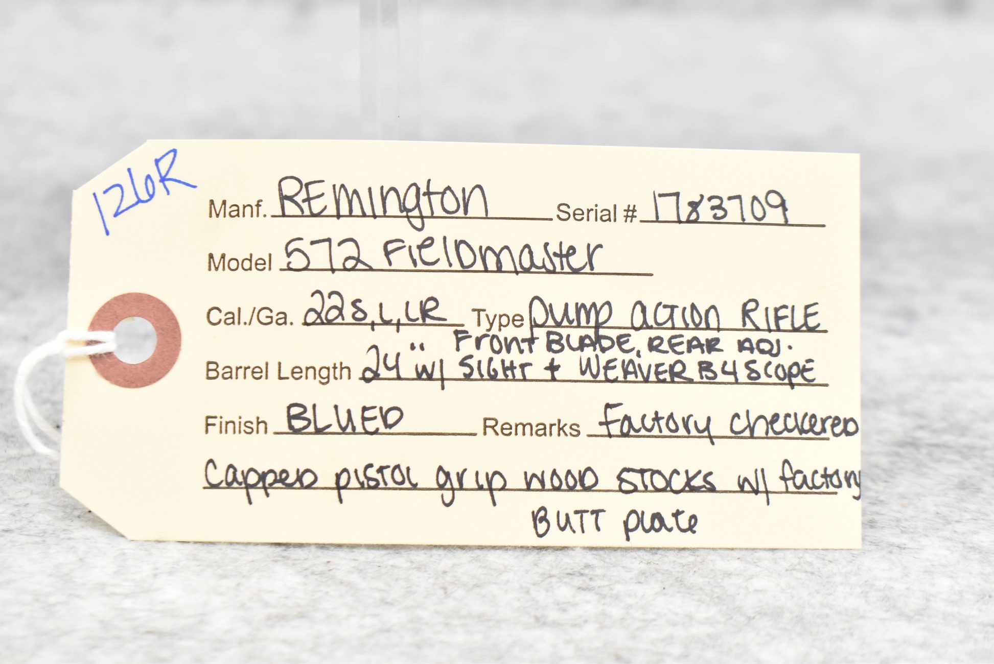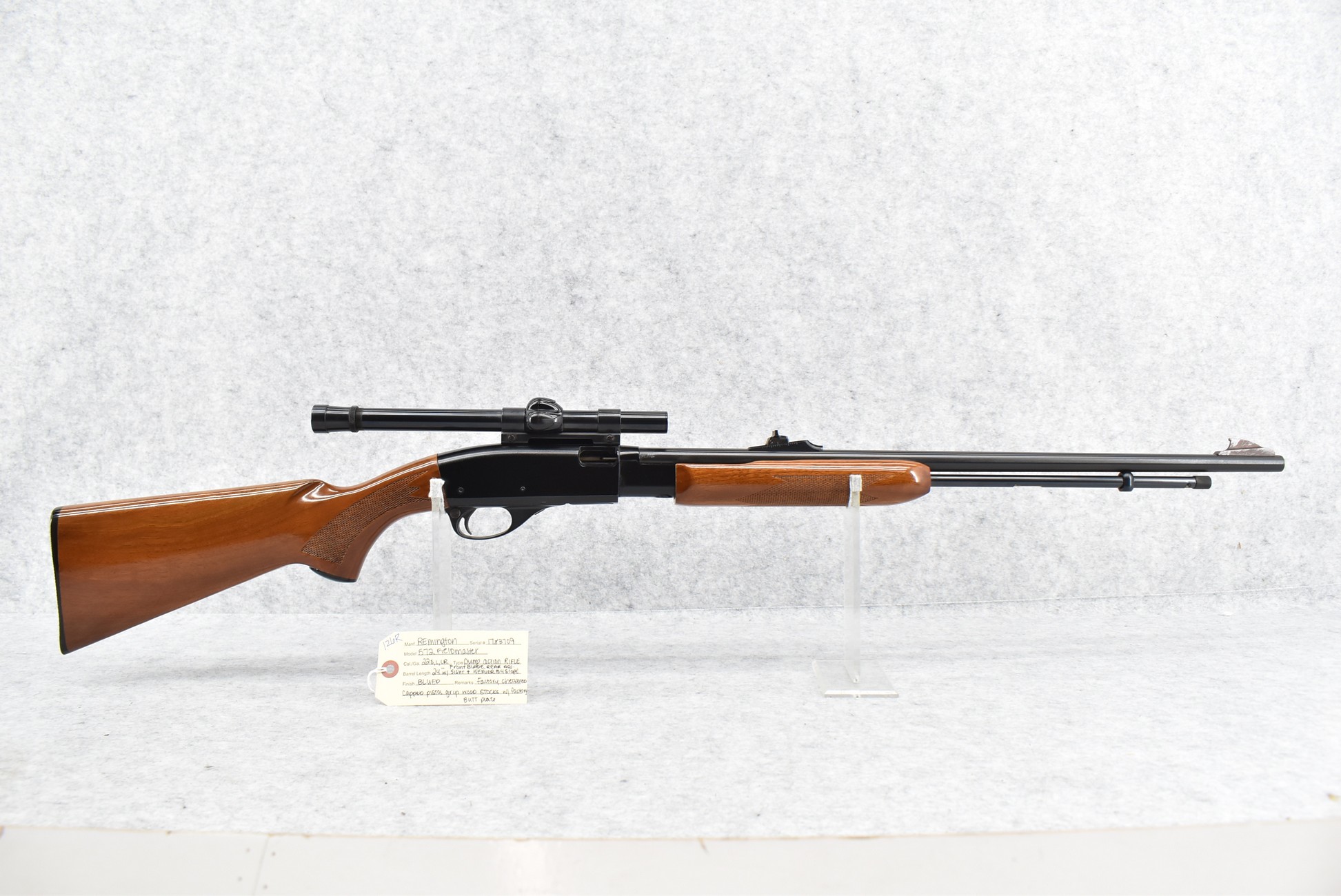 126R. Remington – Mod. 572 Fieldmaster – 22 Cal. Pump Action Rifle – w/24” Barrel w/Front Blade & Rear Adj. Sights – Blued Finish – w/Factory Checkered Capped Pistol Grip Wood Stocks w/Factory Butt Plate – w/Weaver B4 Scope