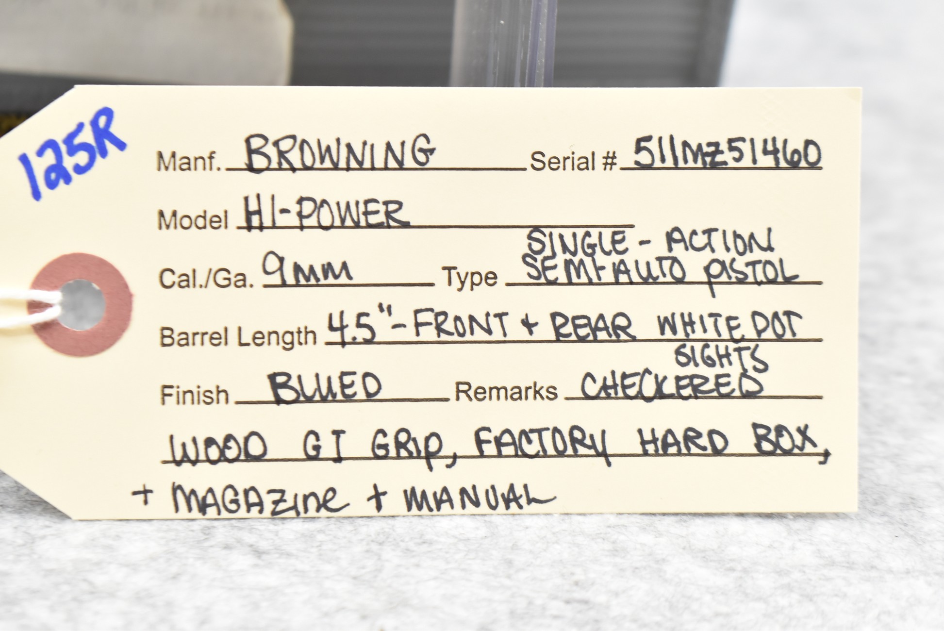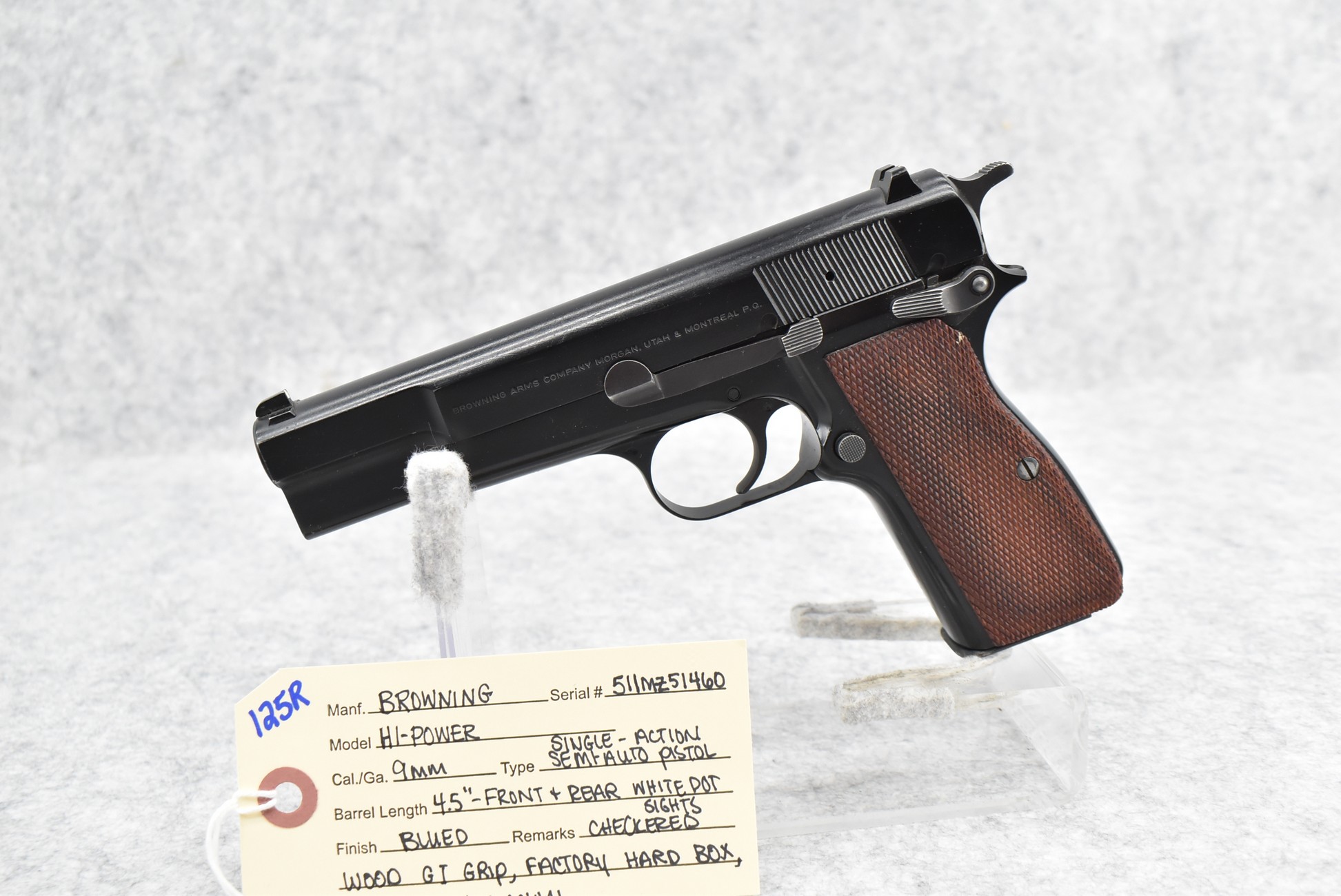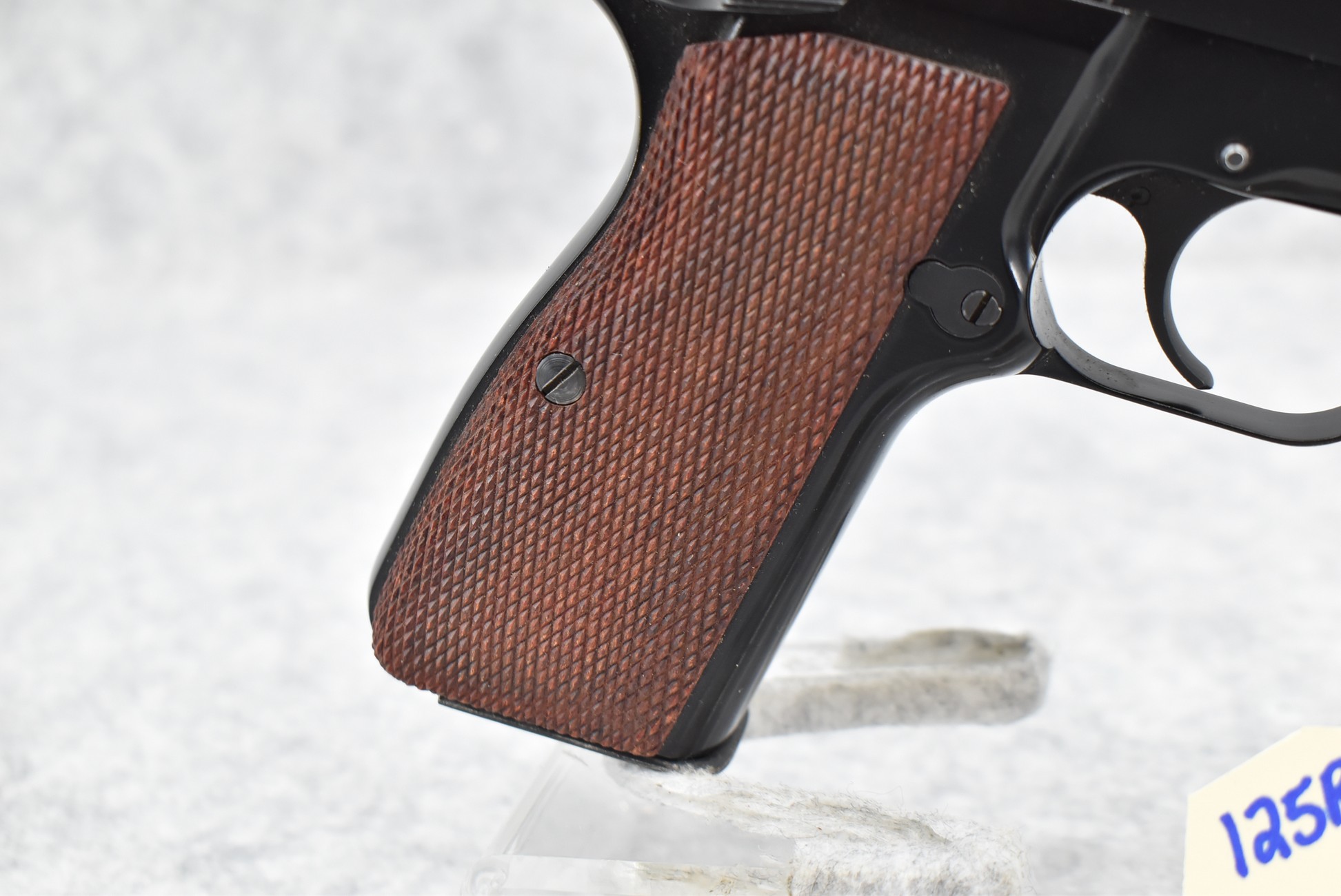 125R. Browning – Mod. Hi-Power – 9mm Cal. Semi-Auto Pistol – w/4.5” Barrel w/Front & Rear White Dot Sights – Blued Finish – w/Checkered Wood GI Grip – w/Factory Hard Case, Magazine & Manual