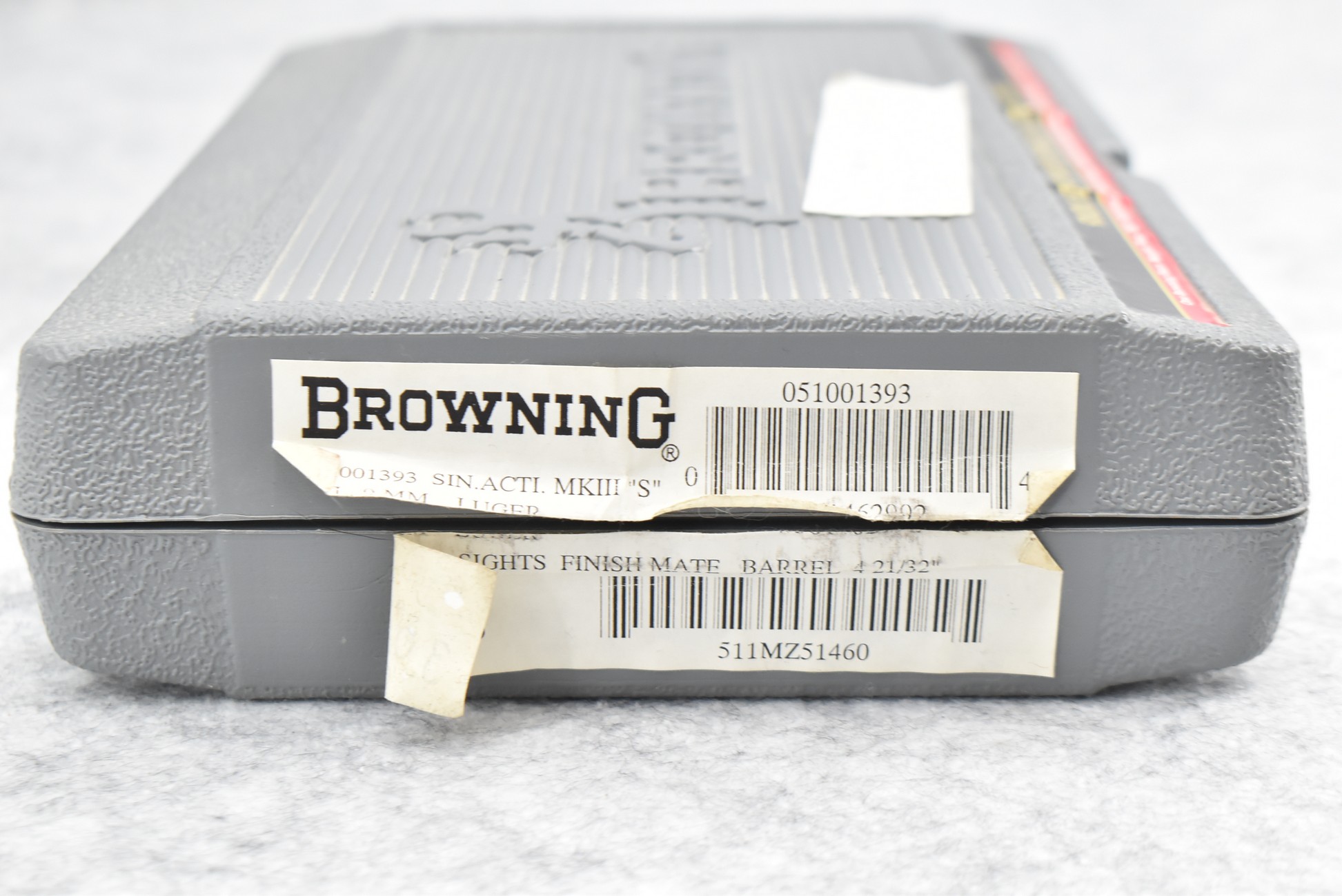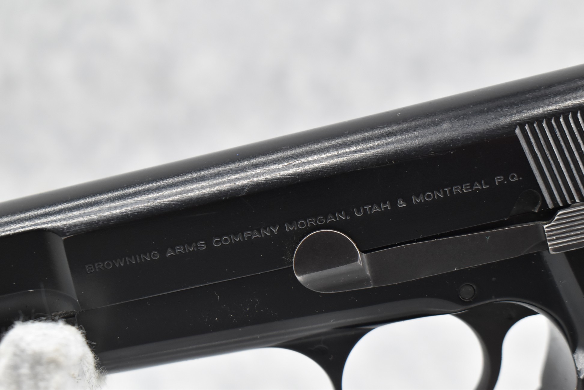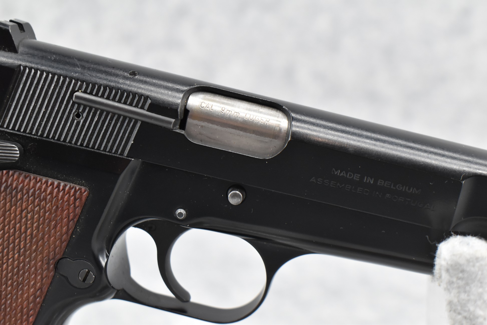 125R. Browning – Mod. Hi-Power – 9mm Cal. Semi-Auto Pistol – w/4.5” Barrel w/Front & Rear White Dot Sights – Blued Finish – w/Checkered Wood GI Grip – w/Factory Hard Case, Magazine & Manual