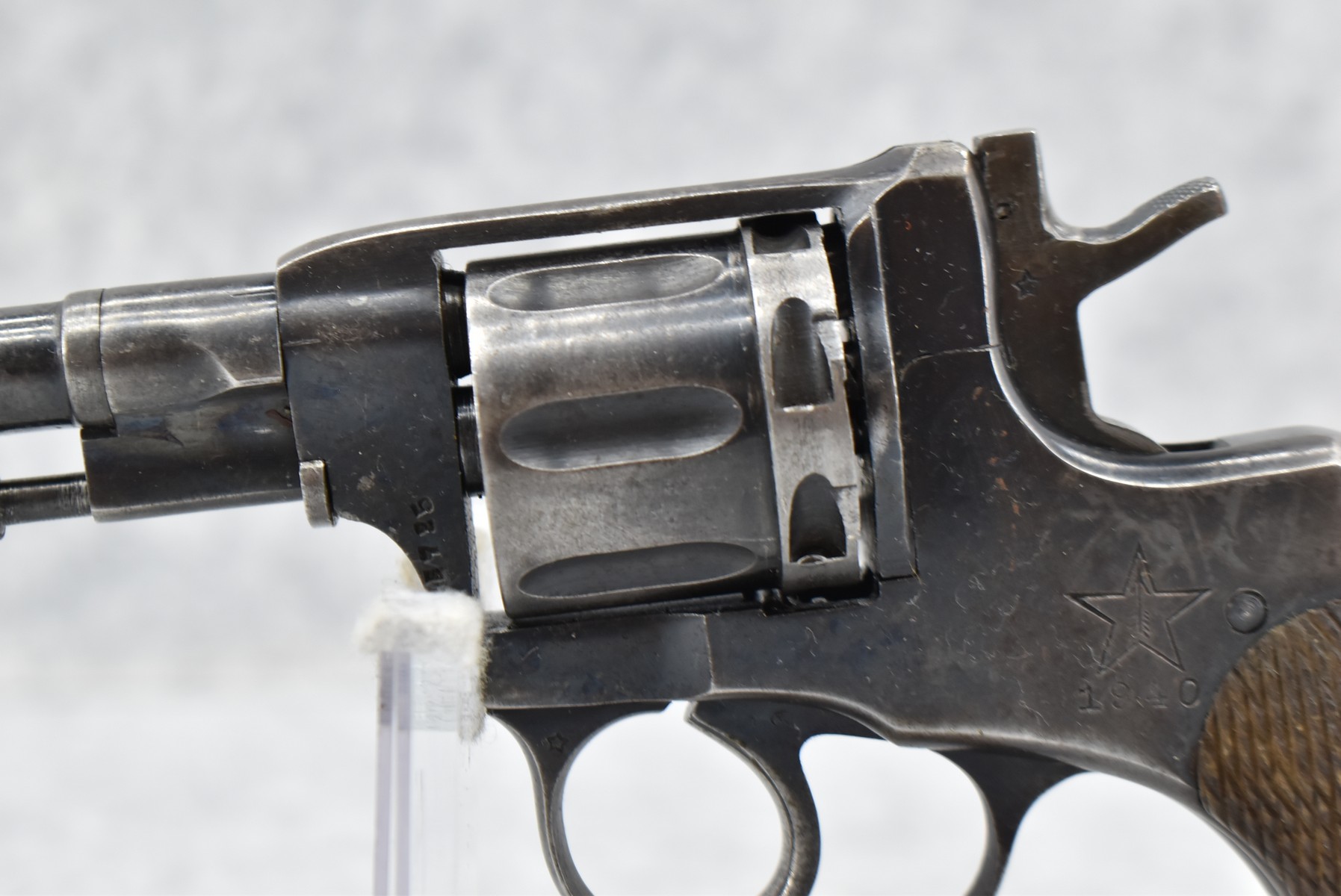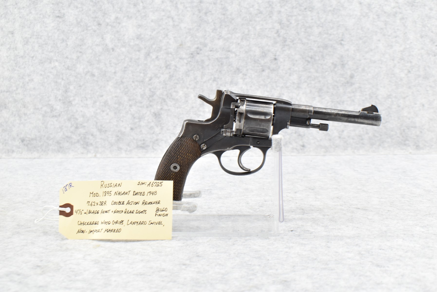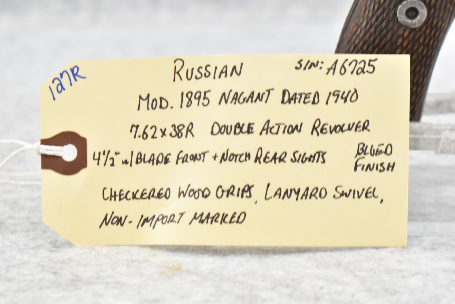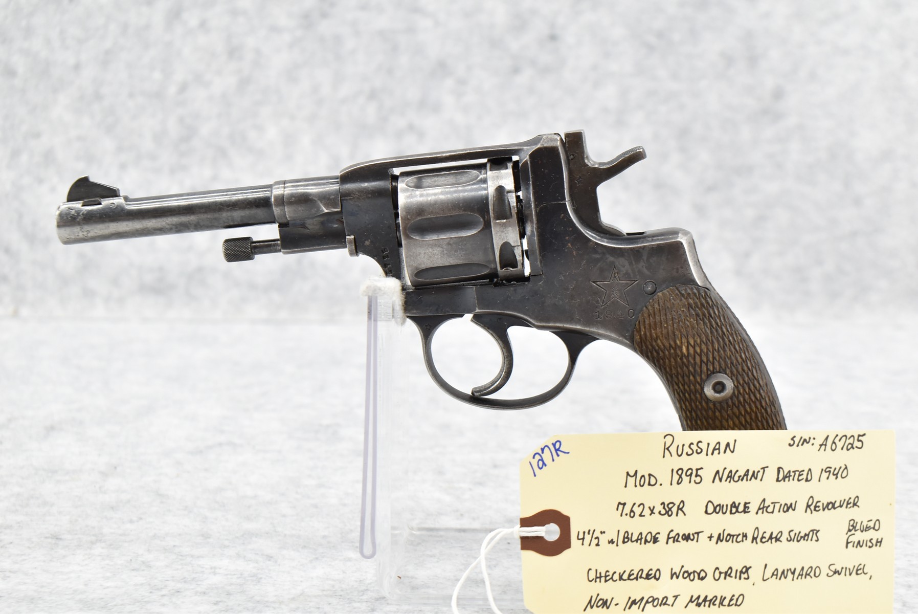 127R. Russian – Mod. 1895 Nagant – Dated 1940 – 7.62x38R Cal. Double Action Revolver – w/4 ½” Barrel w/Blade Front & Notch Rear Sights – Blued Finish – w/Checkered Wood Grips – w/Lanyard Swivel – Non-Import Marked