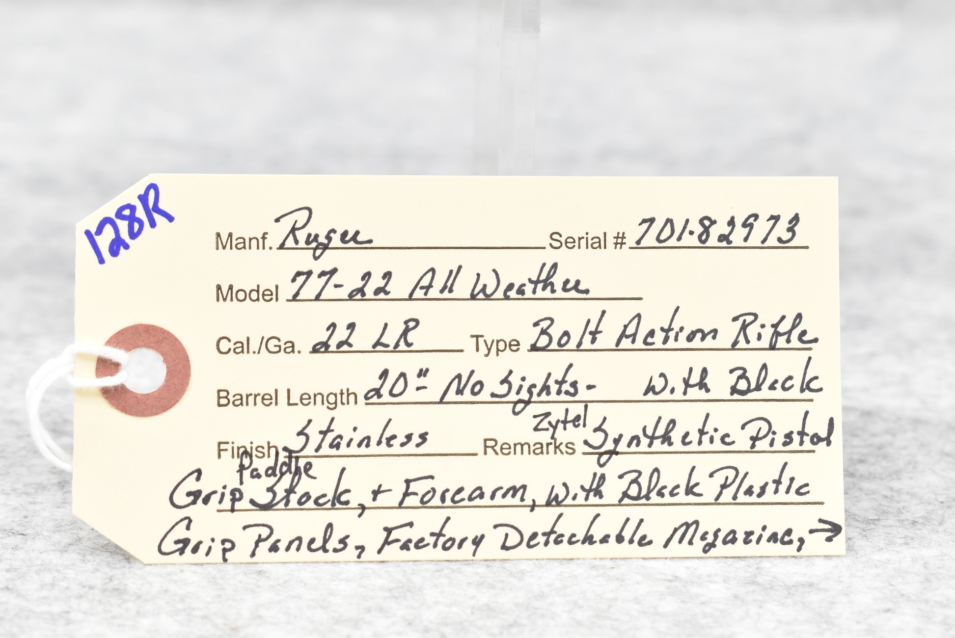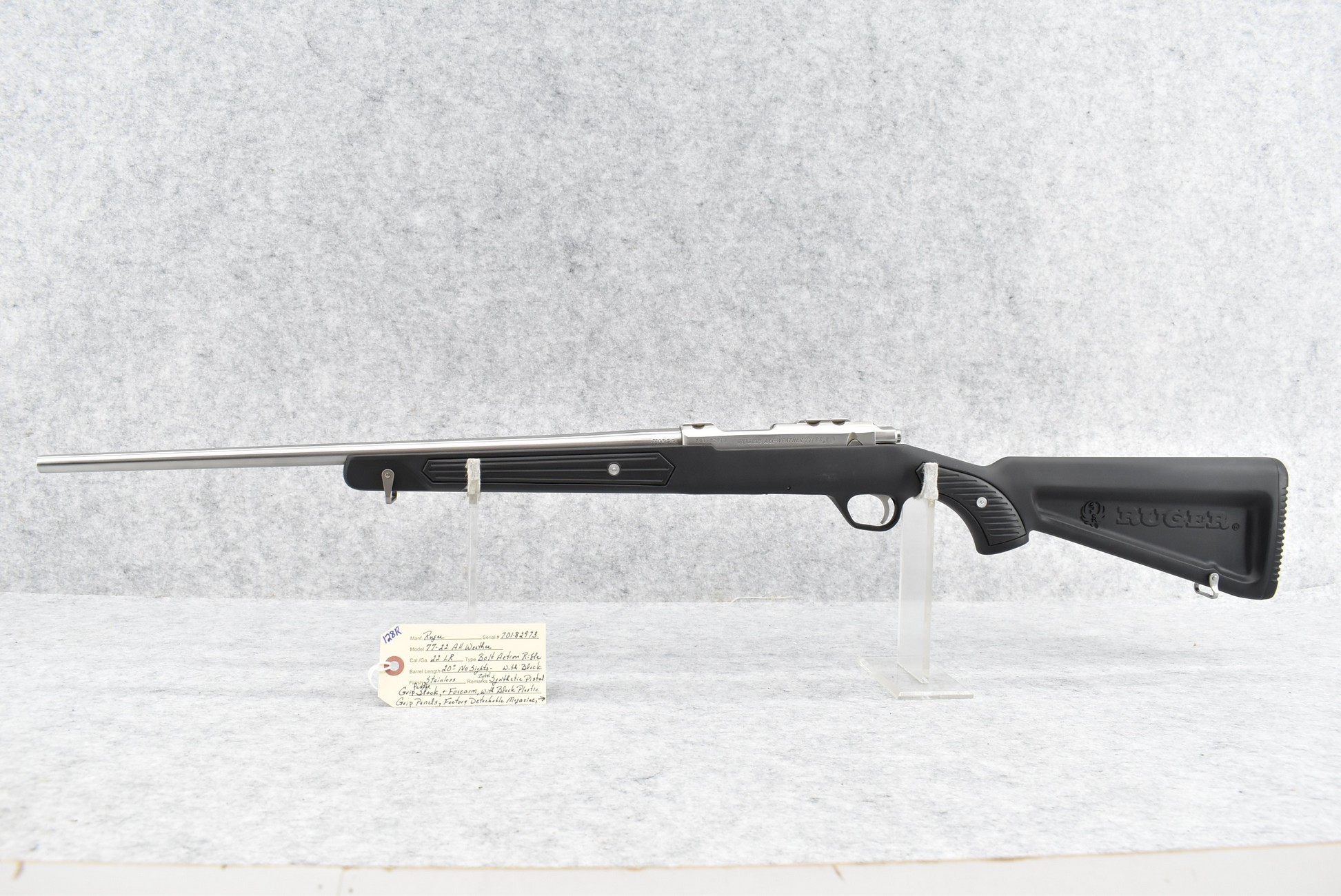 128R. Ruger – Mod. 77-22 All Weather – 22LR Cal. Bolt Action Rifle – w/20” Barrel – Stainless Finish – w/Black Zytel Synthetic Pistol Grip Paddle Stocks w/Black Plastic Grip Panels – w/Detachable Magazine w/Butt Pad