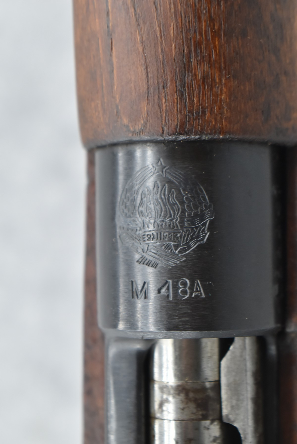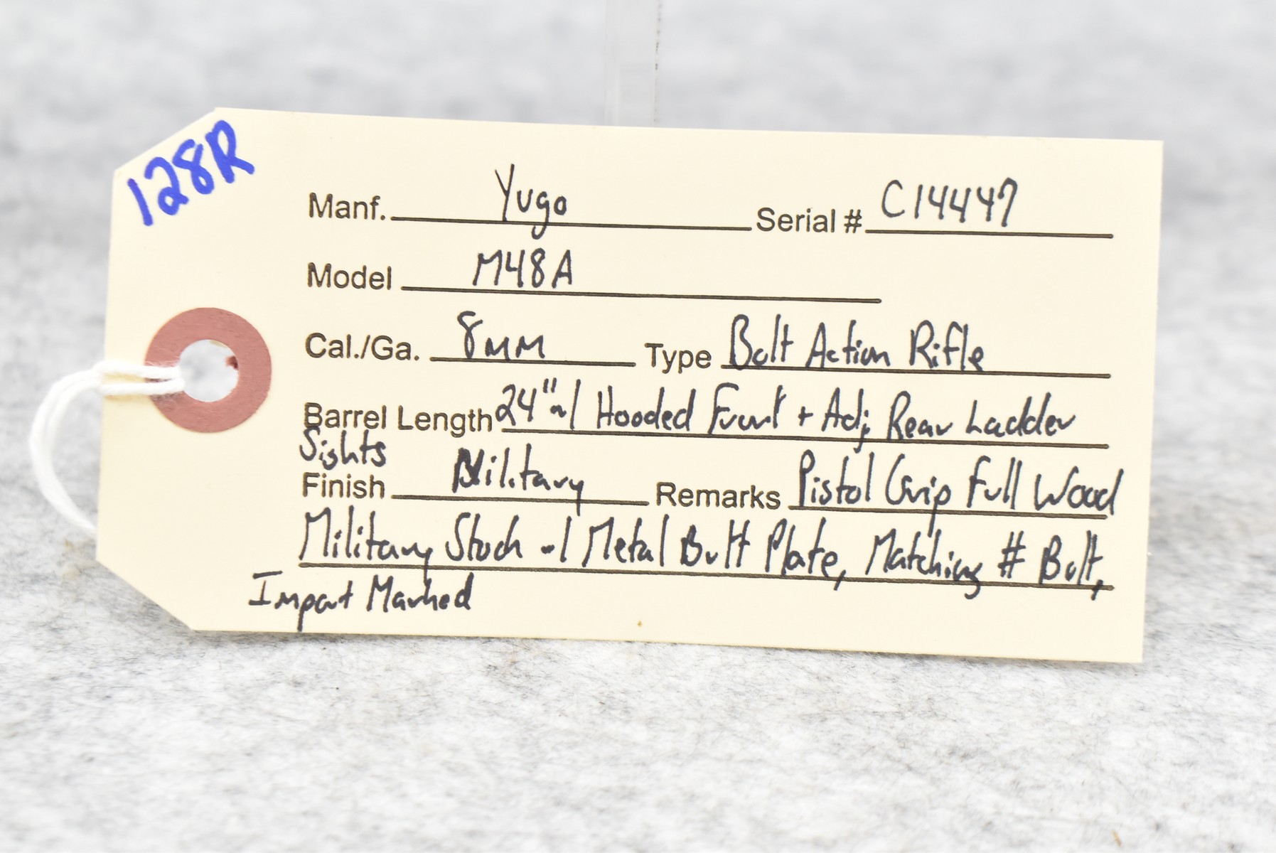 128R. Yugo – Mod. M48A – 8mm Cal. Bolt Action Rifle – w/24” Barrel w/Hooded Front & Adj. Rear Ladder Sights – Military Finish – w/Pistol Grip Full Wood Military Stock w/Metal Butt Plate – w/Matching # Bolt – Import Marked