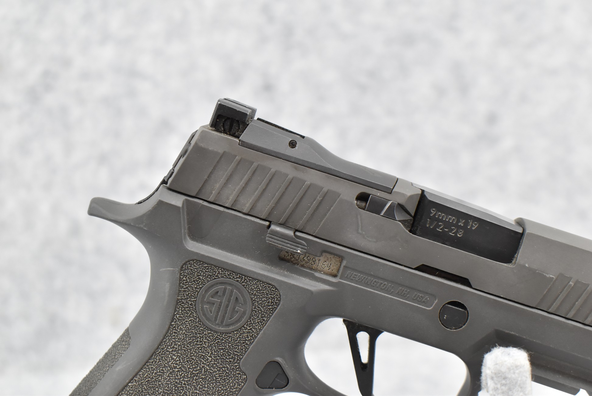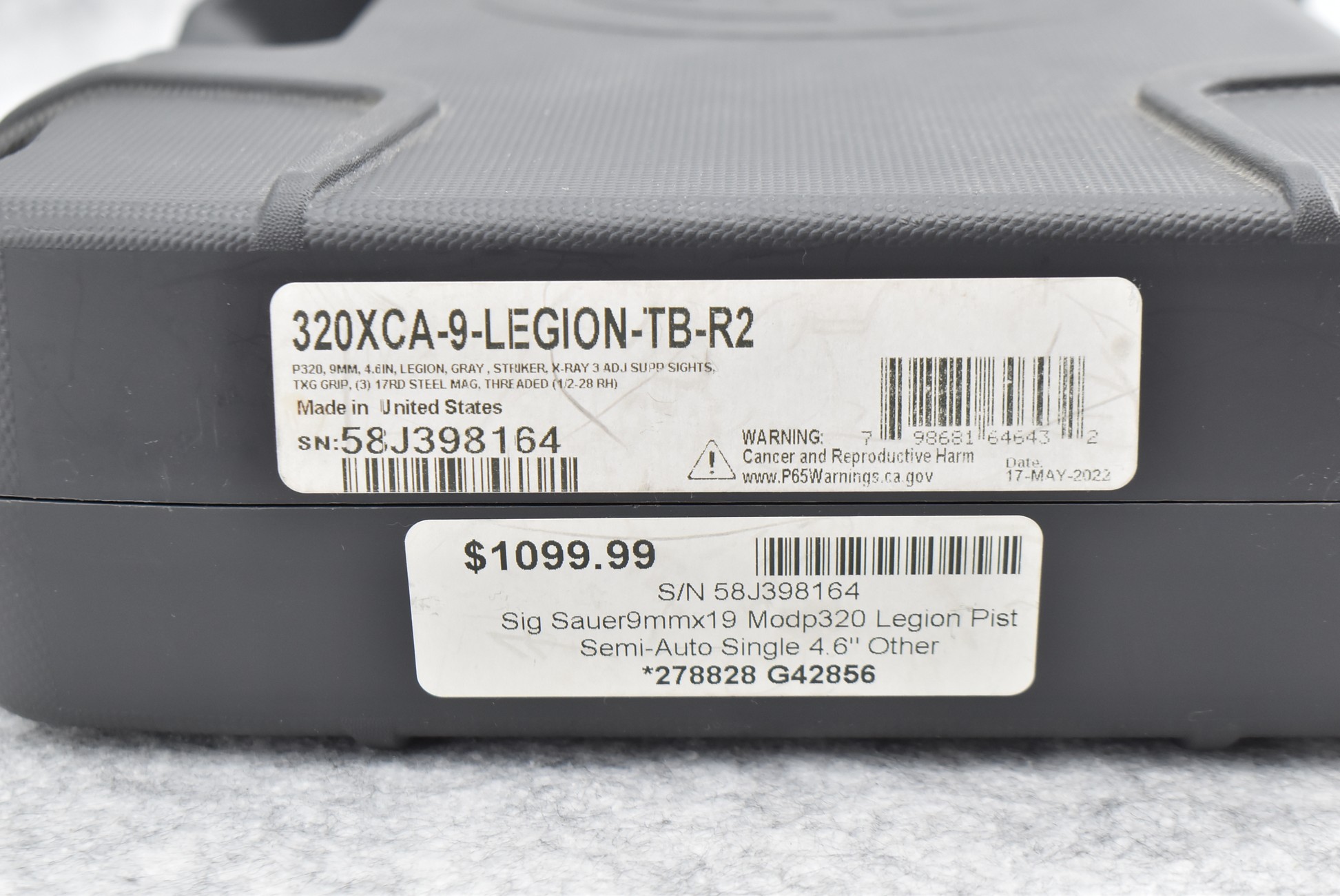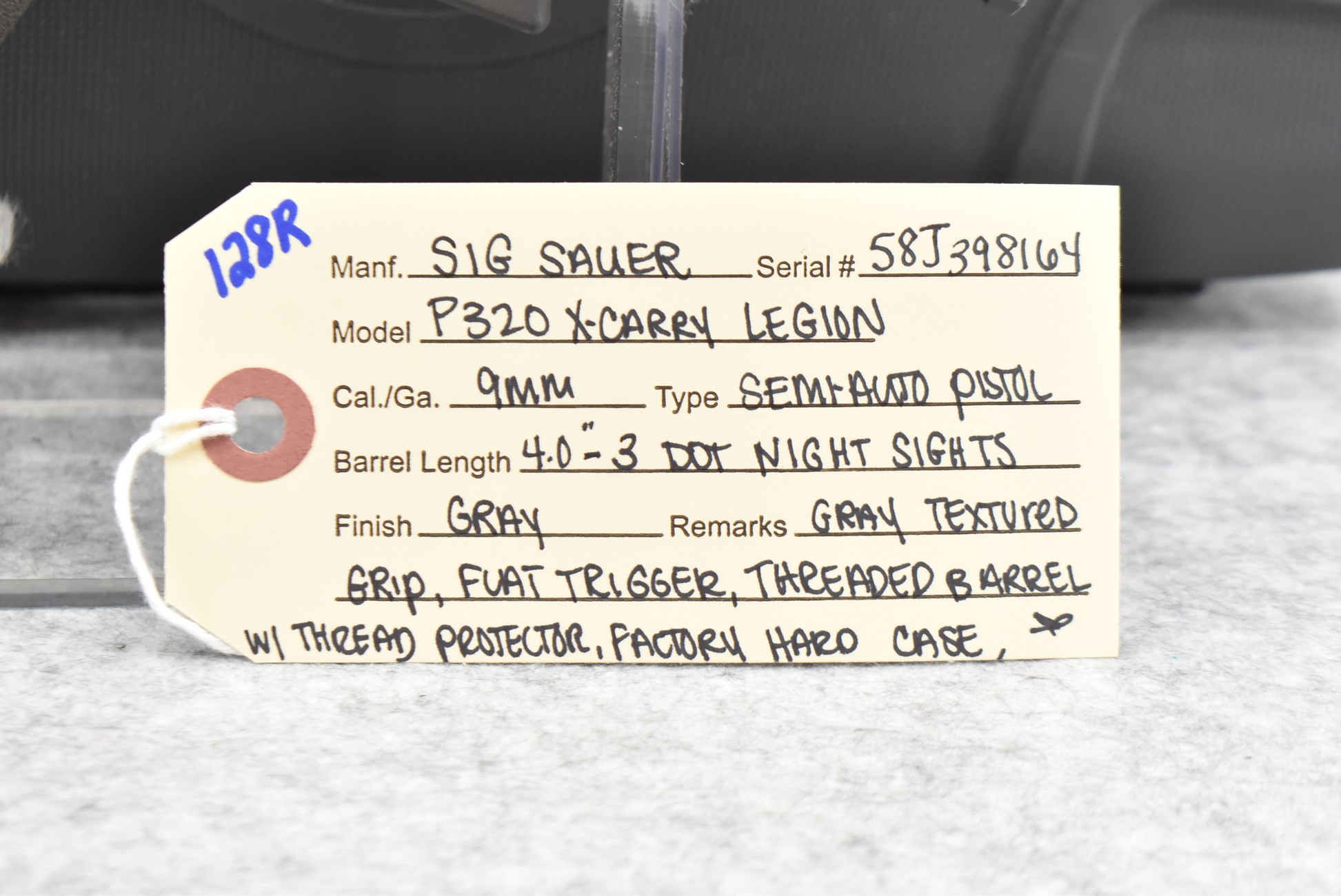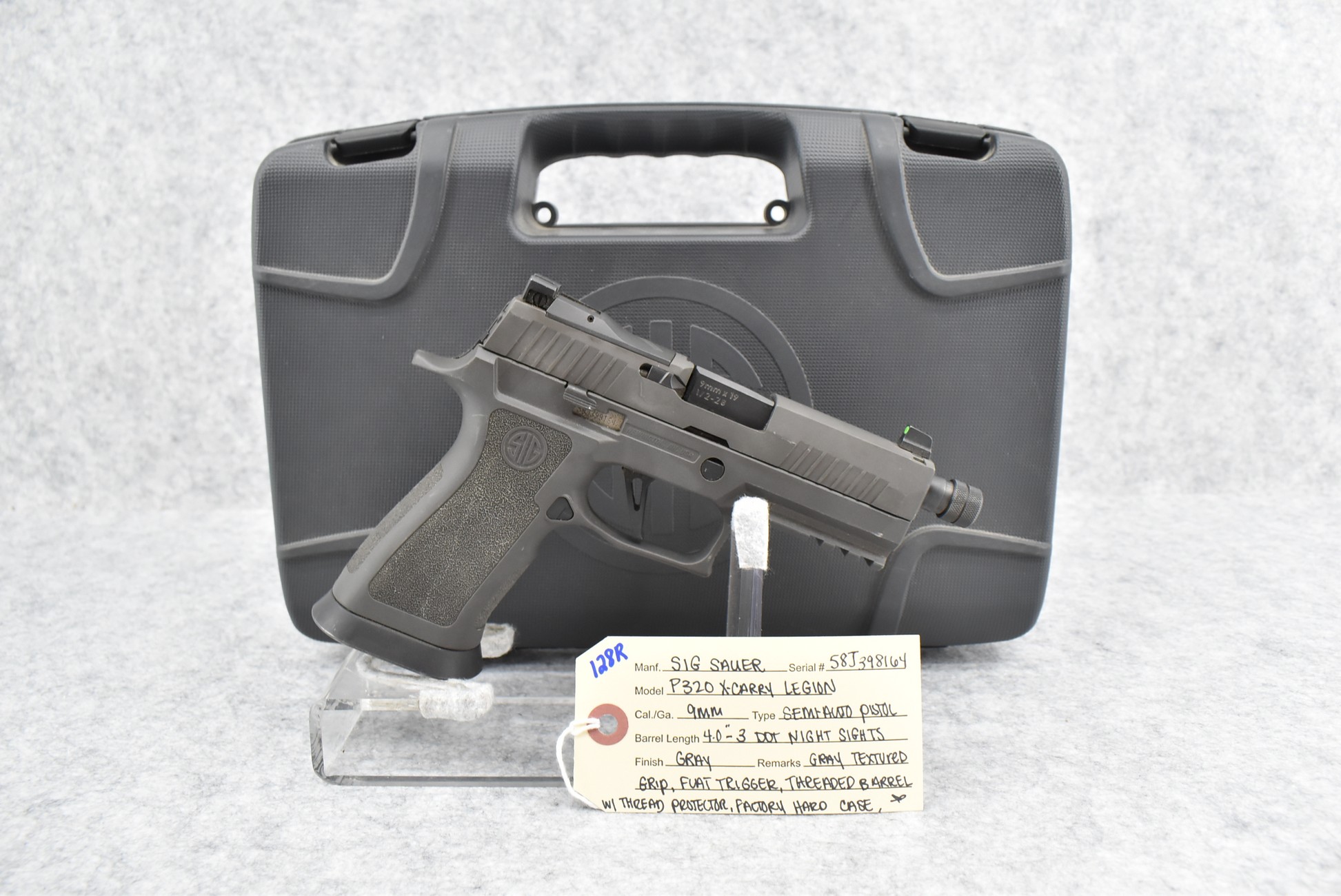 128R. Sig Sauer – Mod. P320 X-Carry Legion – 9mm Cal. Semi-Auto Pistol – w/4” Threaded Barrel w/Thread Protector & 3-Dot Night Sights – Gray Finish – w/Gray Textured Grip – w/Factory Hard Case, Magazine & Manual