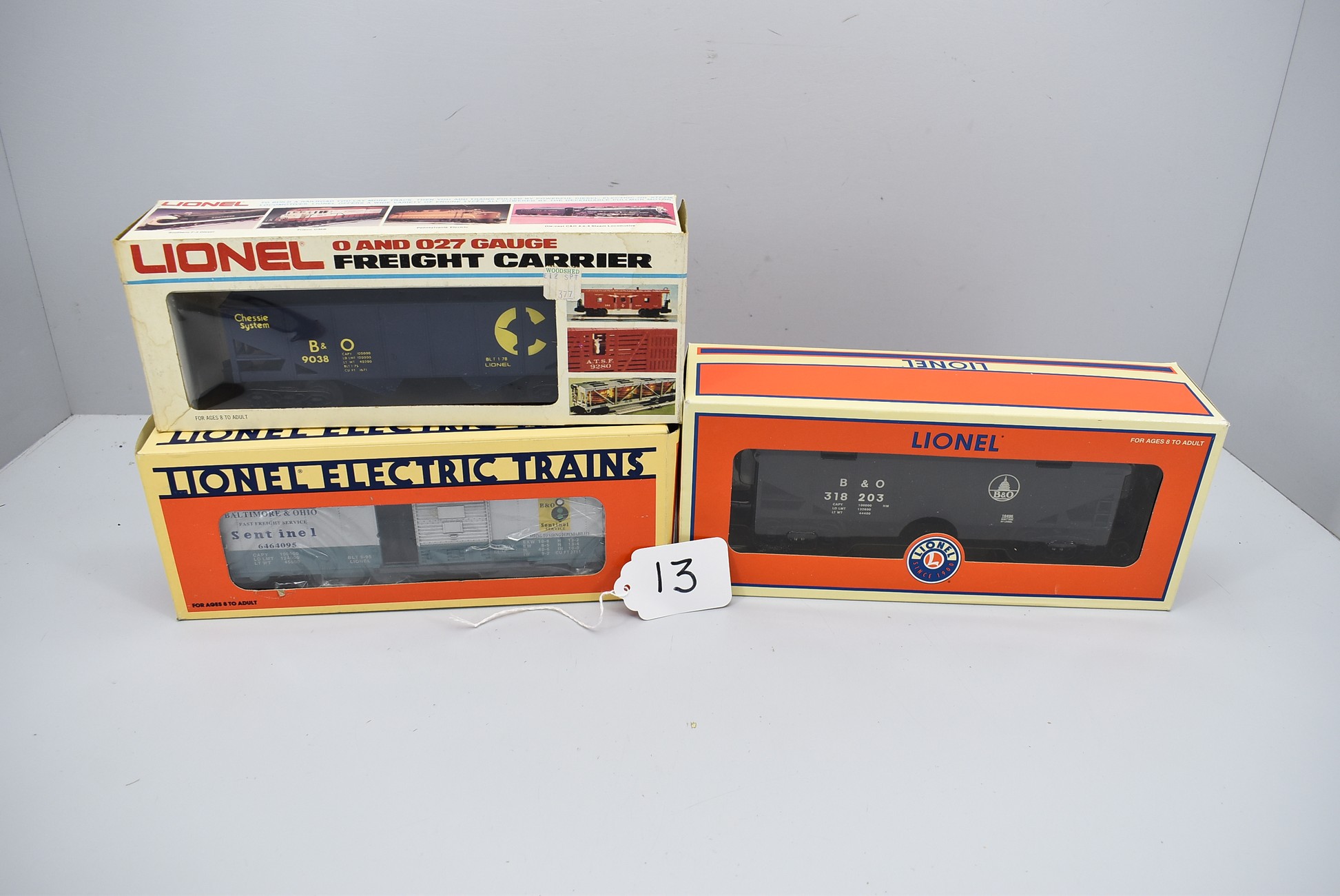 13. Lot of 3 Lionel O-Gauge Box Cars – Including Chessie Hopper 6-9038, TCA B&O Box Car 6-52051, and Baltimore & Ohio Hopper 6-16496 – All w/Boxes