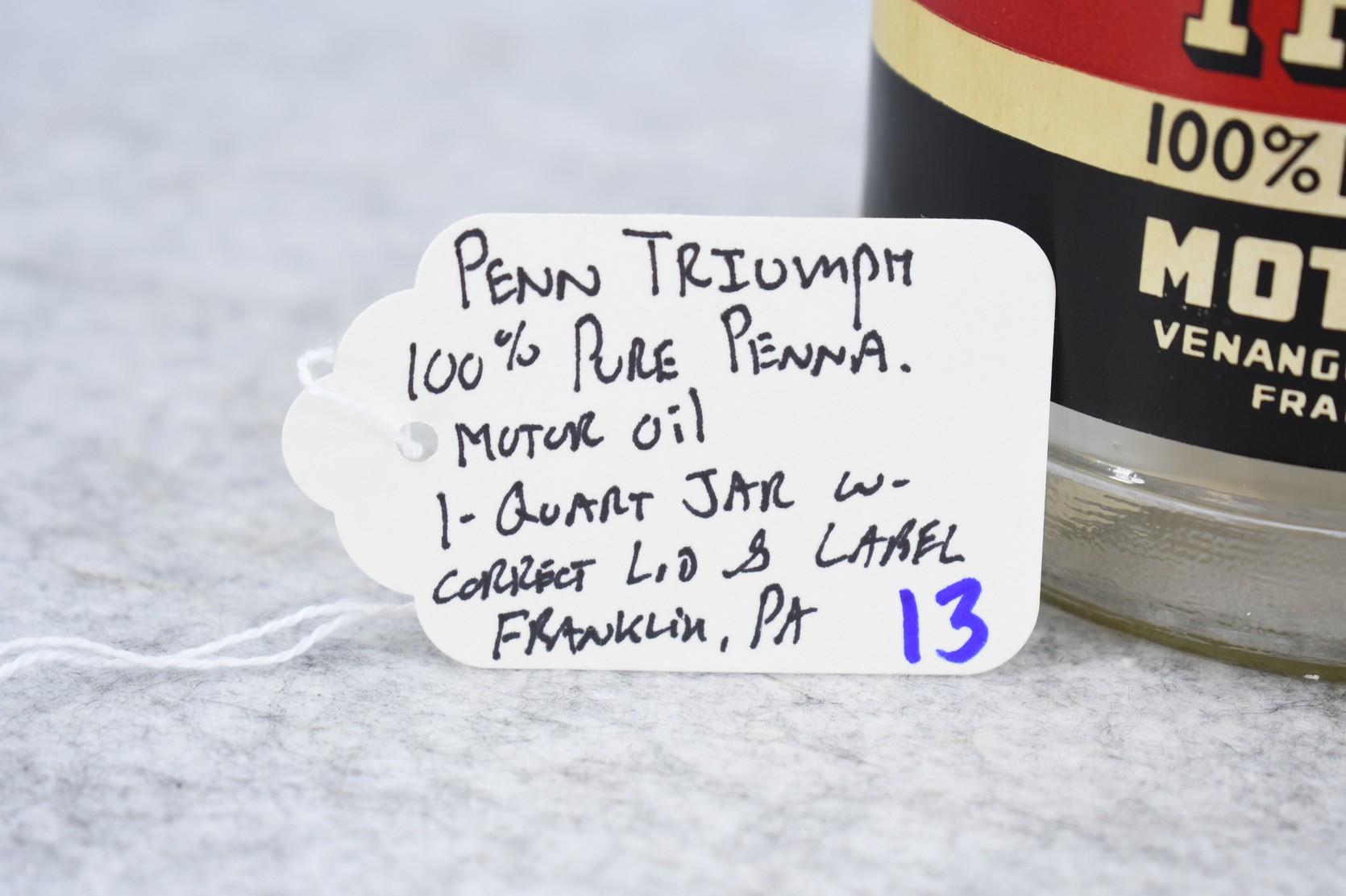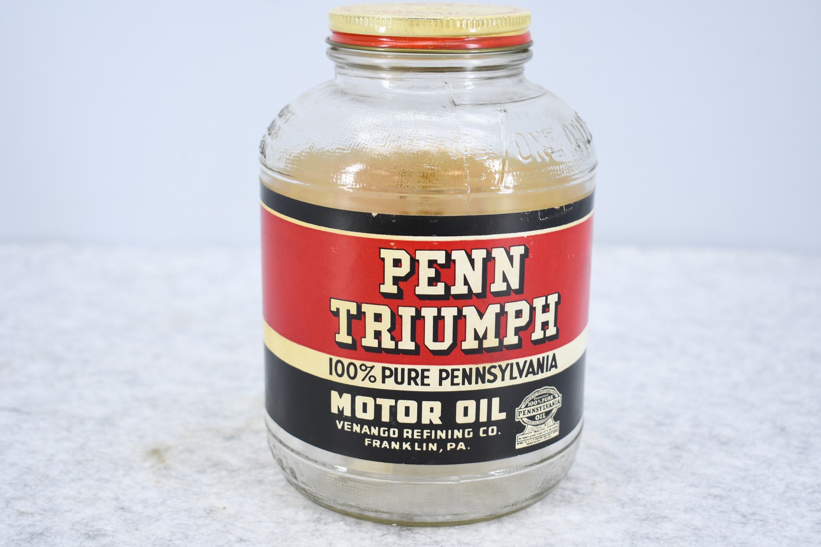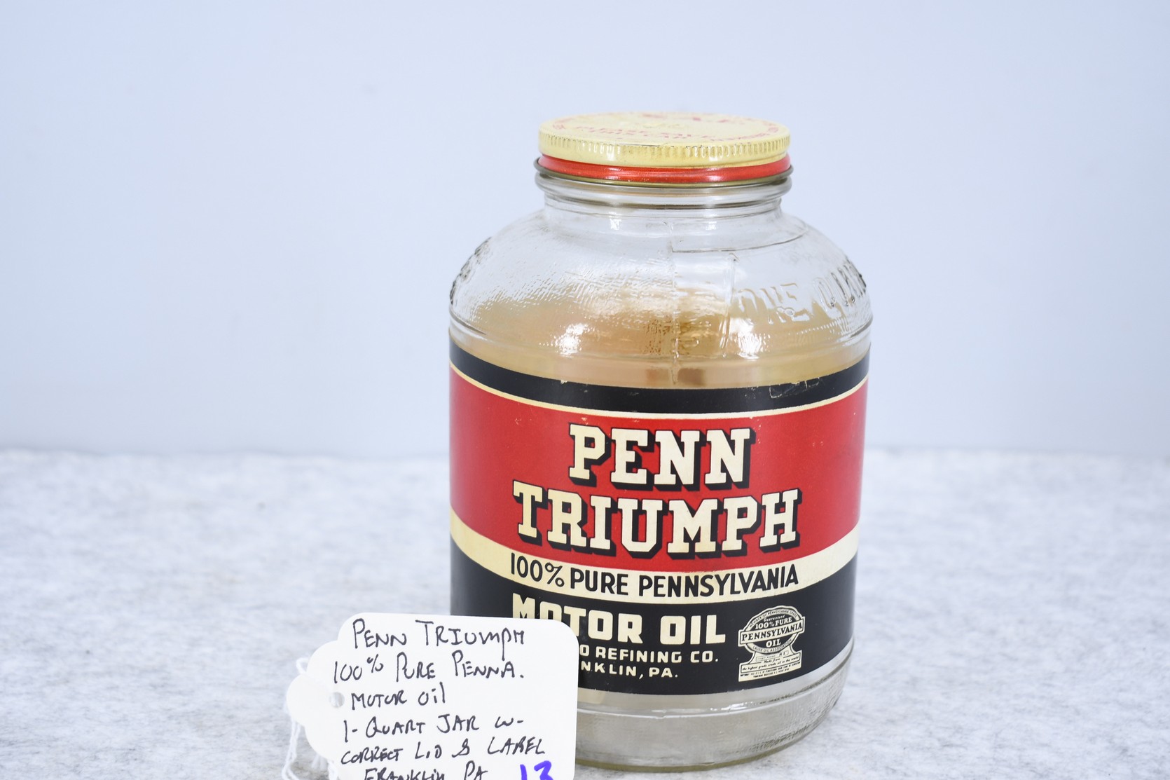 13. Penn Triumph 100% Pure Pennsylvania Motor Oil 1-Quart Jar w/Correct Lid and Label – Franklin, Pennsylvania
