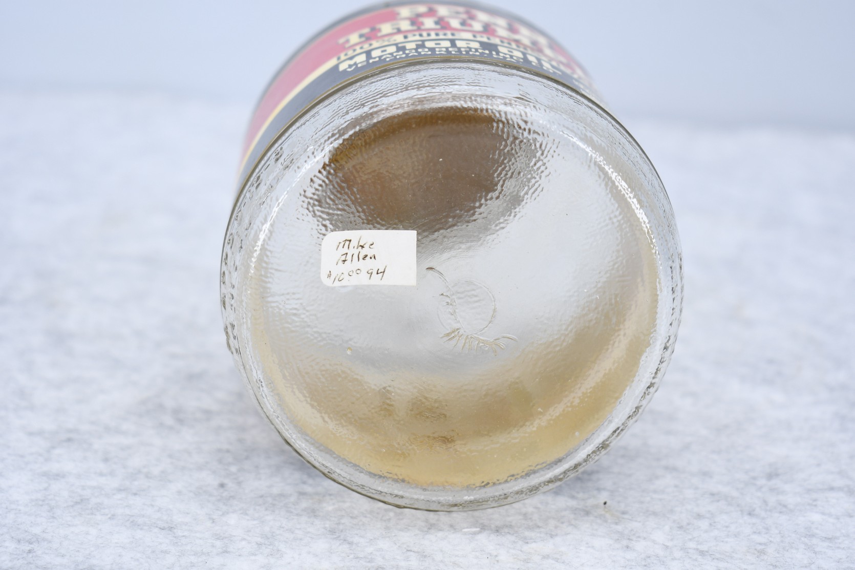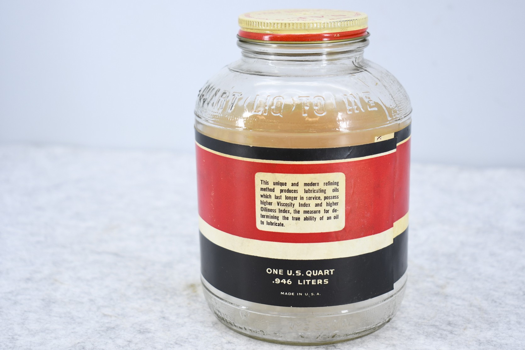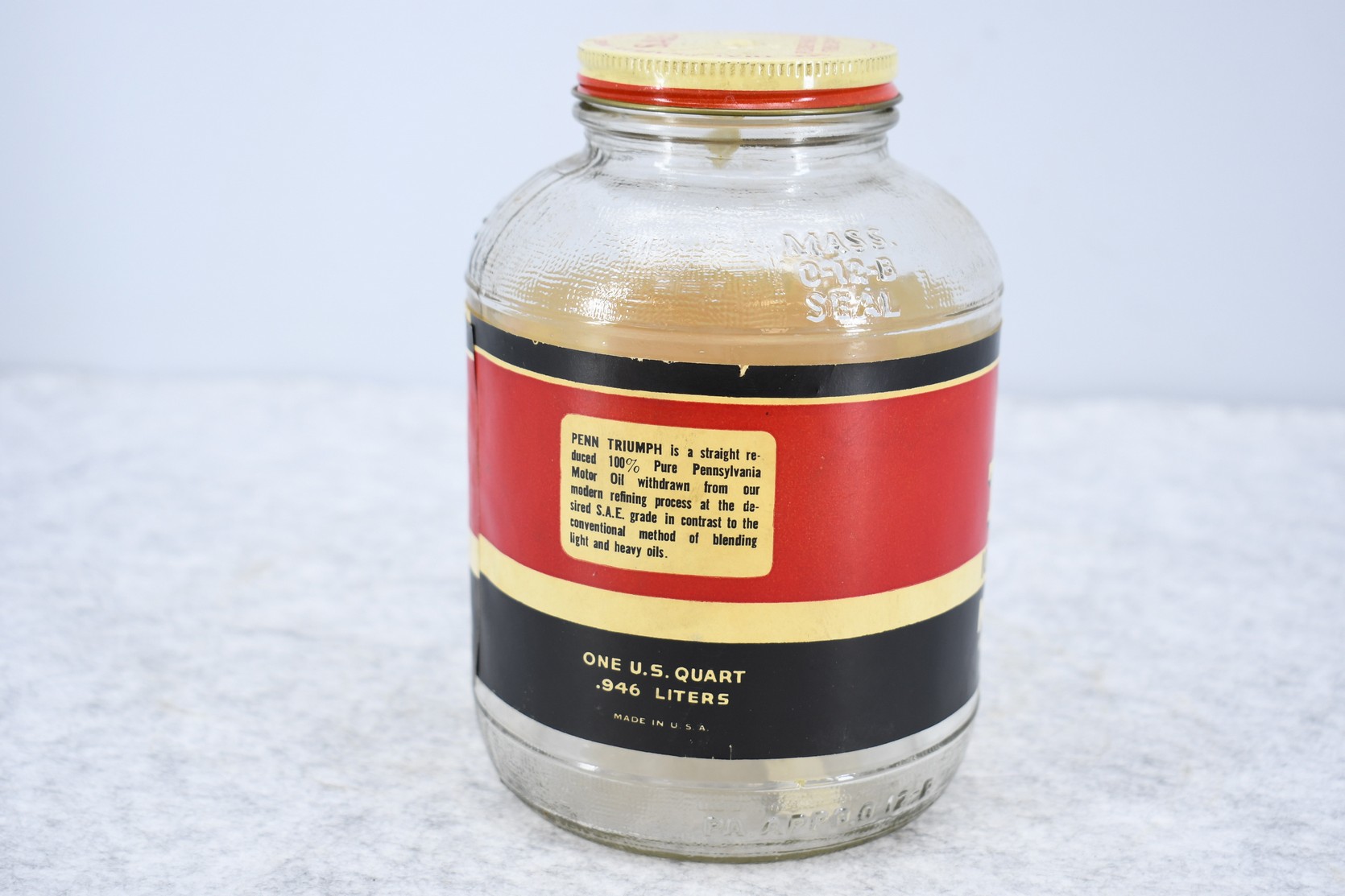 13. Penn Triumph 100% Pure Pennsylvania Motor Oil 1-Quart Jar w/Correct Lid and Label – Franklin, Pennsylvania