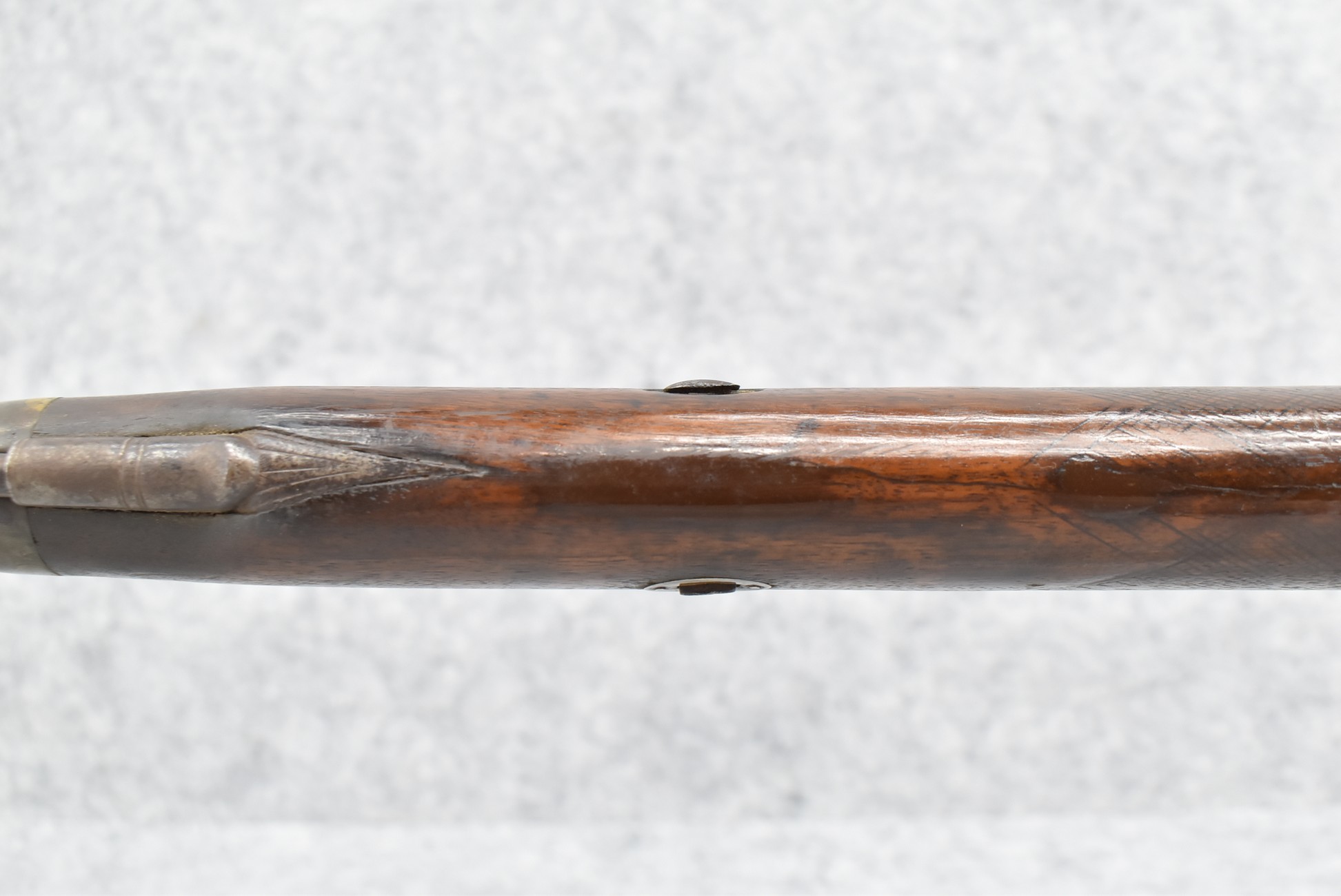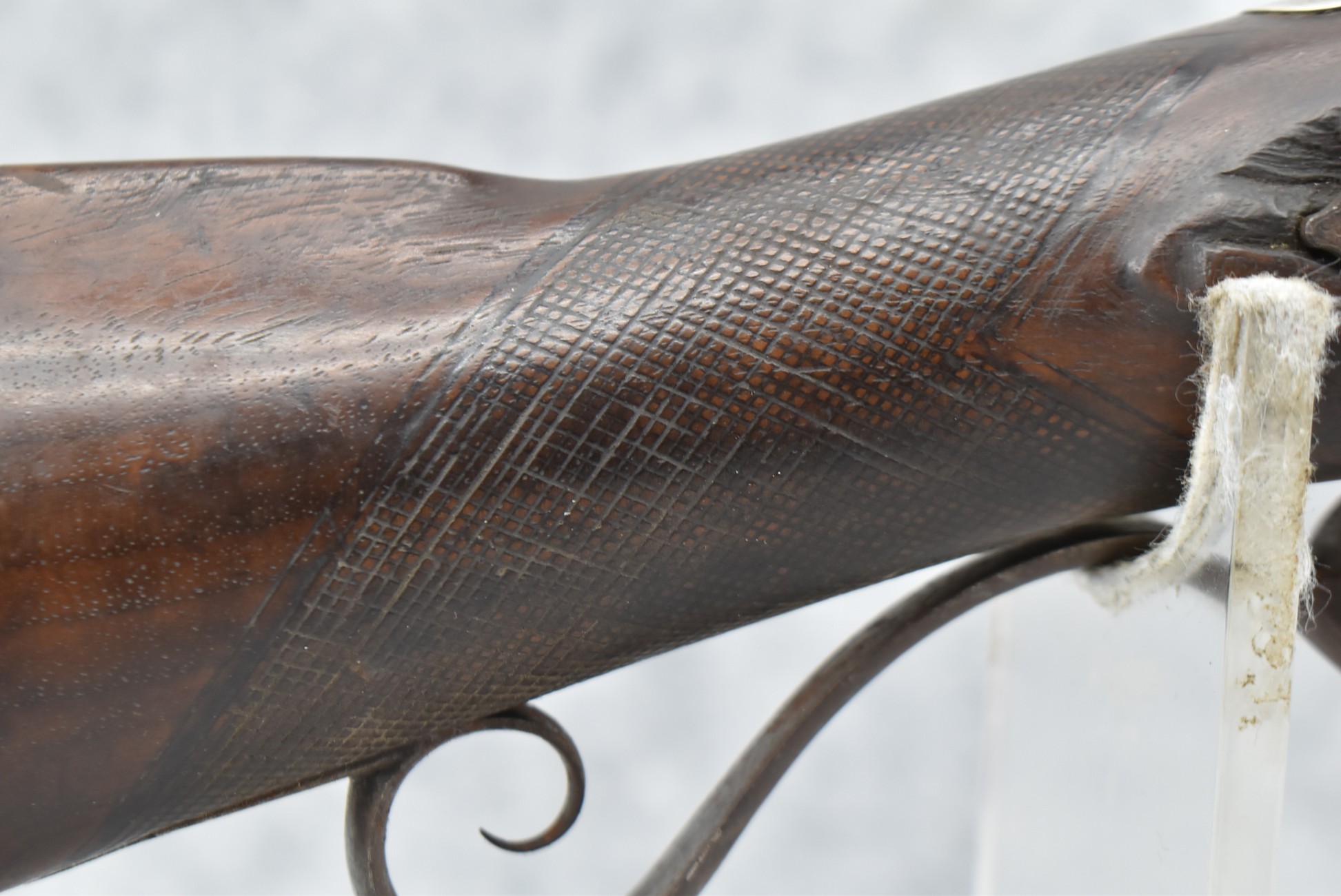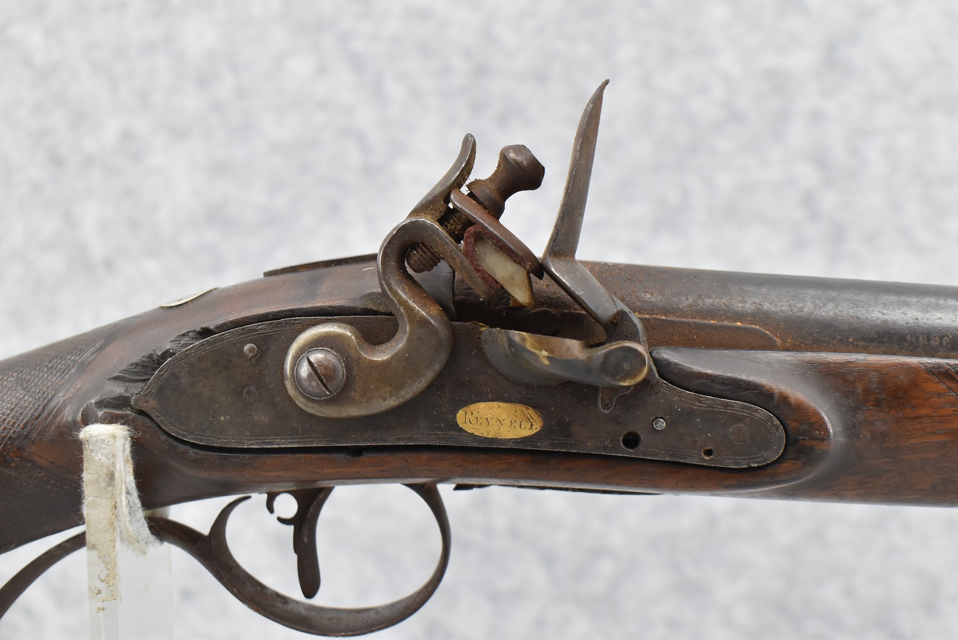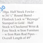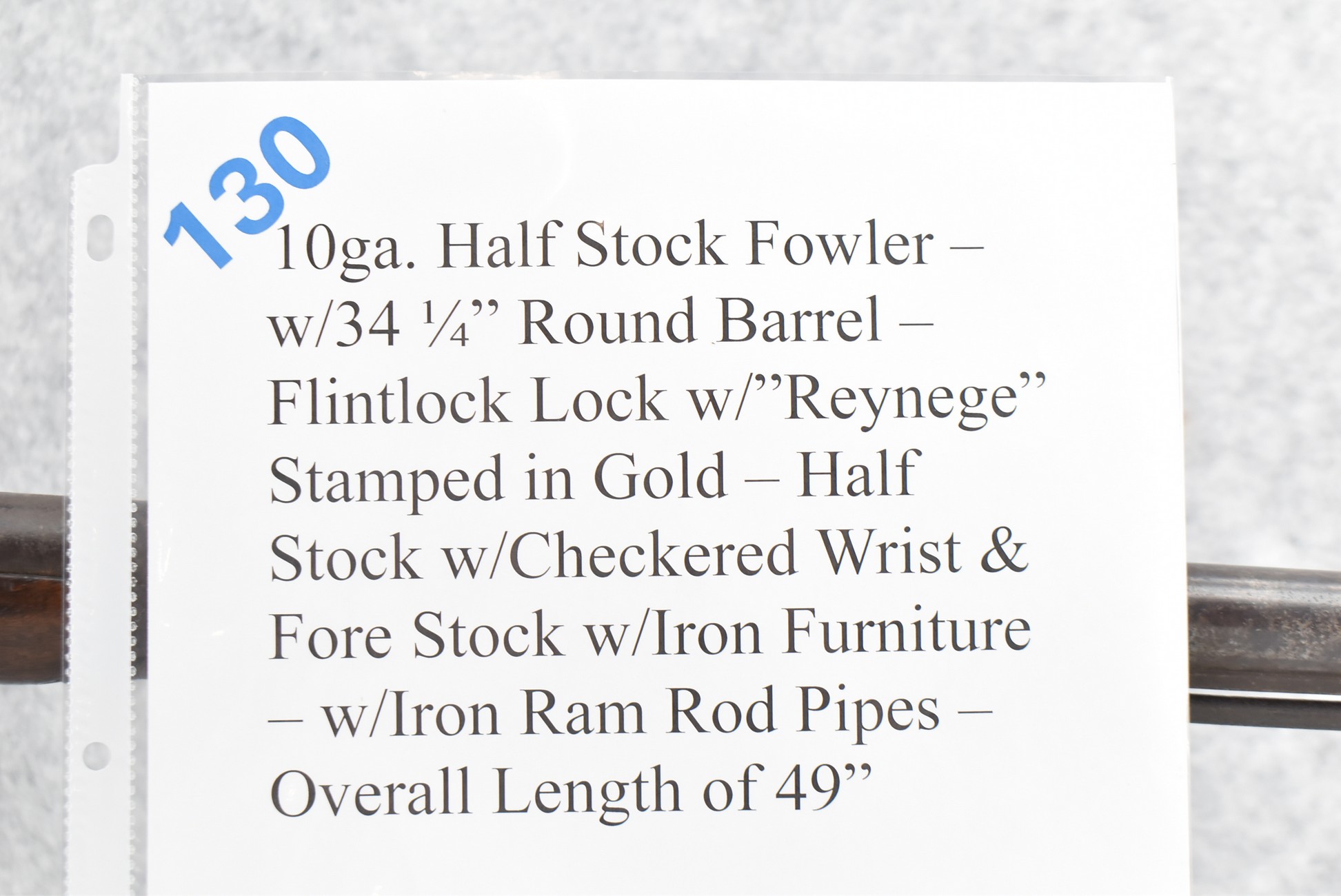 130. 10ga. Half Stock Fowler – w/34 ¼” Round Barrel – Flintlock Lock w/”Reynege” Stamped in Gold – Half Stock w/Checkered Wrist & Fore Stock w/Iron Furniture – w/Iron Ram Rod Pipes – Overall Length of 49”