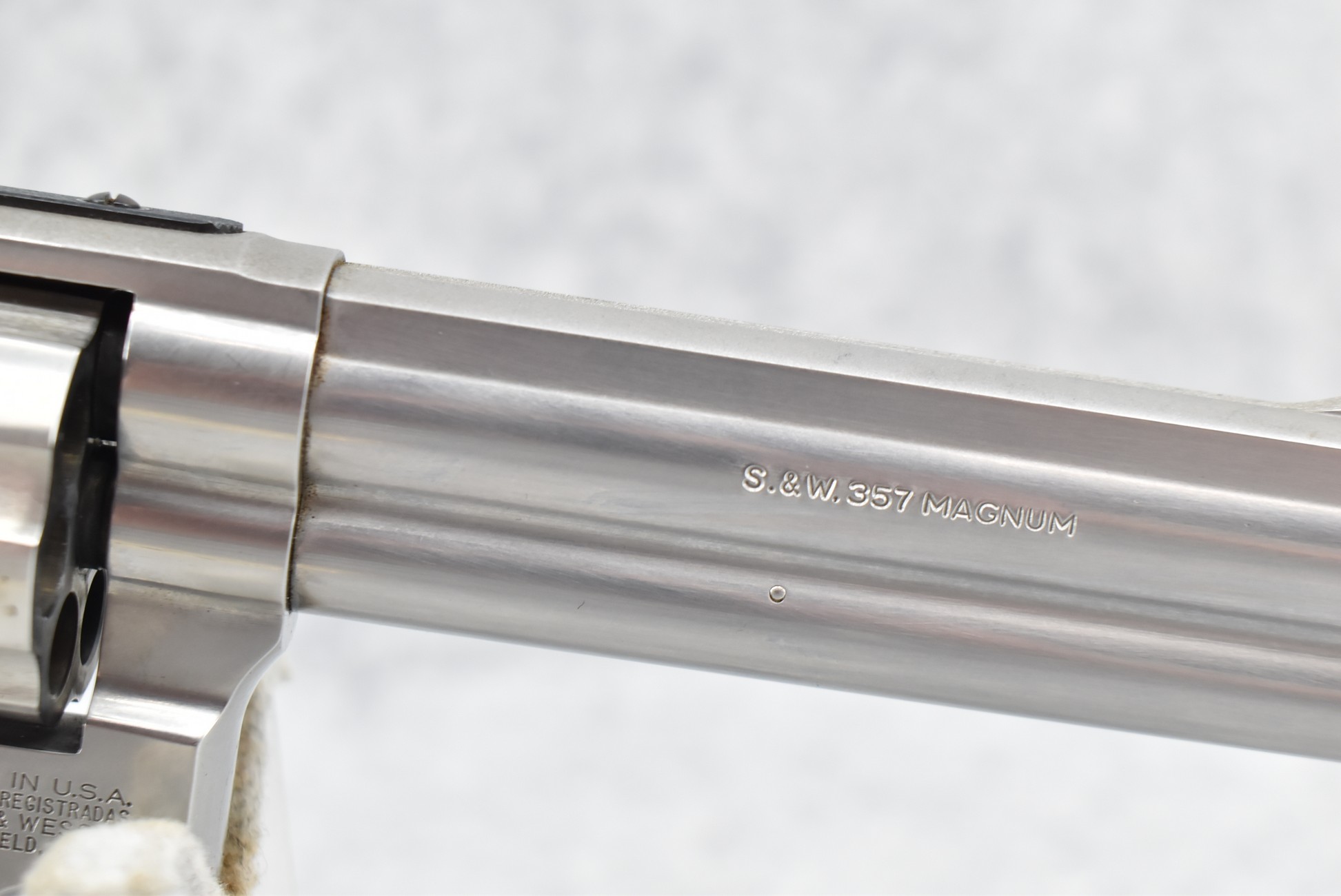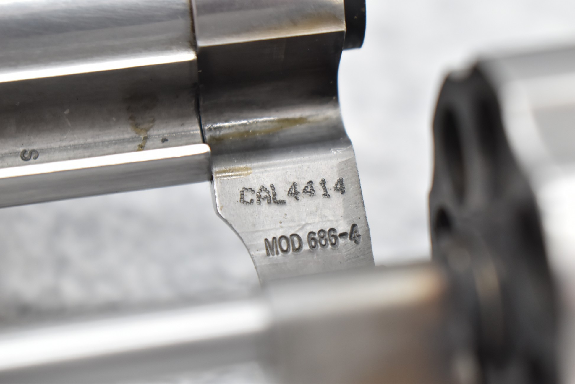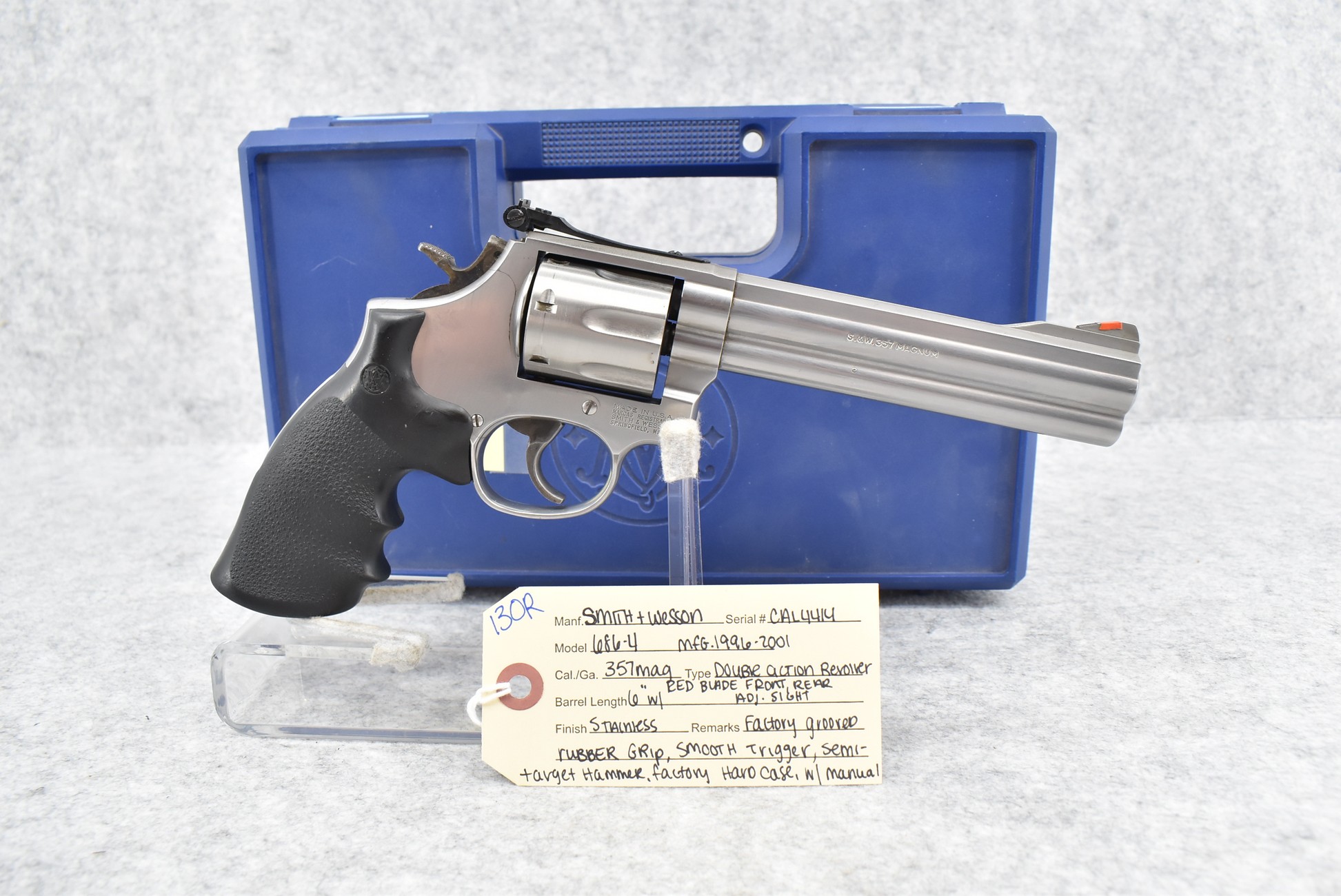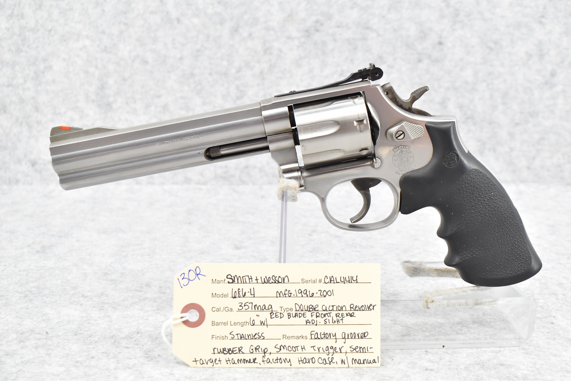 130R. Smith & Wesson – Mod. 686-4 – 357 Mag. Cal. Double Action Revolver – w/6” Barrel w/Red Blade Front & Rear Adj. Sights – Stainless Finish – w/Factory Grooved Rubber Grip – w/Smooth Trigger – w/Semi-Target Hammer – w/Factory Hard Case & Manual – Mfg. Between 1996-2001