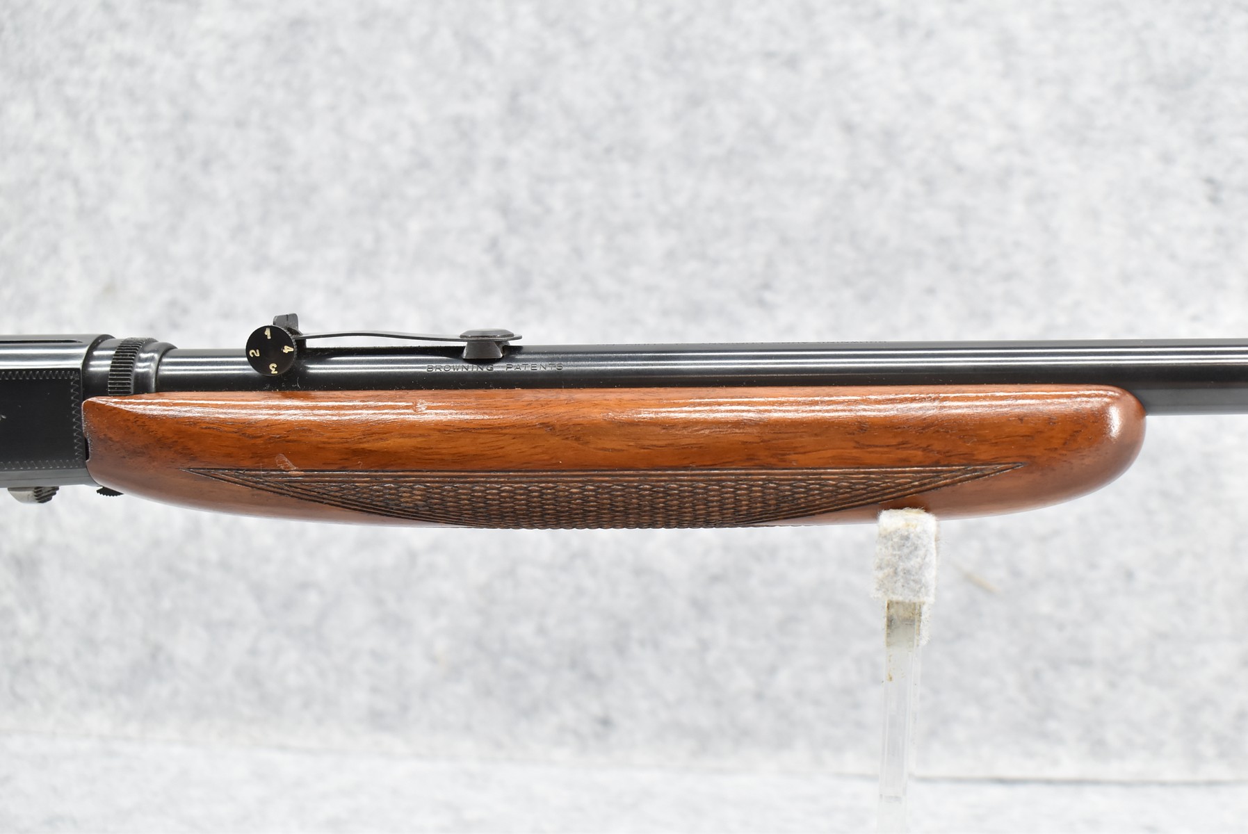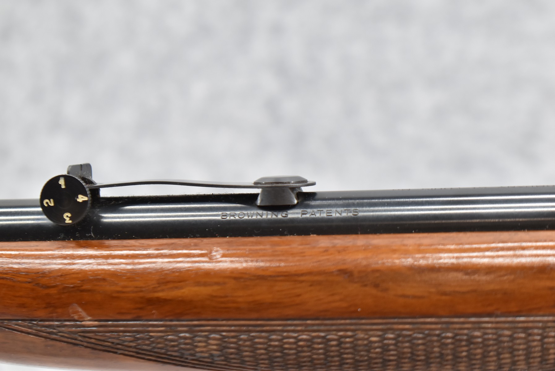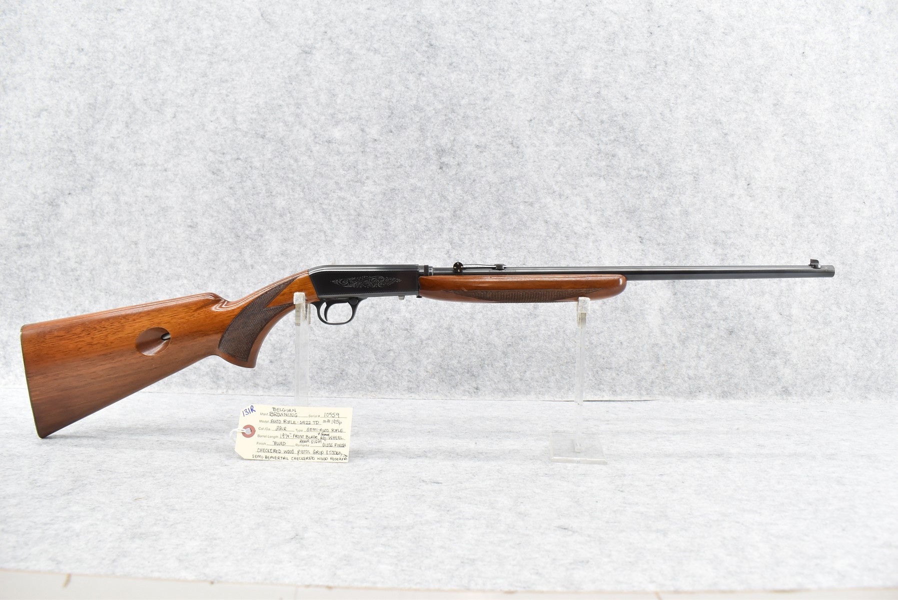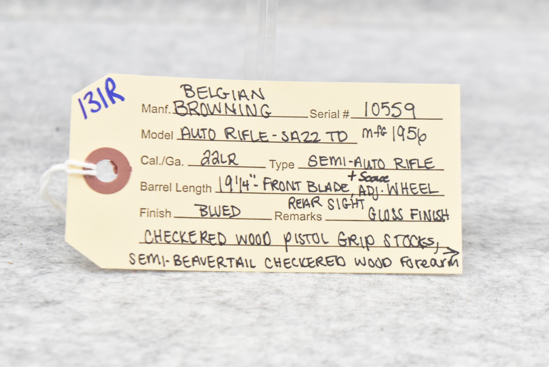 131R. Belgian-Browning – Mod. Auto Rifle-SA22 TD – 22LR Cal. Semi-Auto Rifle – w/19 ¼” Barrel w/Front Blade & Scarce Adj. Wheel Rear Sights – Blued Finish – w/Lightly Engraved Receiver – w/Gloss Finish Checkered Wood Pistol Grip Stocks w/Factory Butt Plate & Semi-Beavertail Checkered Wood Forearm – w/Tubular Magazine Loaded Through Butt Stock – Mfg. 1956 – As New!