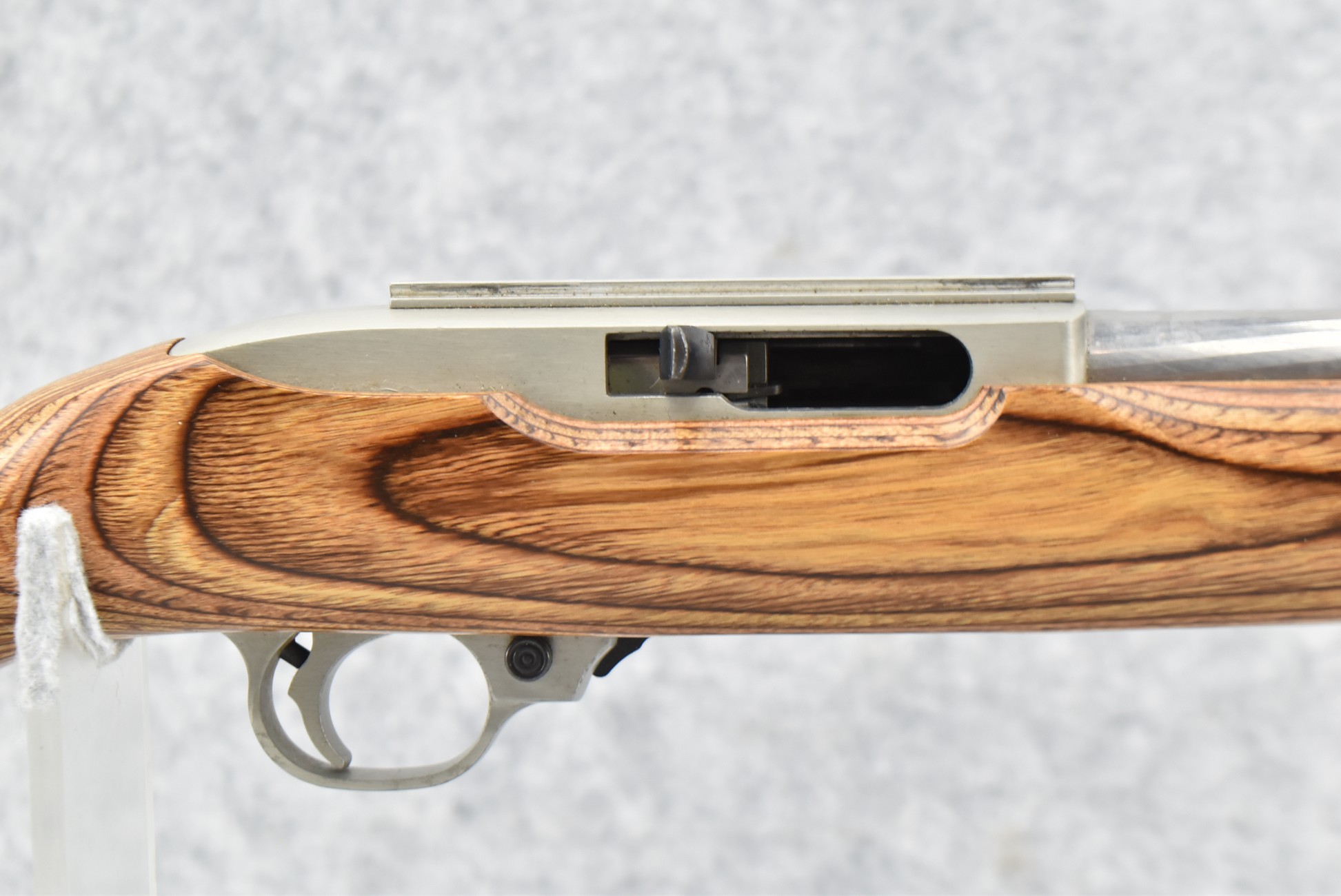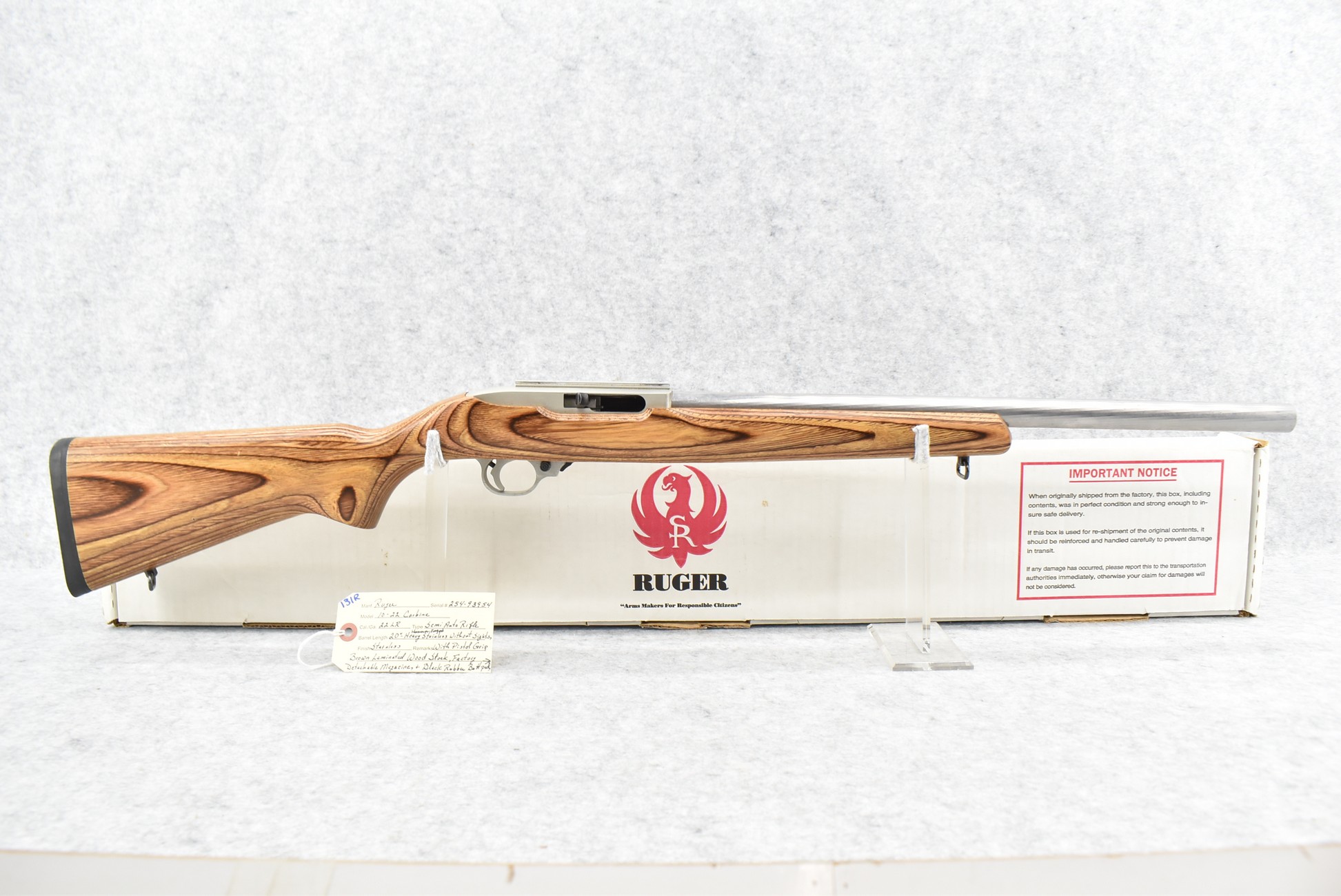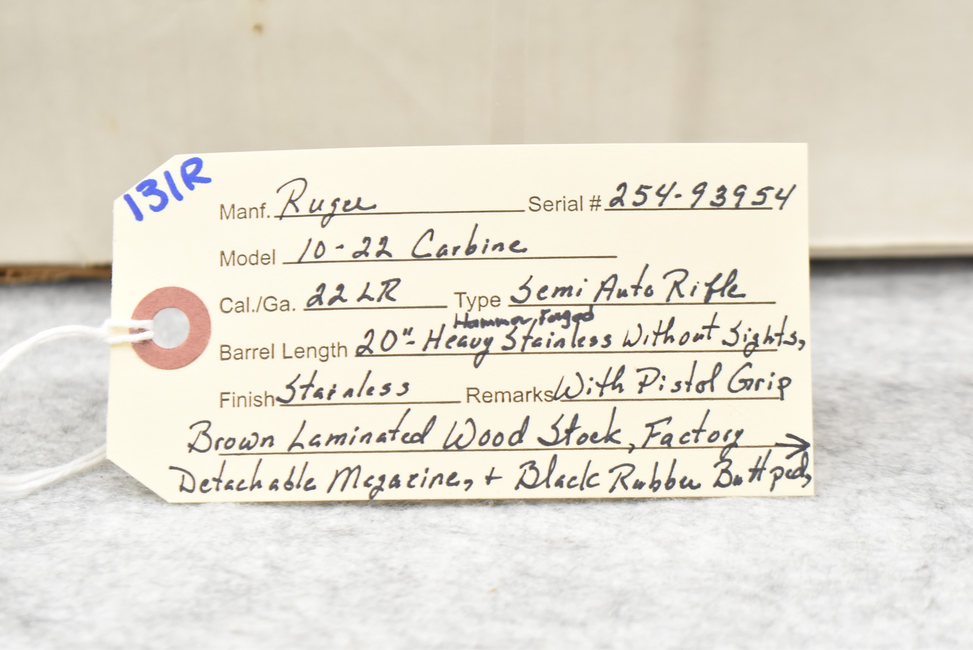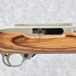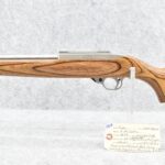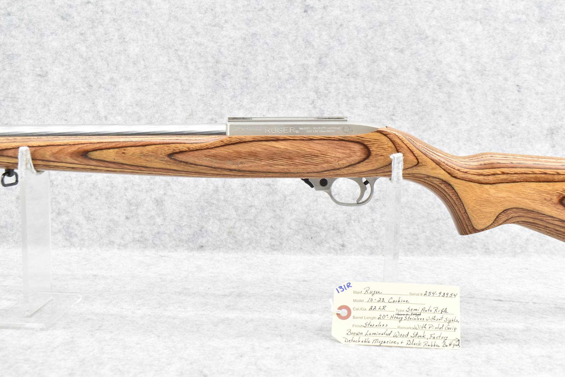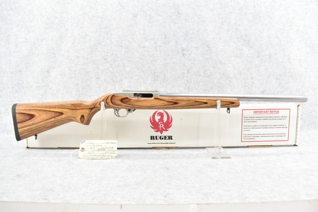 131R. Ruger – Mod. 10/22 Carbine – 22LR Cal. Semi-Auto Rifle – w/20” Heavy Stainless Hammer Forged Barrel w/No Sights – Stainless Finish – w/Pistol Grip Brown Laminated Wood Stock w/Black Rubber Butt Pad – w/Factory Detachable Magazine – w/Factory Box and Manual