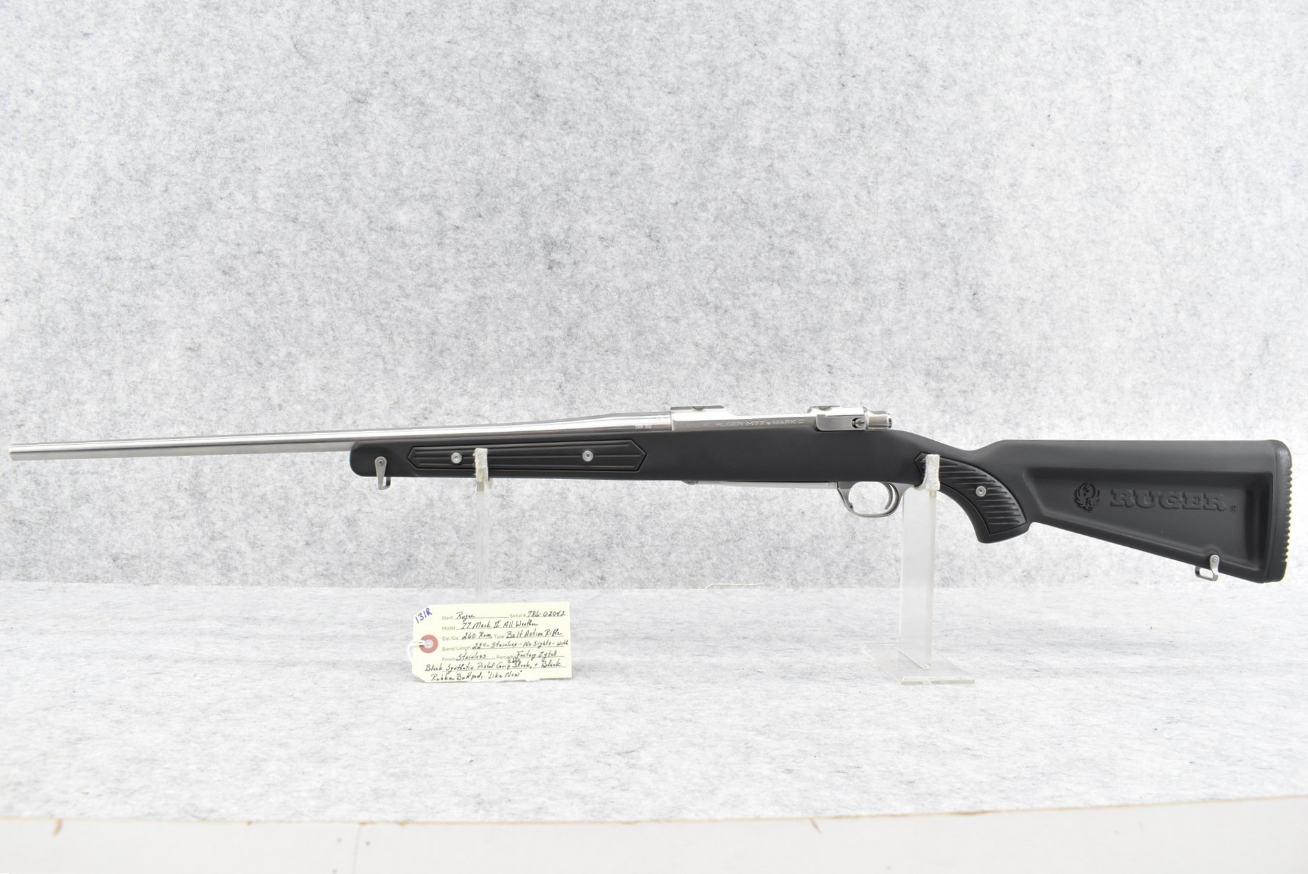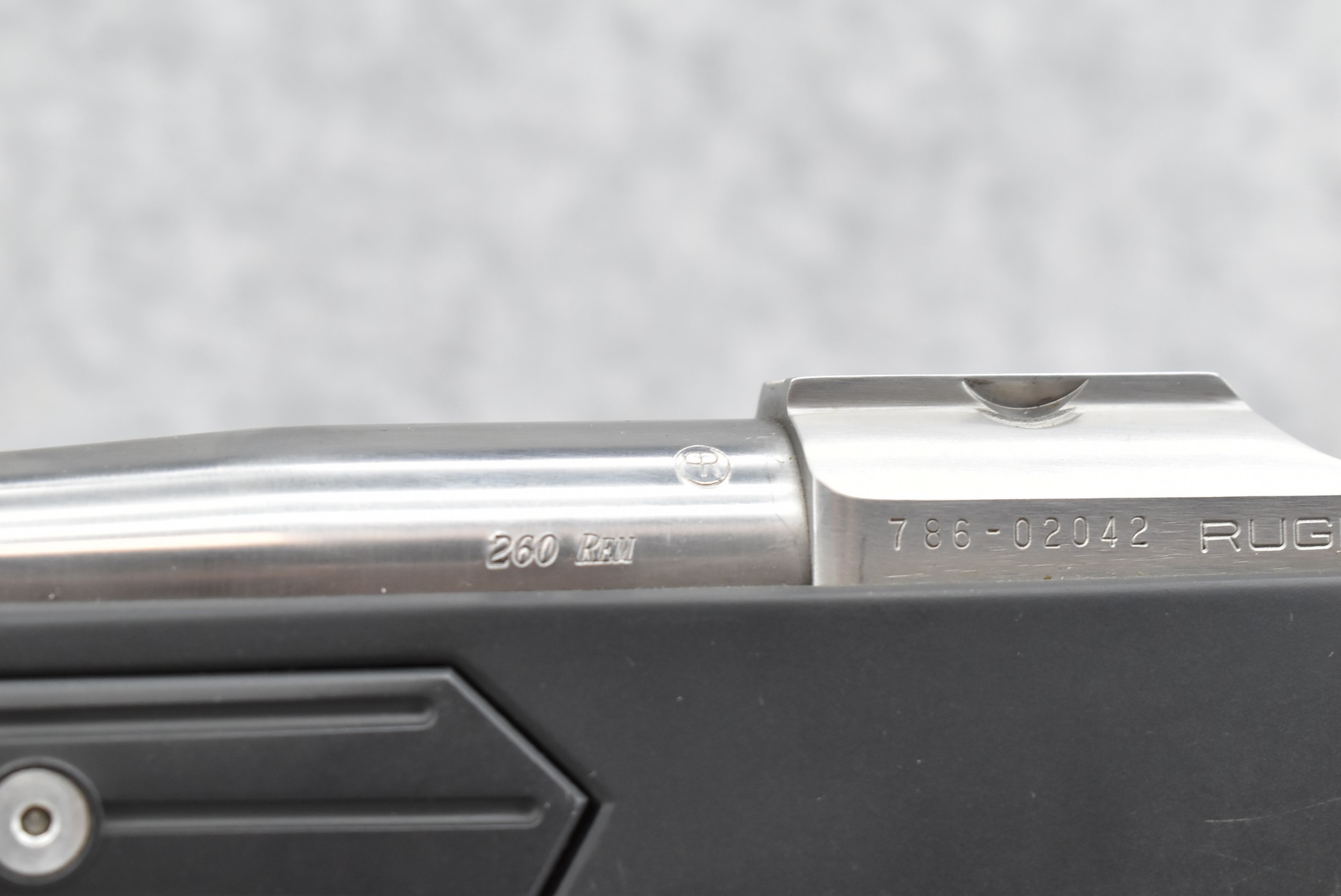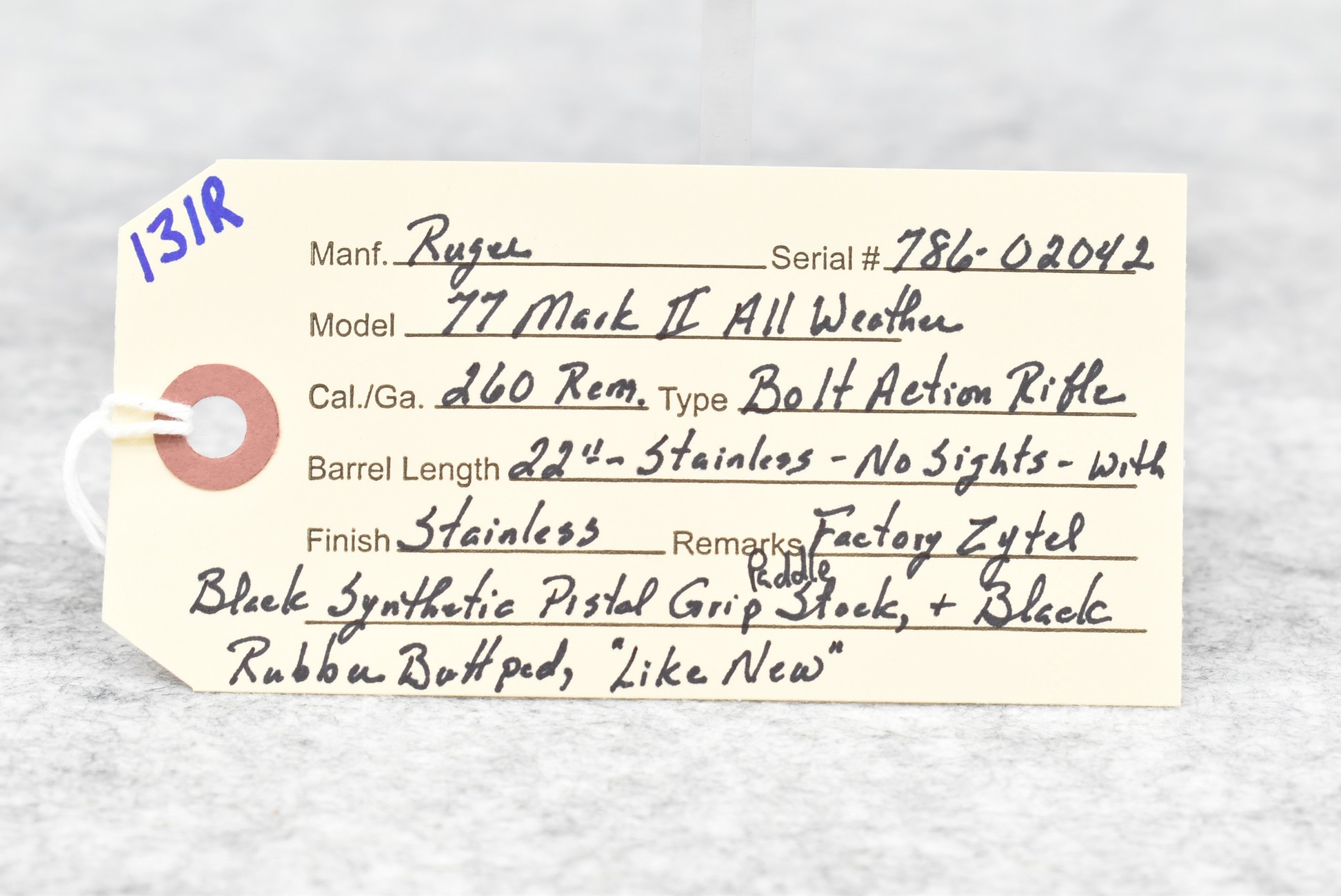 131R. Ruger – Mod. 77 Mark II-All Weather – In the Scarce 260 Rem. Cal. Bolt Action Rifle – w/22” Barrel – Stainless Finish – w/Factory Zytel Black Synthetic Pistol Grip Paddle Stock w/Factory Butt Pad – As New