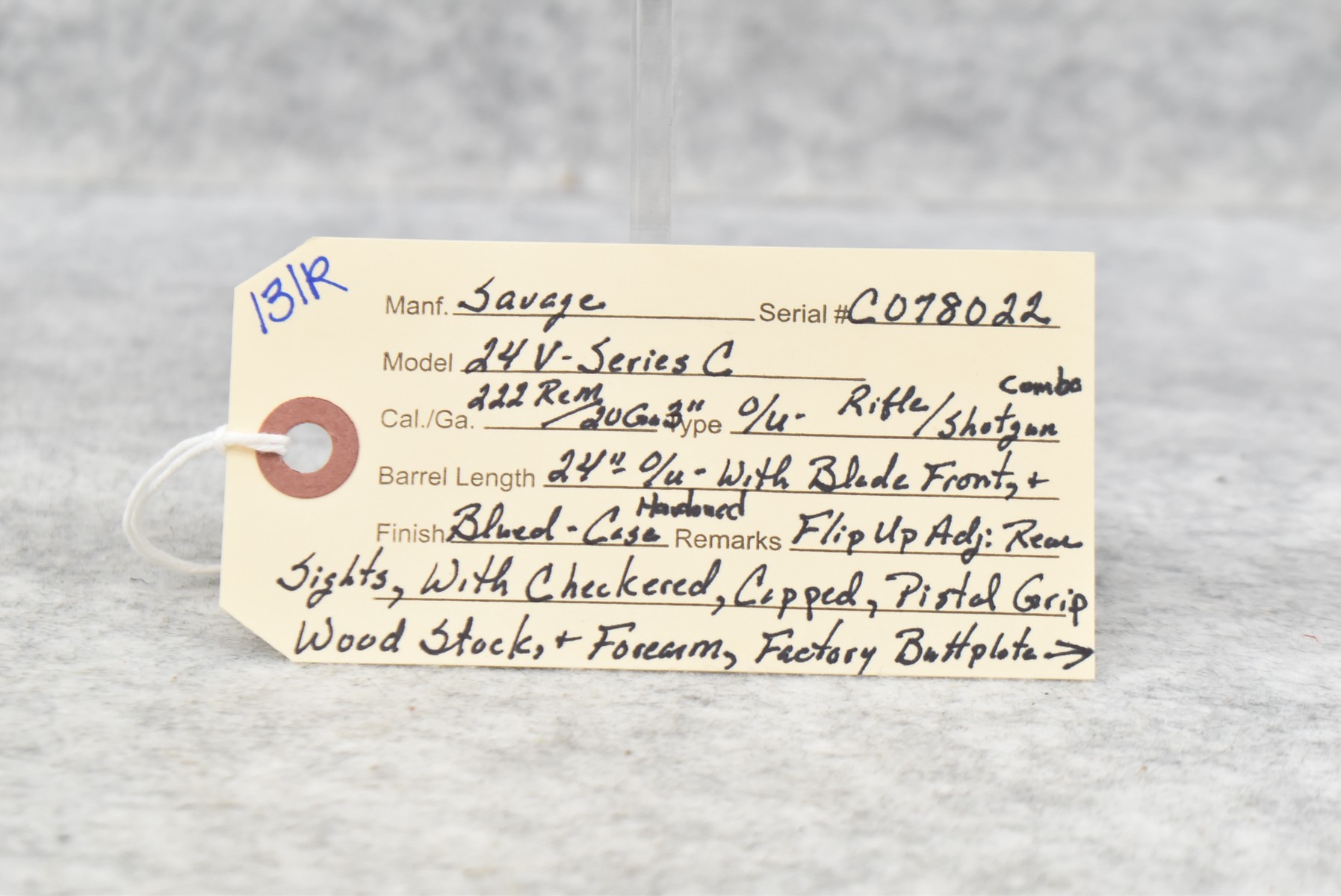 131R. Savage – Mod. 24V-Series C – 222 Rem. Cal. Over 20ga. 3” Rifle/Shotgun Over-Under Combo – w/24” Barrels w/Blade Front & Flip Up Adj. Rear Sights – Blued/Case Hardened Finish – w/Checkered Capped Pistol Grip Wood Stocks w/Factory Butt Plate – w/Hammer Mounted Barrel Selector