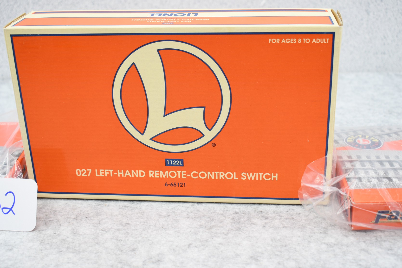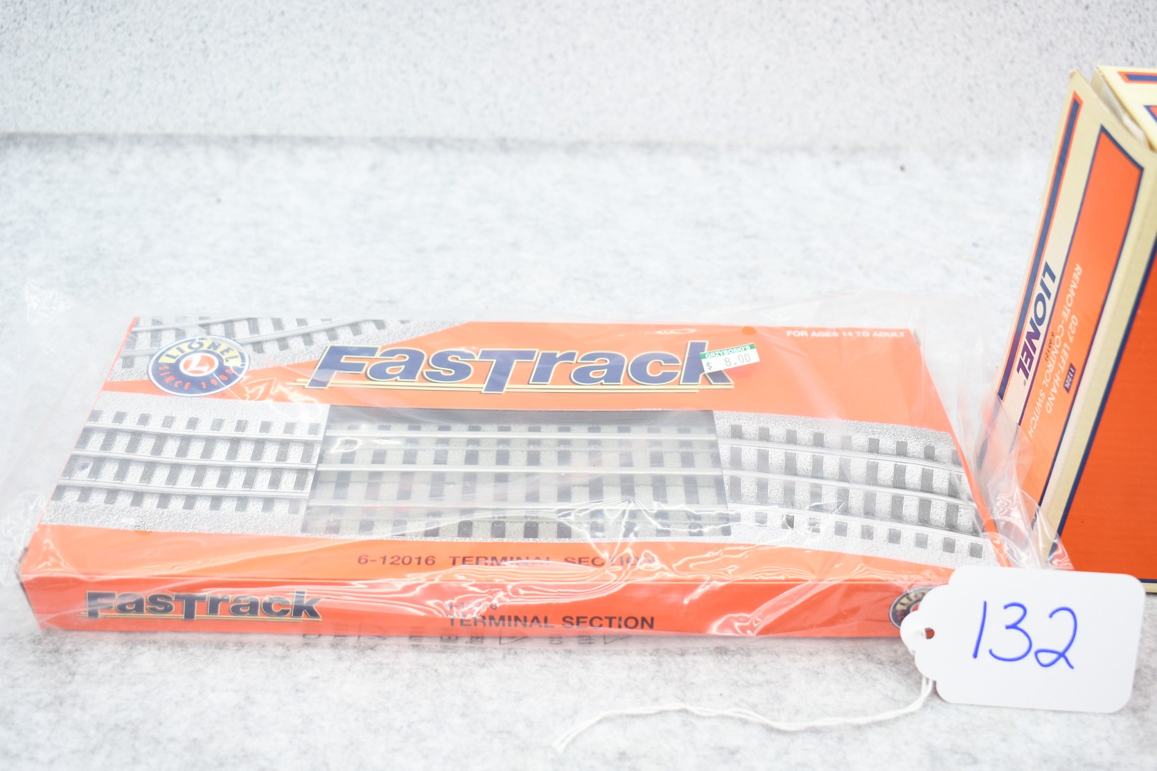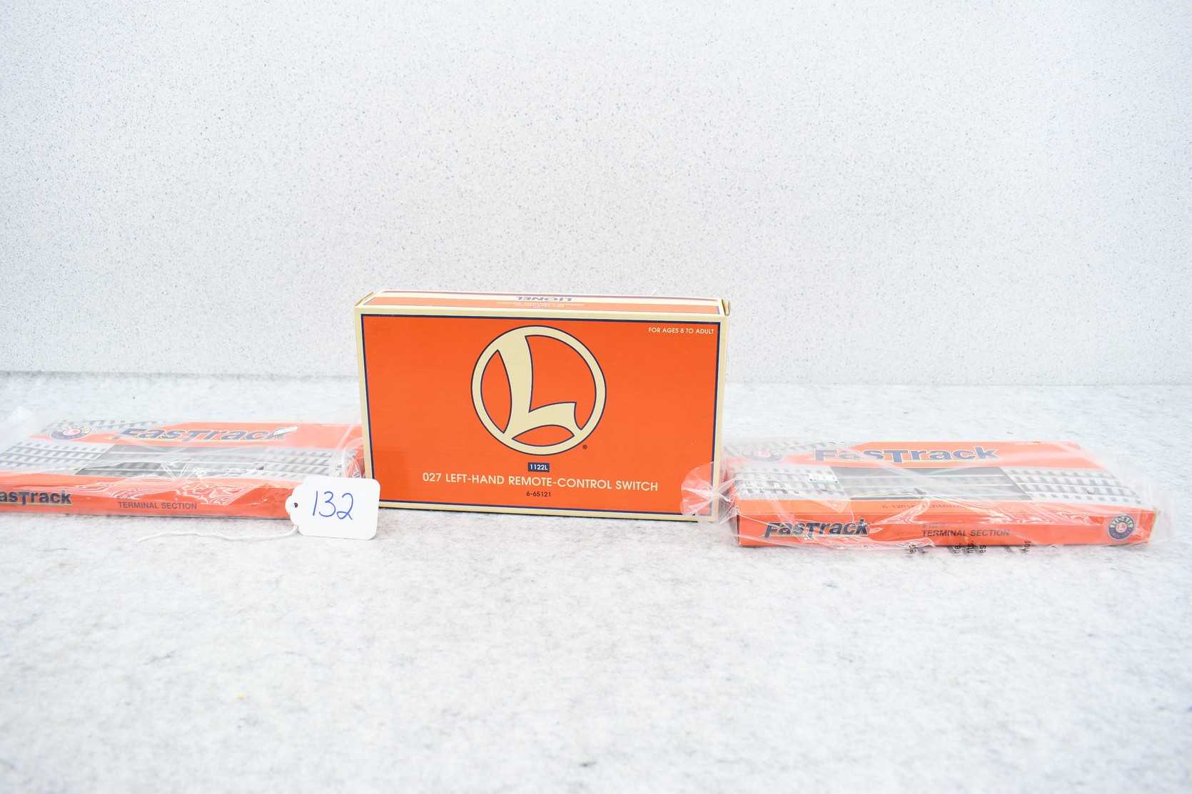 132. Lot of Lionel accessories including 6-65121 027 Left-hand remote-control switch, Pair of 6-12016 Fast Track terminal sections, all NIB