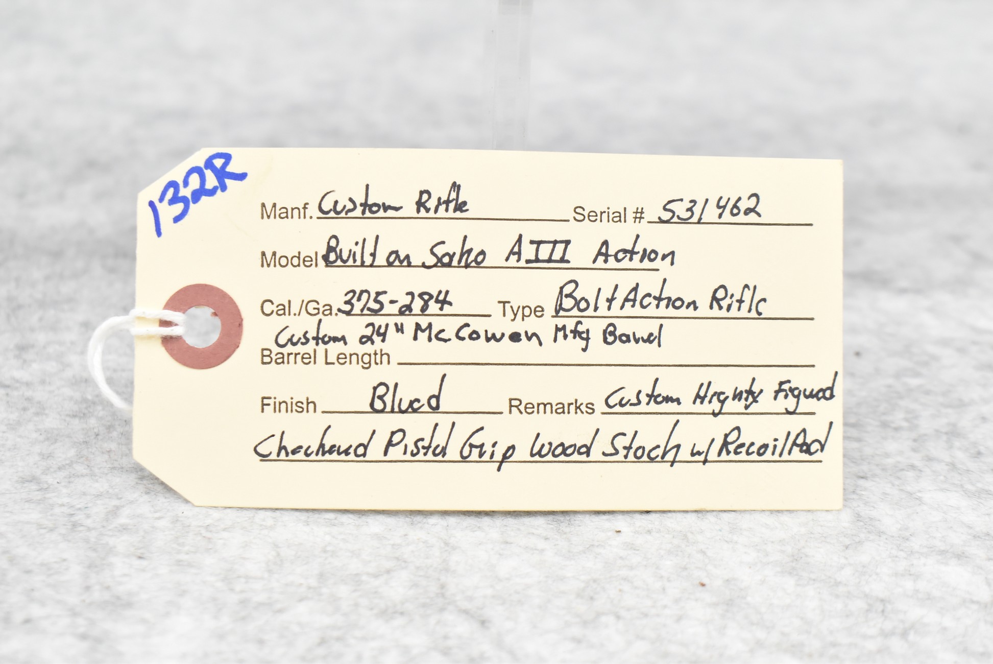 132R. Custom Rifle – Built on Sako AIII Action – 375-284 Cal. Bolt Action Rifle – w/Custom 24” McCowen Mfg. Barrel – Blued Finish – w/Custom Highly Figured Checkered Pistol Grip Wood Stock w/Recoil Pad