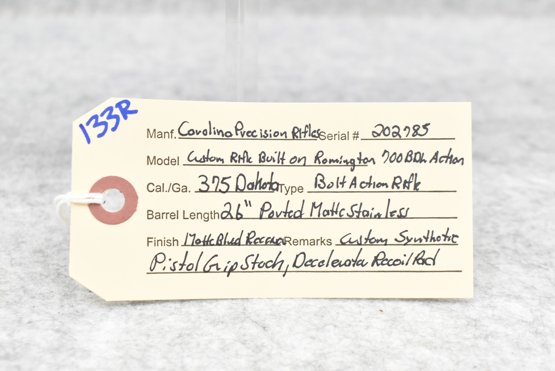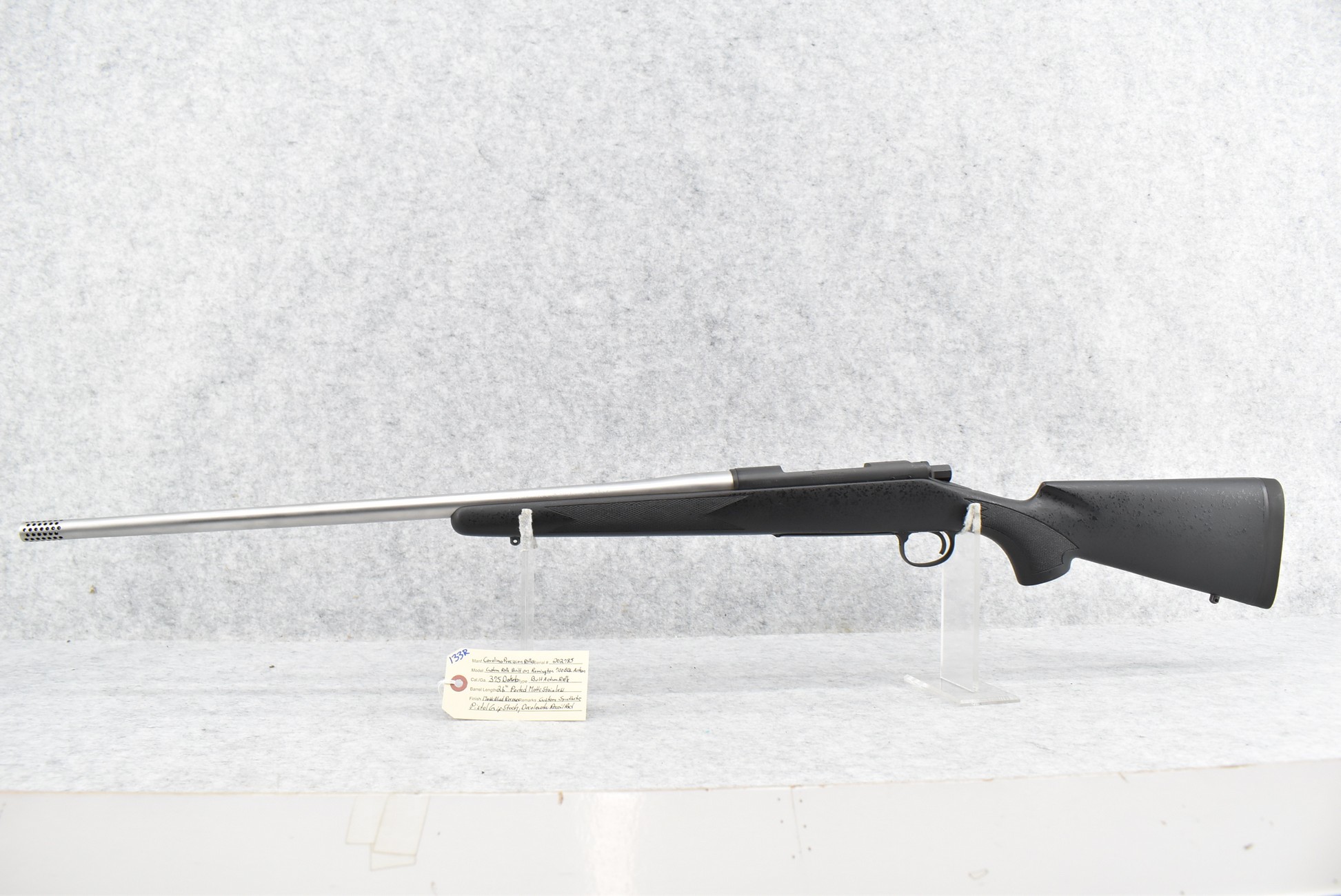 133R. Carolina Precision Rifles Custom Built Rifle Built on Remington Mod. 700 BDL Action – 375 Dakota Cal. Bolt Action Rifle – w/26” Matte Stainless Ported Barrel – Matte Blued Finish Receiver – w/Custom Synthetic Pistol Grip Stock w/Decelerator Recoil Pad