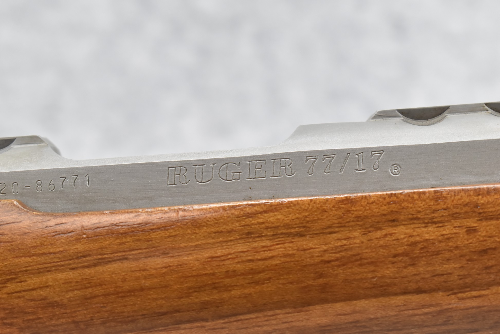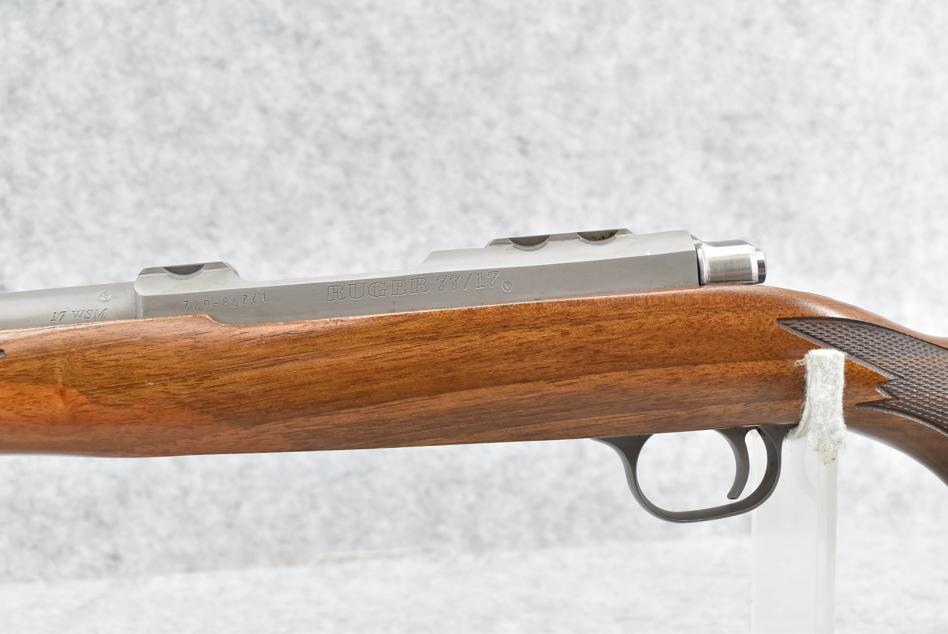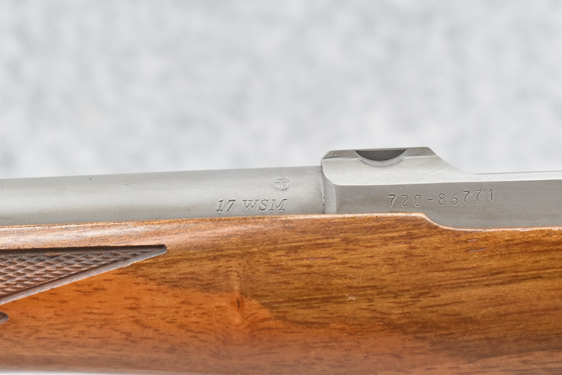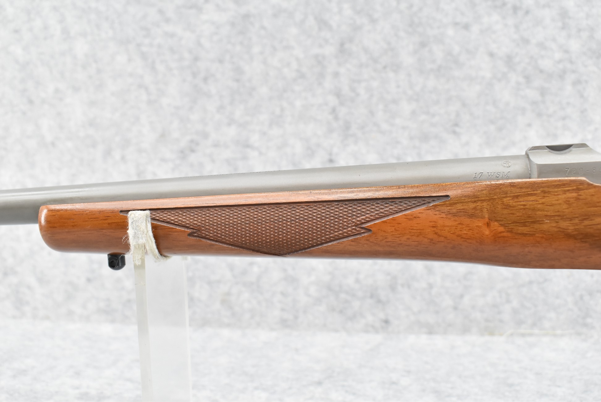 134R. Ruger – Mod. 77/17 – 17 WSM Cal. Bolt Action Rifle – w/24” Heavy Barrel – Matte Stainless Finish – w/Checkered Pistol Grip Wood Stock w/Factory Butt Pad – w/Factory 6Rd Detachable Magazine