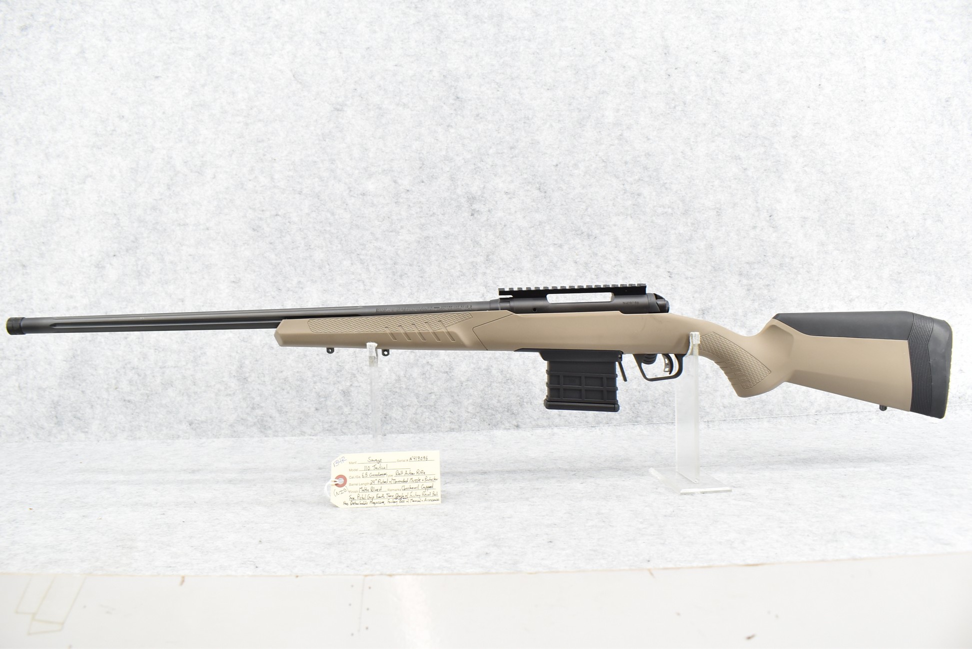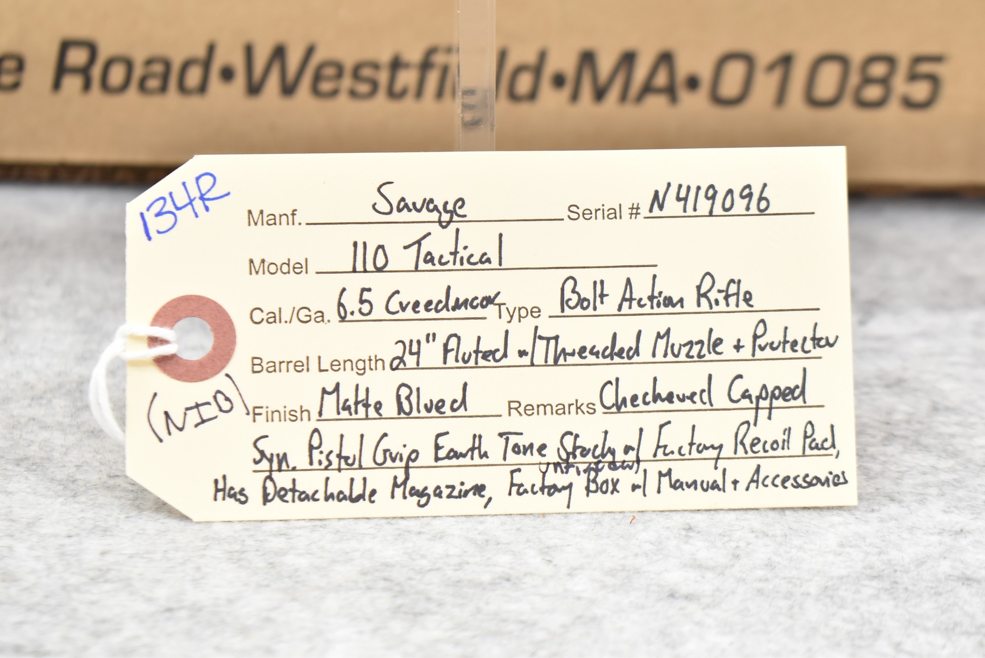 134R. Savage – Mod. 110 Tactical – 6.5 Creedmoor Cal. Bolt Action Rifle – w/24” Fluted Barrel w/Threaded Muzzle & Protector – Matte Blued Finish – w/Checkered Capped Synthetic Pistol Grip Earth Tone Finish Stock w/Factory Recoil Pad – w/Detachable Magazine – Unfired w/Factory Box, Manual & Accessories
