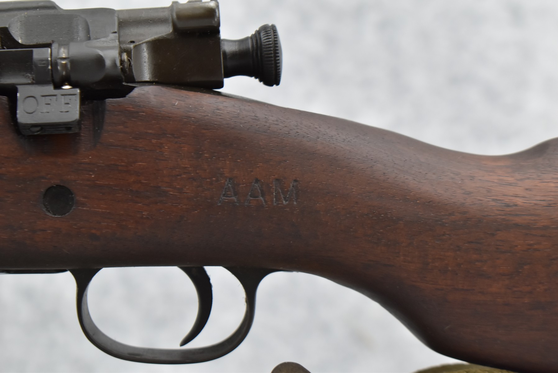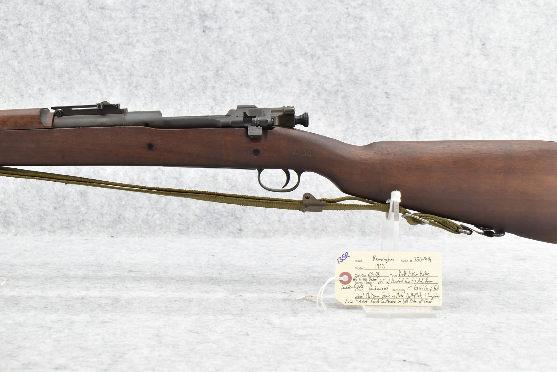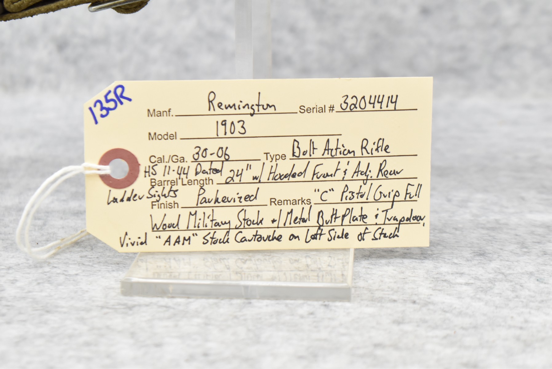 135R. Remington – Mod. 1903 – 30-06 Cal. Bolt Action Rifle – w/24” HS 11-44 Dated Barrel w/Hooded Front & Adj. Rear Ladder Sights – Parkerized Finish – w/“C” Pistol Grip Full Wood Military Stock w/Metal Butt Plate & Trapdoor – w/Vivid “AAM” Stock Cartouche on Left Side of Stock