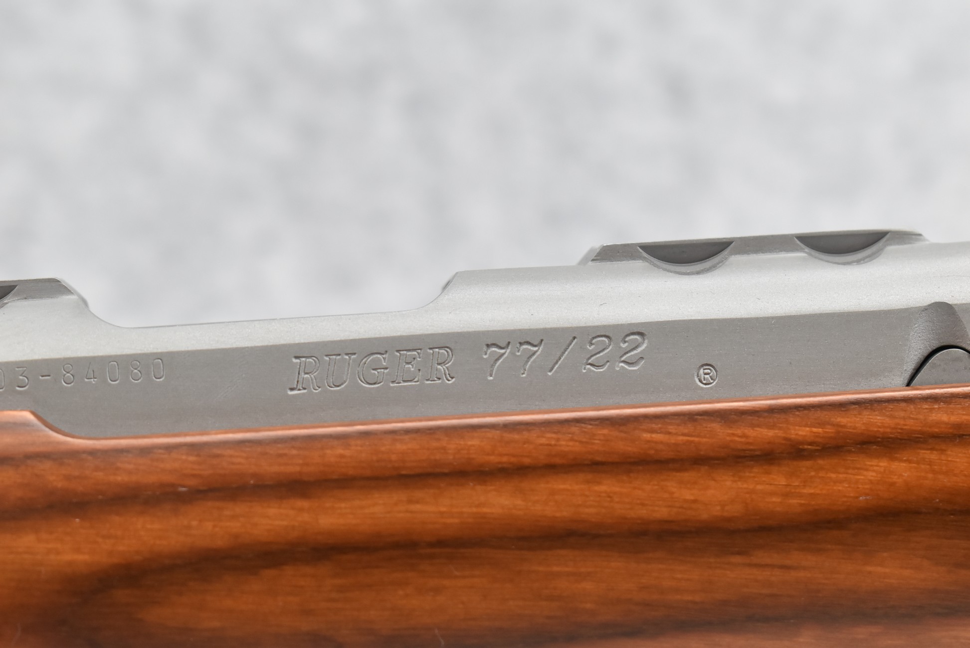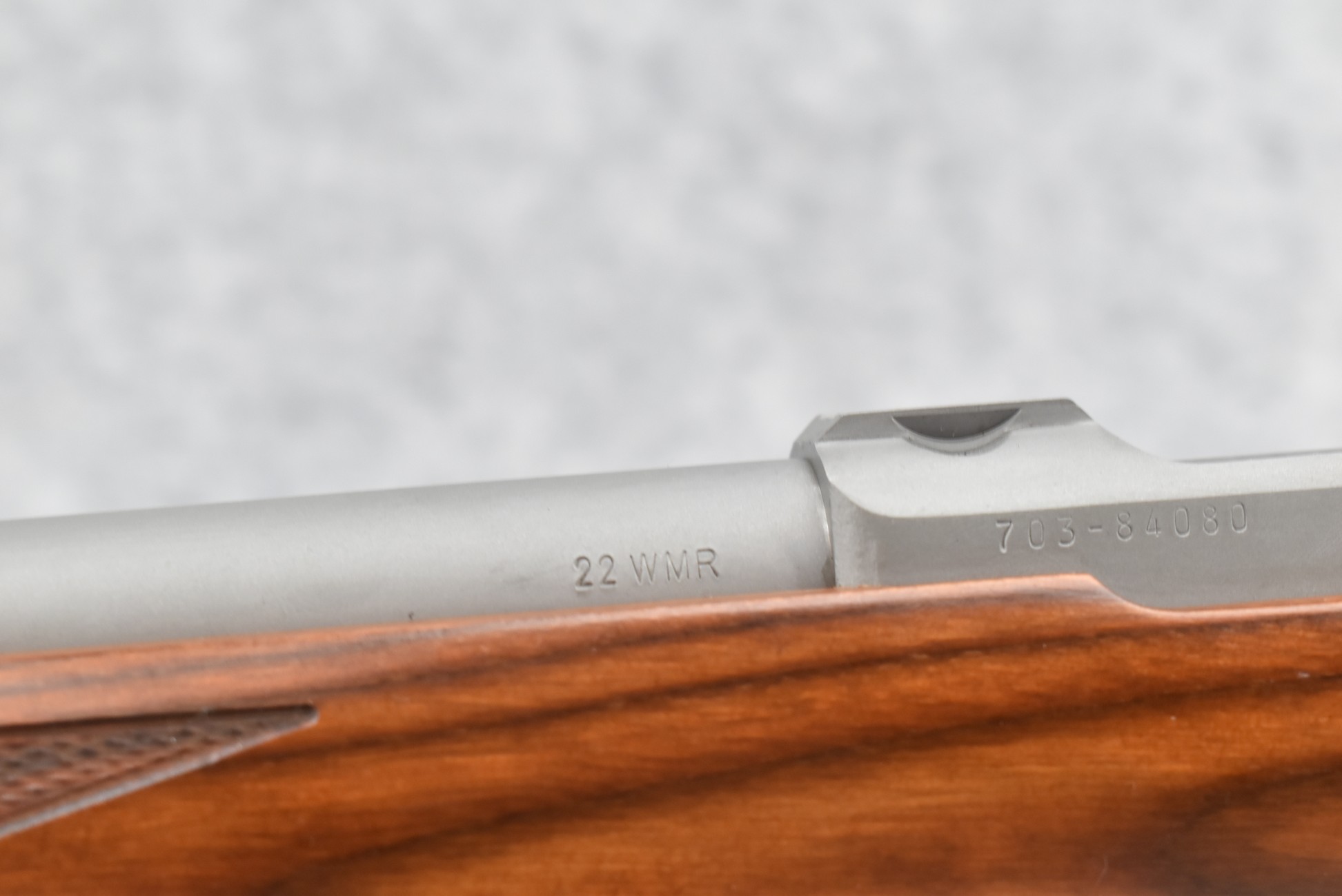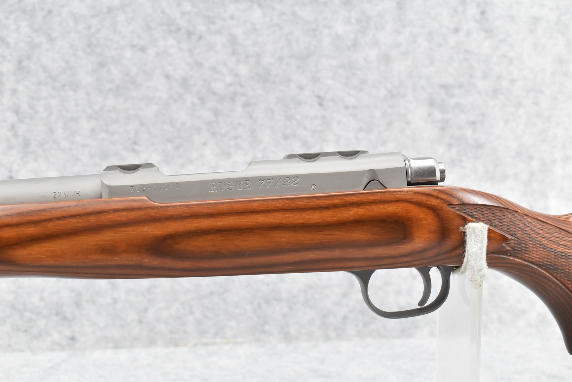 135R. Ruger – Mod. 77/22-VMBZ – 22 WMR Cal. Bolt Action Rifle – w/24” Heavy Barrel – Matte Stainless Finish – w/Deluxe Checkered Pistol Grip Brown Laminated Wood Stock w/Factory Butt Pad – w/Factory Detachable Magazine