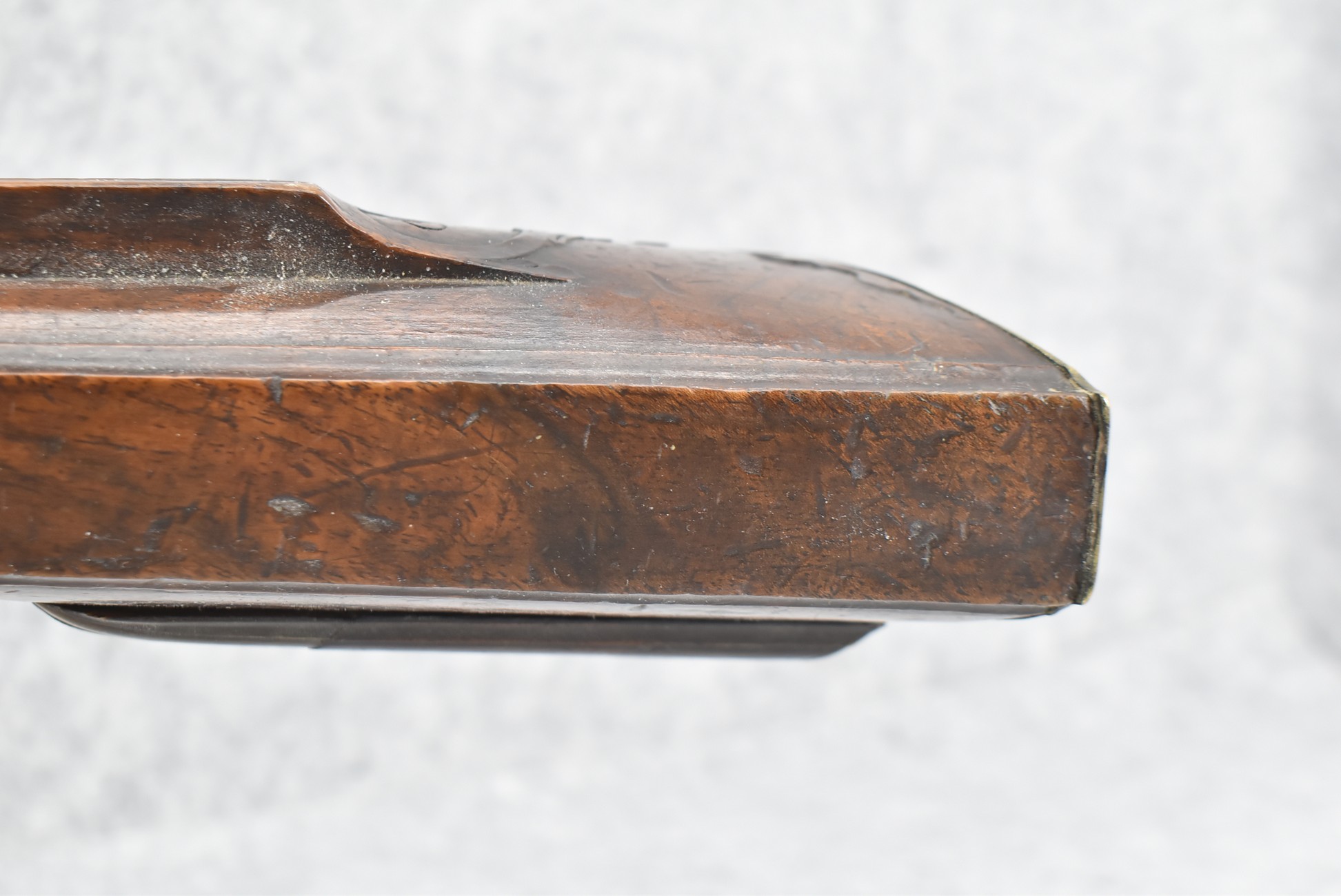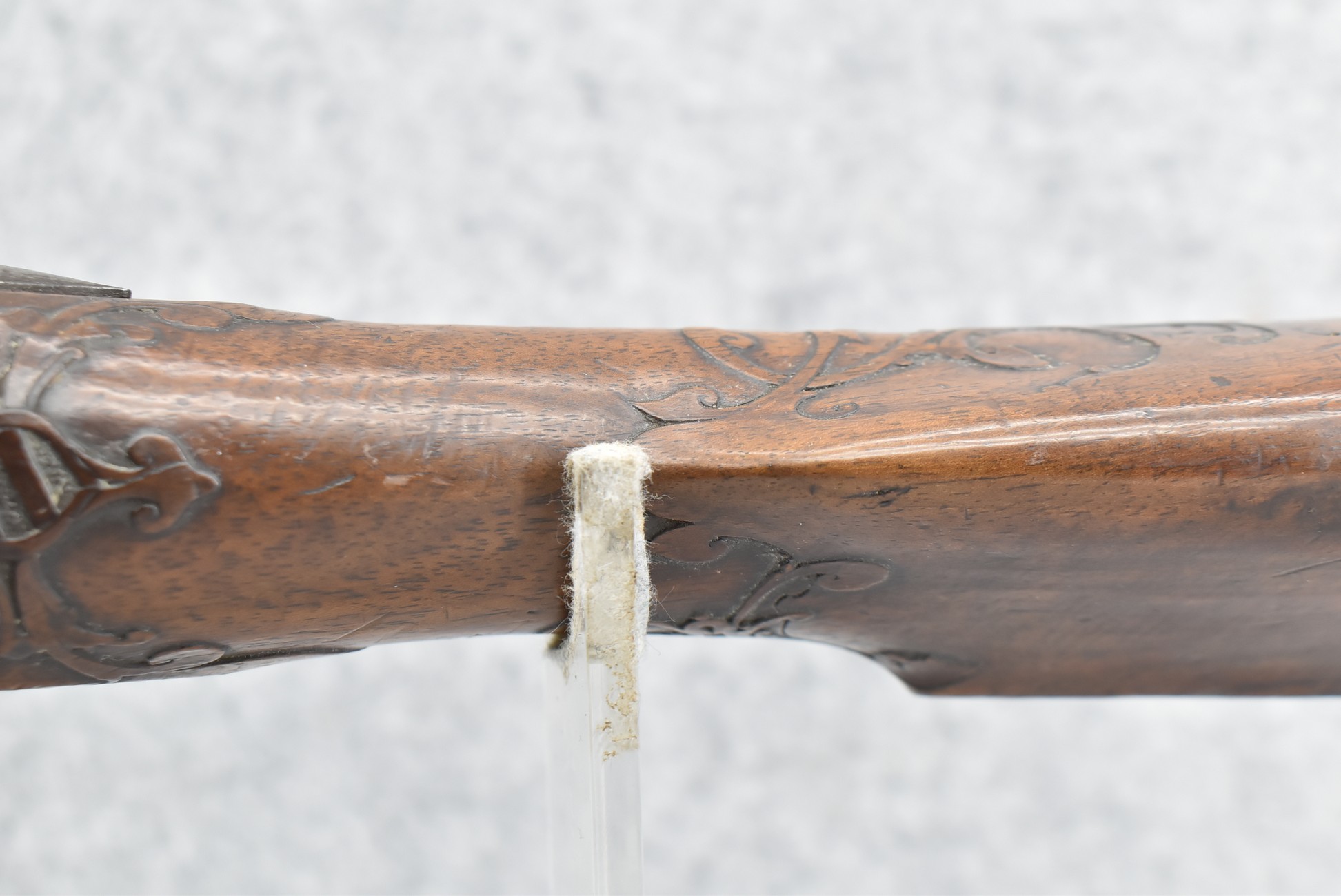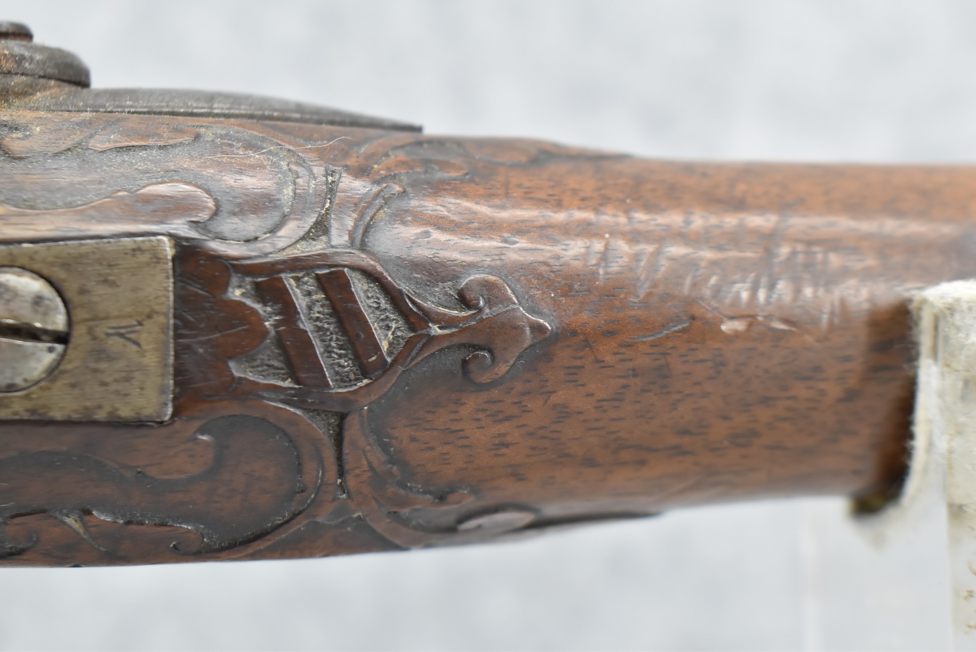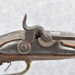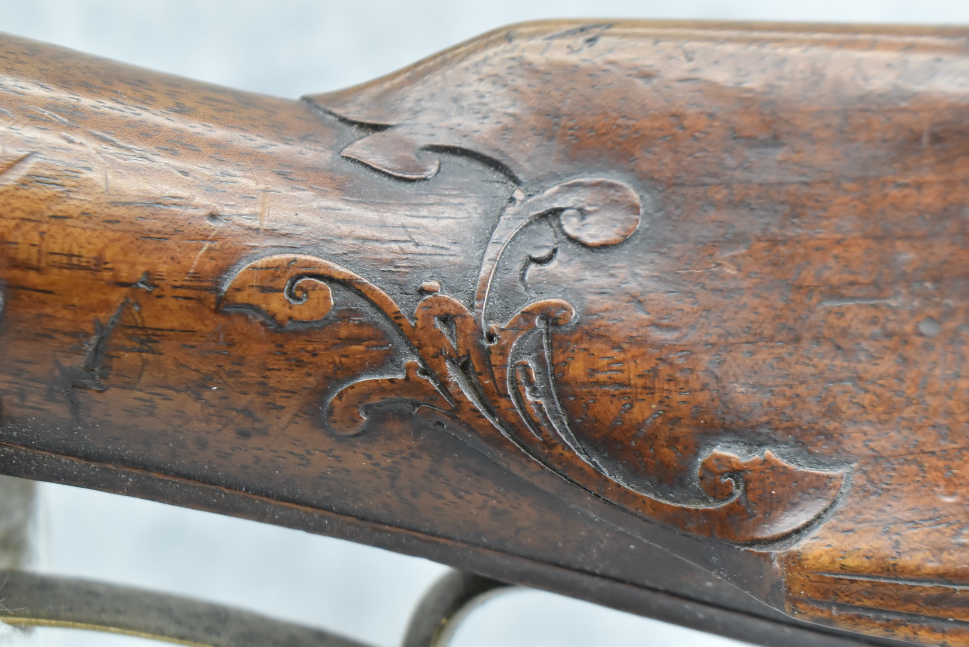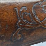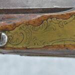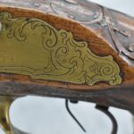 136. Signed JoHann Bayer in Wirtzburg – 62 Cal. Rifled Percussion Black Powder Single Shot Rifle – w/28” Heavy Octagon Barrel w/Brass Front & Dual Flip Rear Barrel Sights – w/Wooden Over Sized Full Stock w/Wooden Sliding Deer Patch Box, Relief Carved & Cheek Piece w/Brass Furniture – w/Double Set Triggers – A Very Ornate Early Black Powder Full Stock Rifle w/Brass Ram Rod