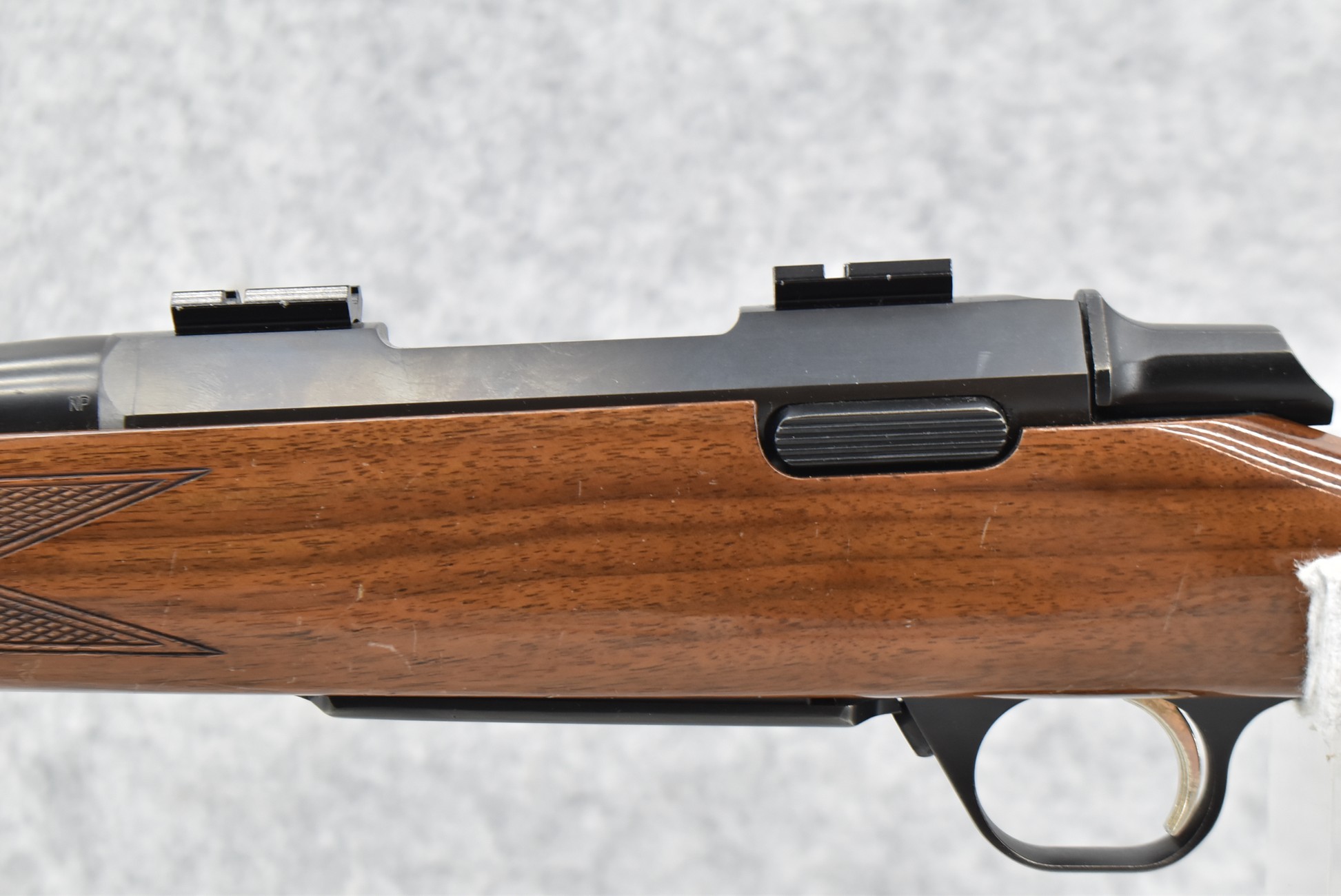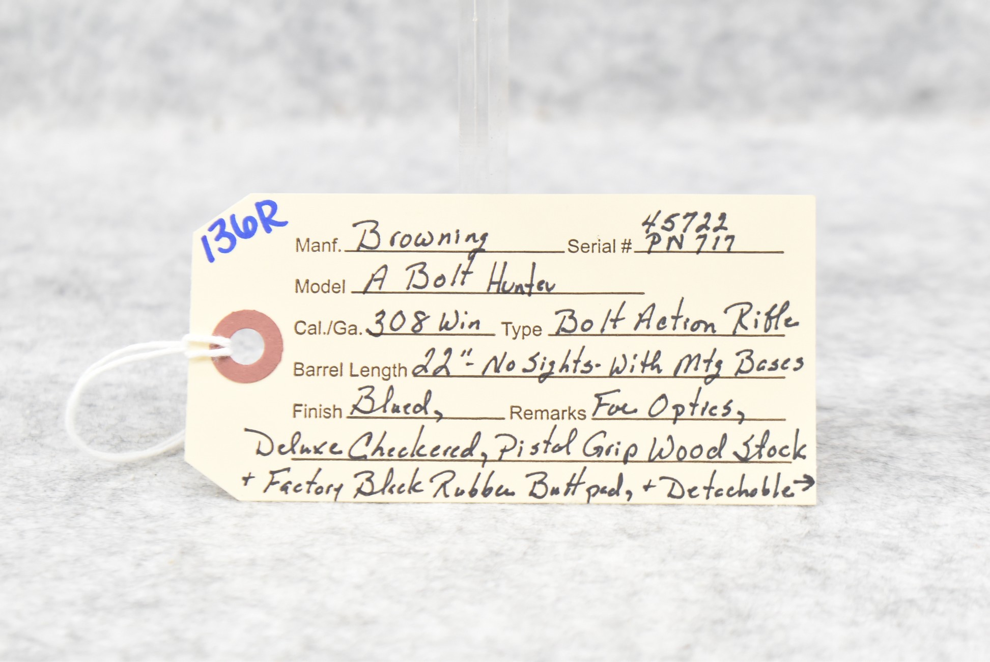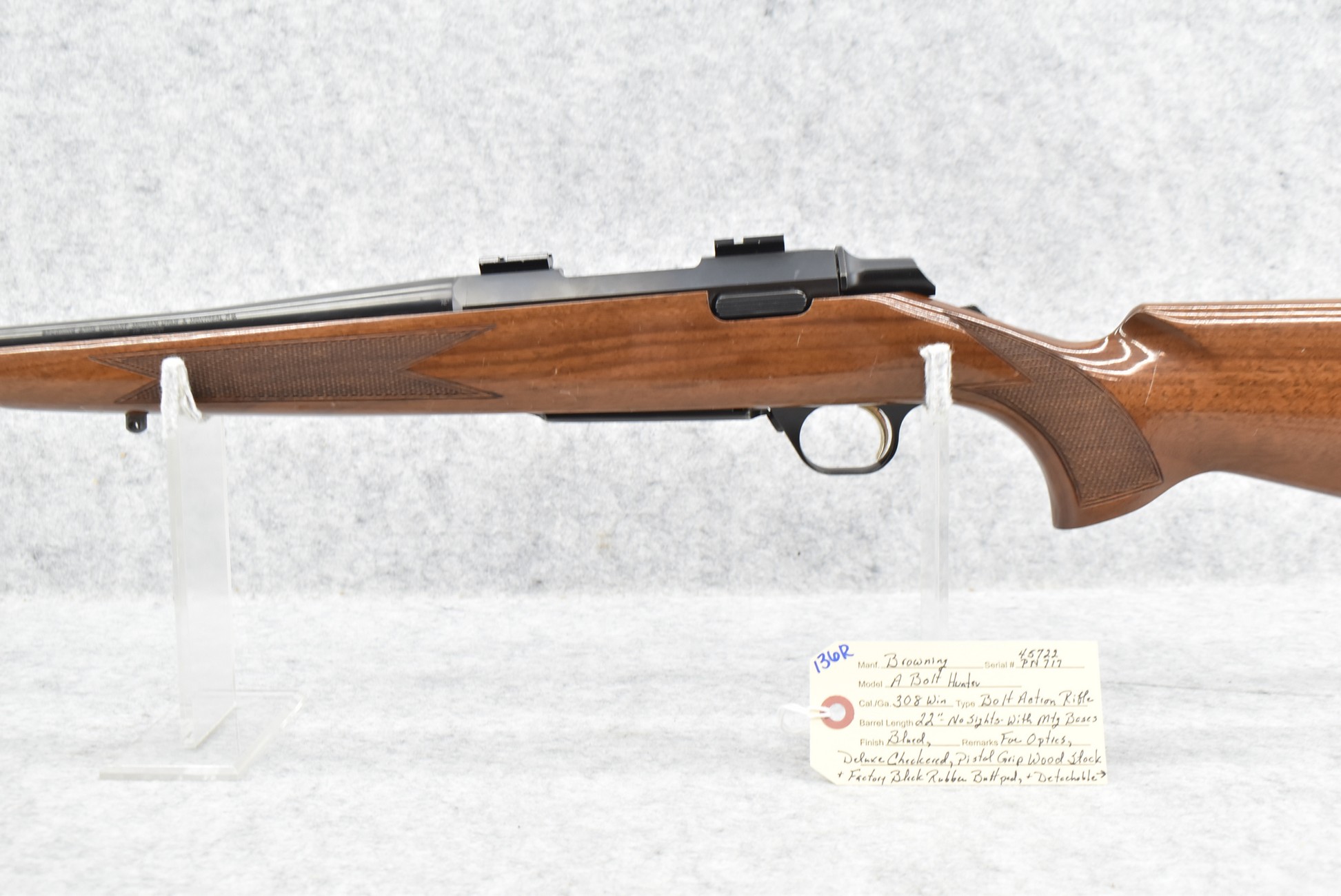 136R. Browning – Mod. A-Bolt Hunter – 308 Win. Cal. Bolt Action Rifle – w/22” Barrel w/Mounting Bases for Optics and No Sights – Blued Finish – w/Deluxe Checkered Pistol Grip Wood Stock w/Factory Black Rubber Butt Pad – w/Detachable Magazine