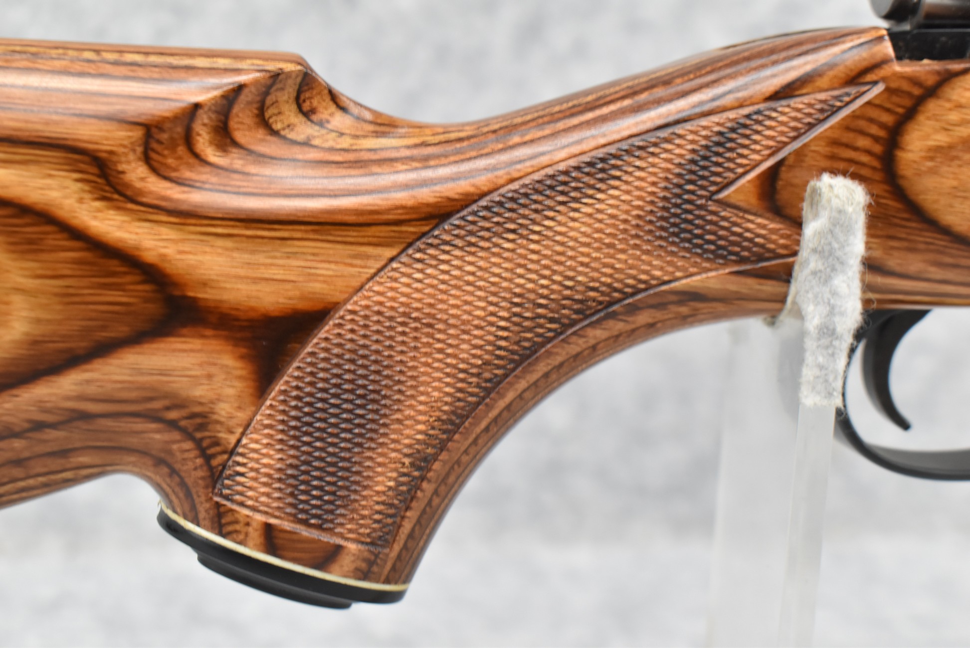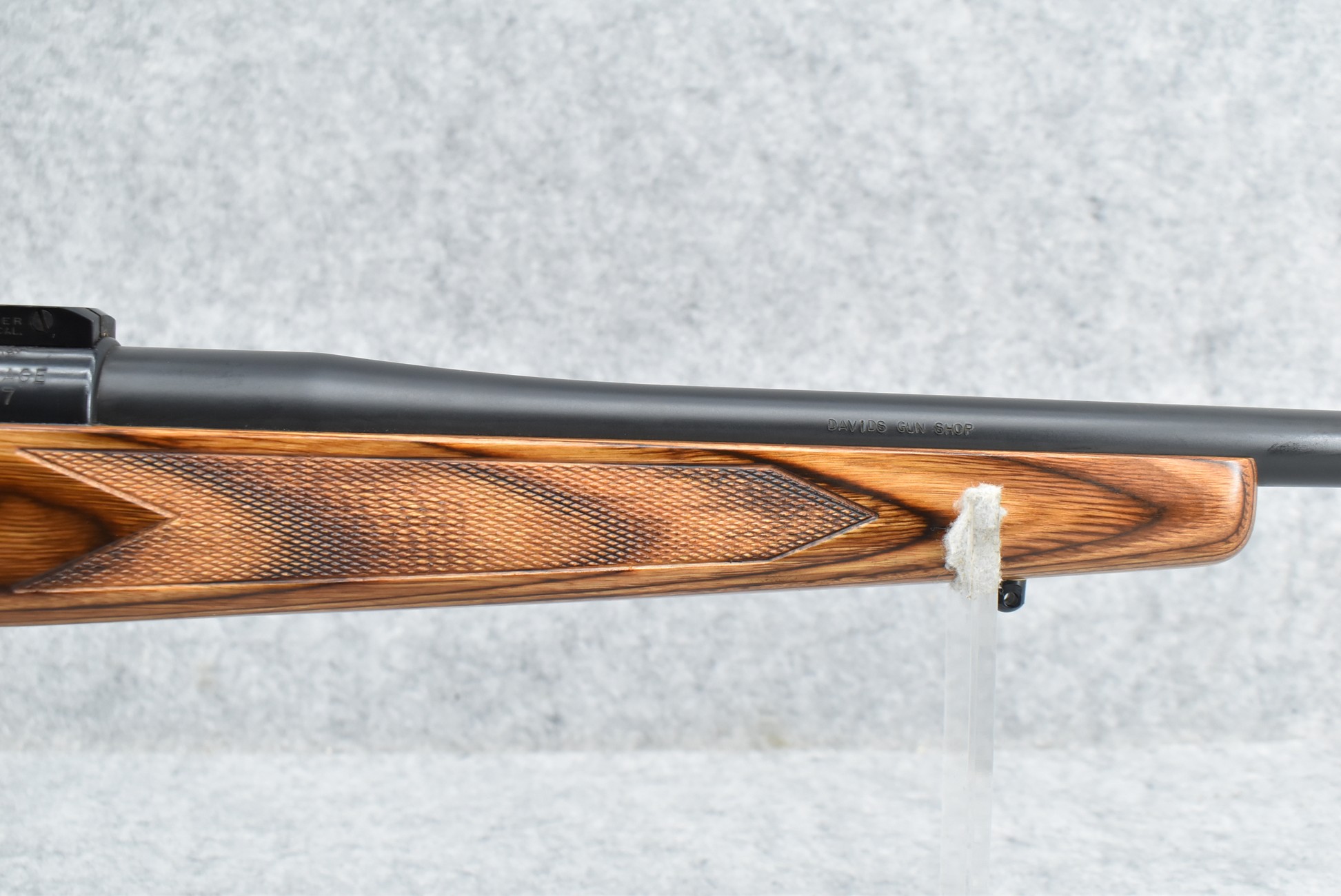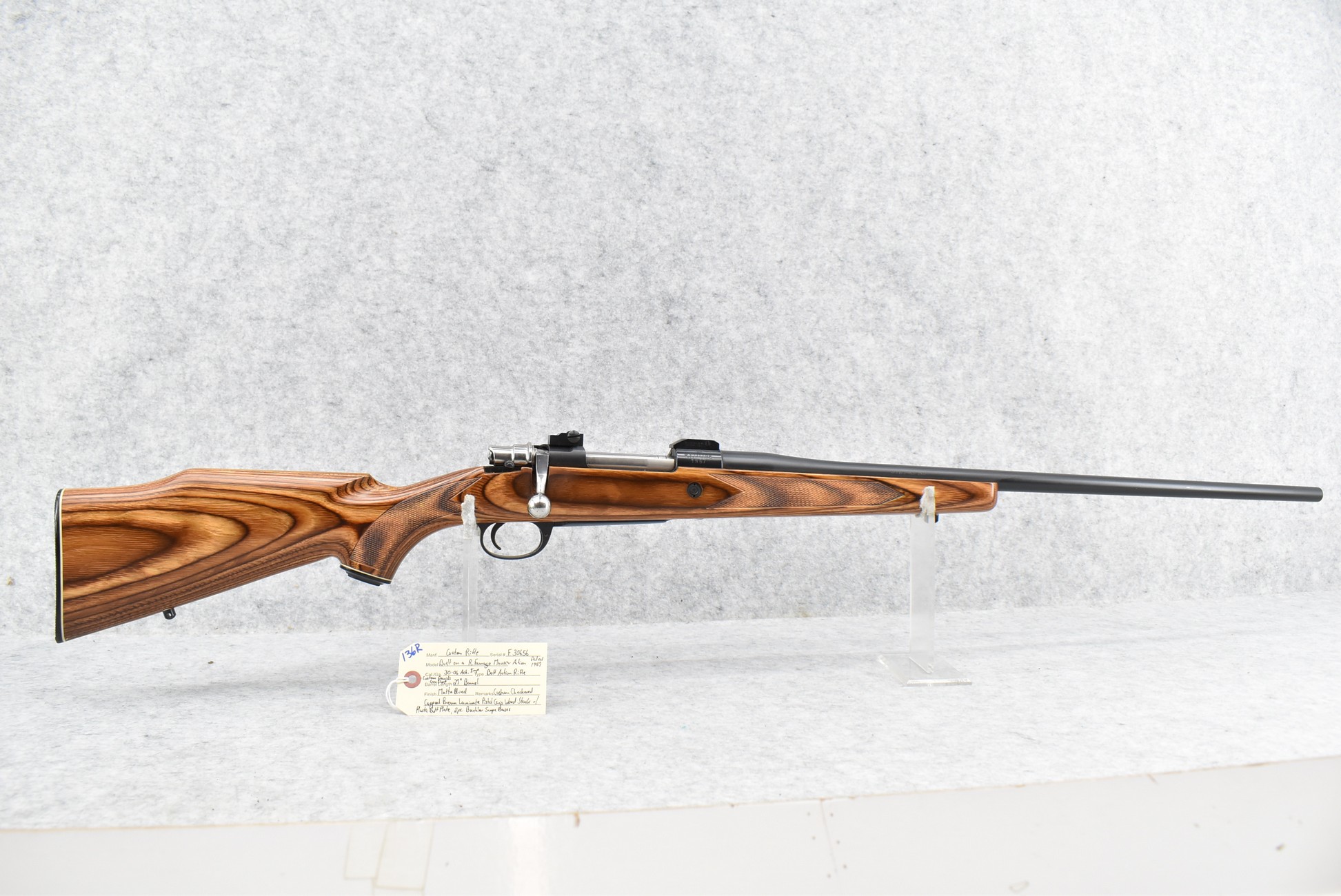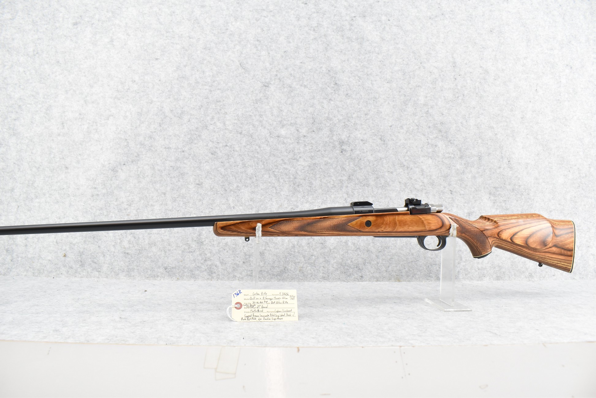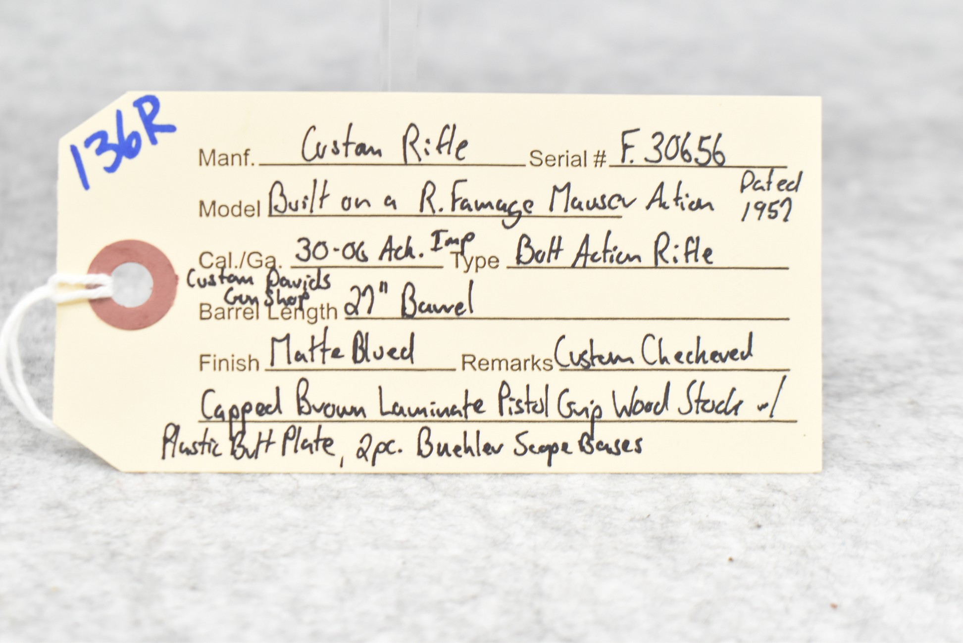 136R. Custom Rifle – Buitl on a R. Famage Mauser Action Dated 1957 – 30-06 Ack. Imp. Cal. Bolt Action Rifle – w/Custom 27” Davids Gun Shop Barrel – Matte Blued Finish – w/Custom Checkered Capped Brown Laminate Pistol Grip Wood Stock w/Plastic Butt Plate – w/2pc. Buehler Scope Bases
