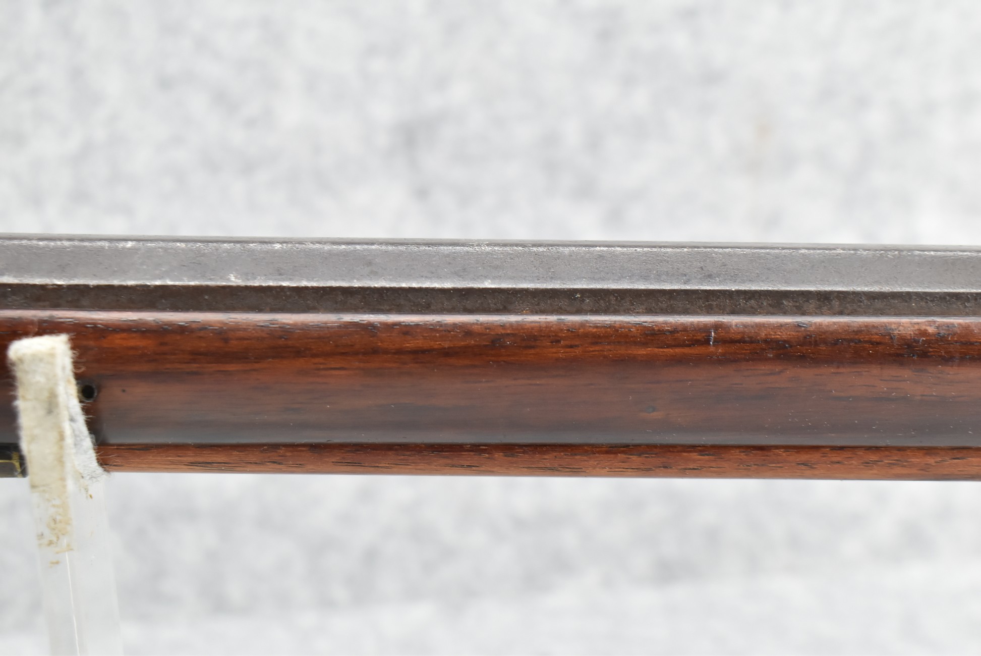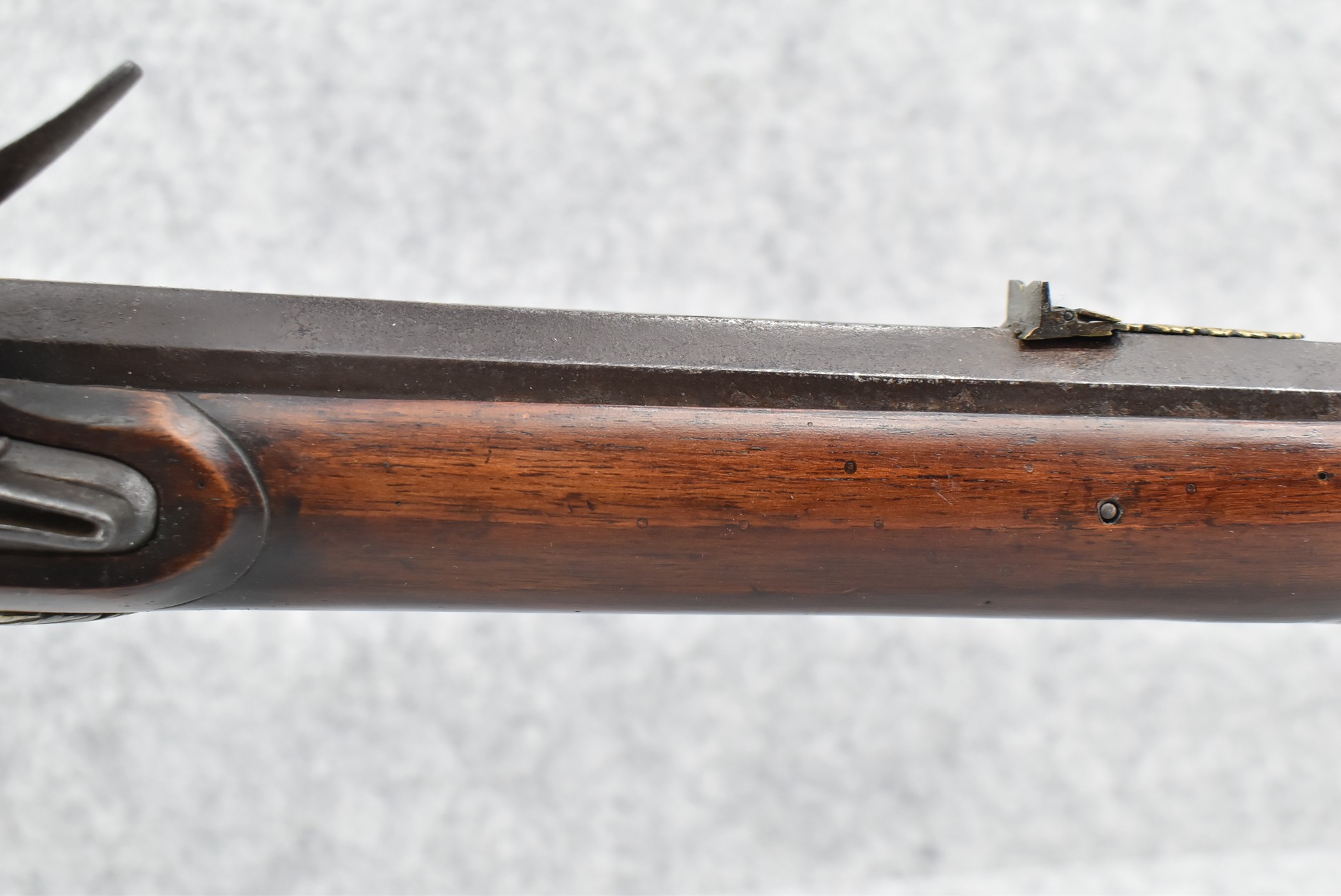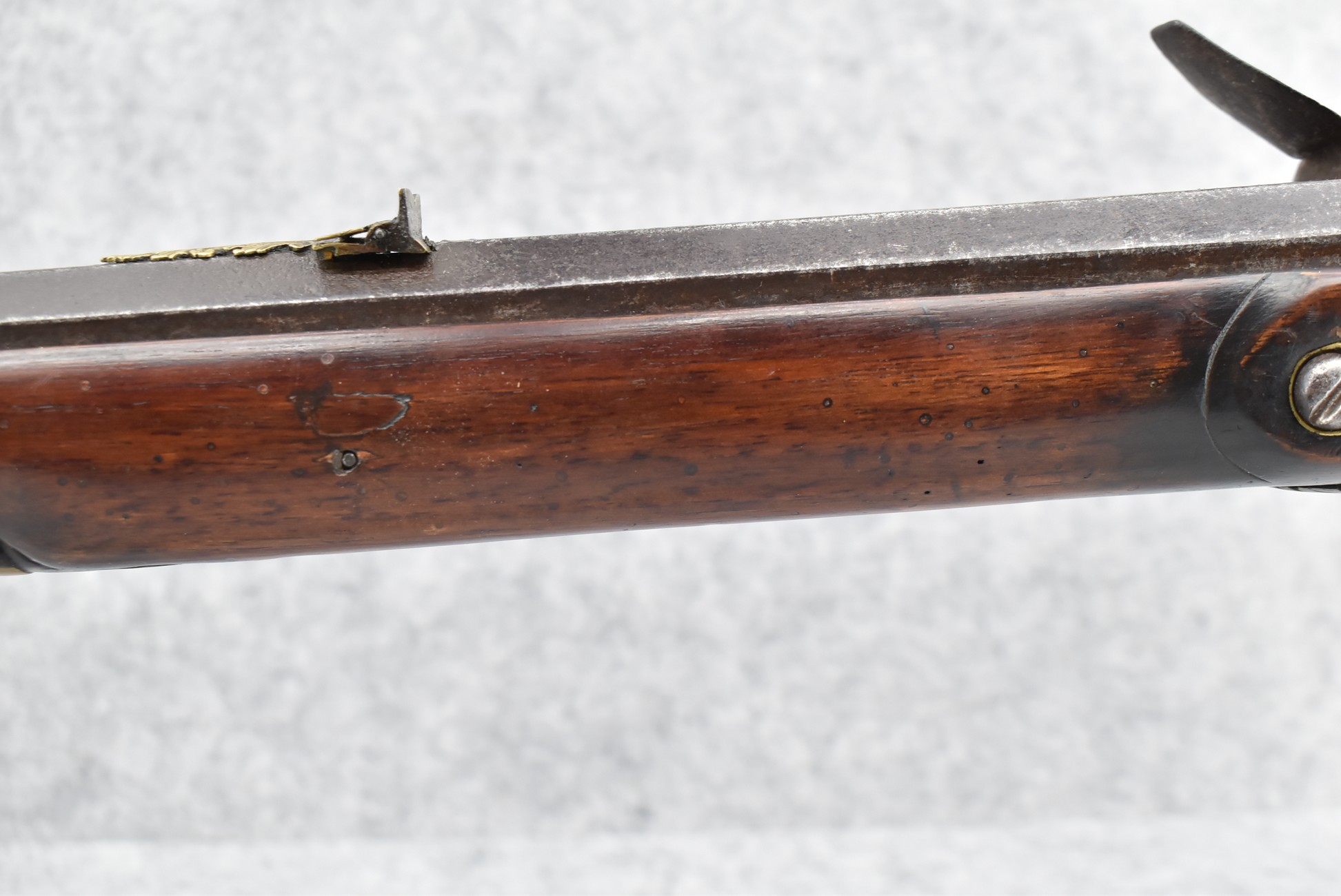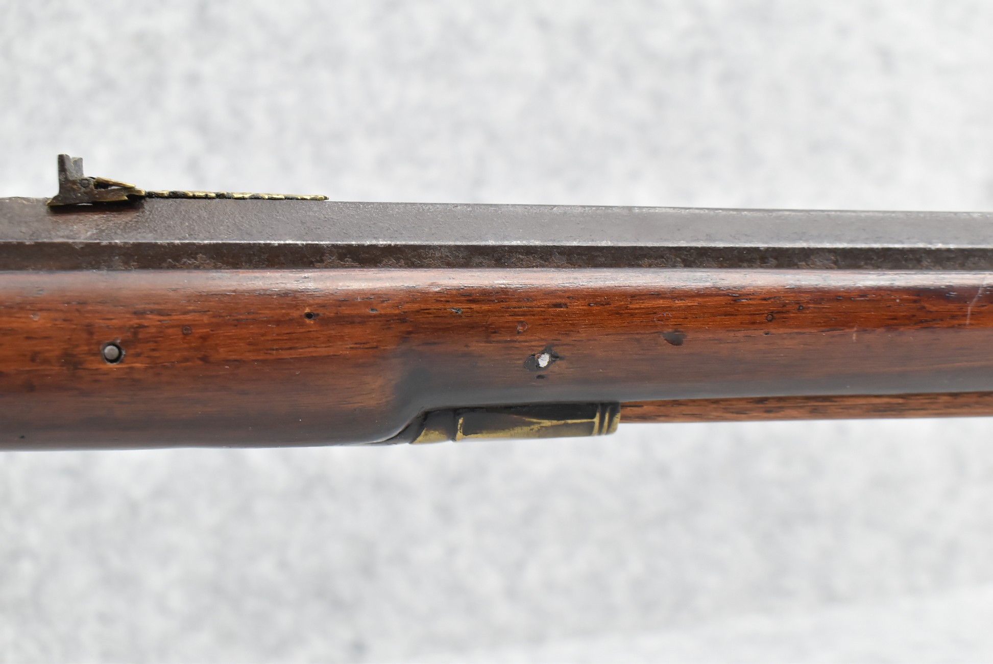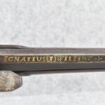 137. Antique 70 Cal. Flintlock Black Powder Rifle – w/34” Heavy Octagon Rifled Barrel w/Brass Front & Flip Rear Barrel Sights – Barrel is Gold Etched Marked “Ignatius Wilfing” – w/Full Stock w/Over Sized Butt Stock w/Cheek Piece w/Unique Slide Wood Door Patch Box w/Brass Furniture – w/Sling Swivels – w/Double Set Triggers – w/Wooden Ram Rod