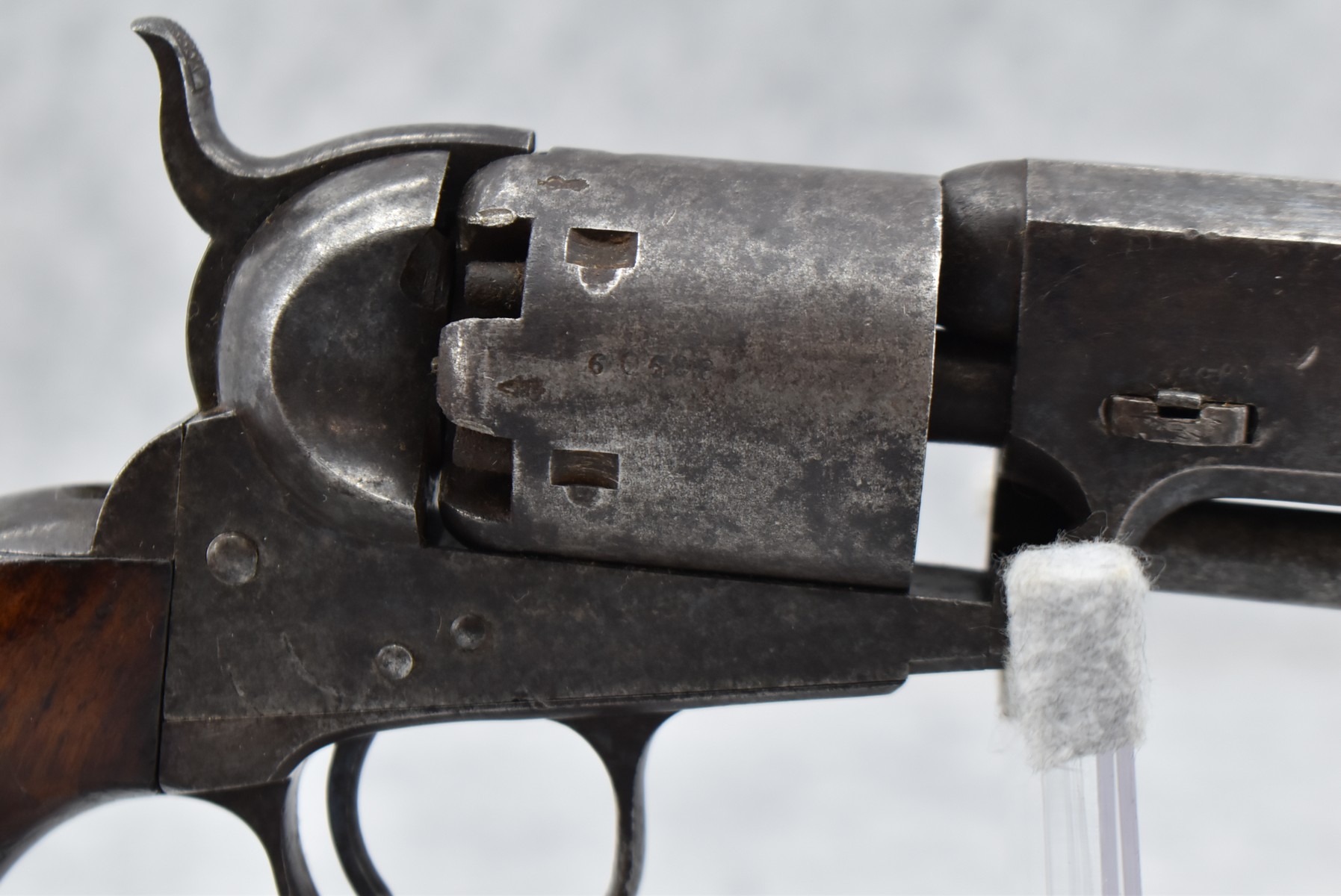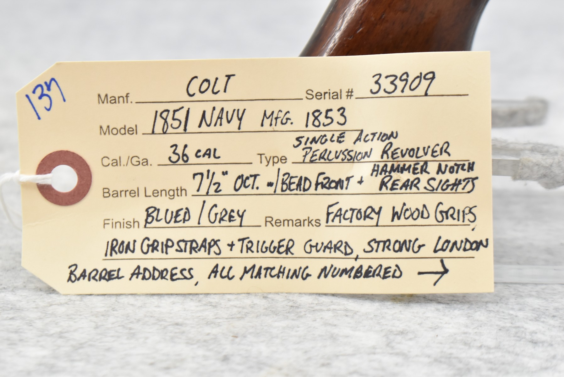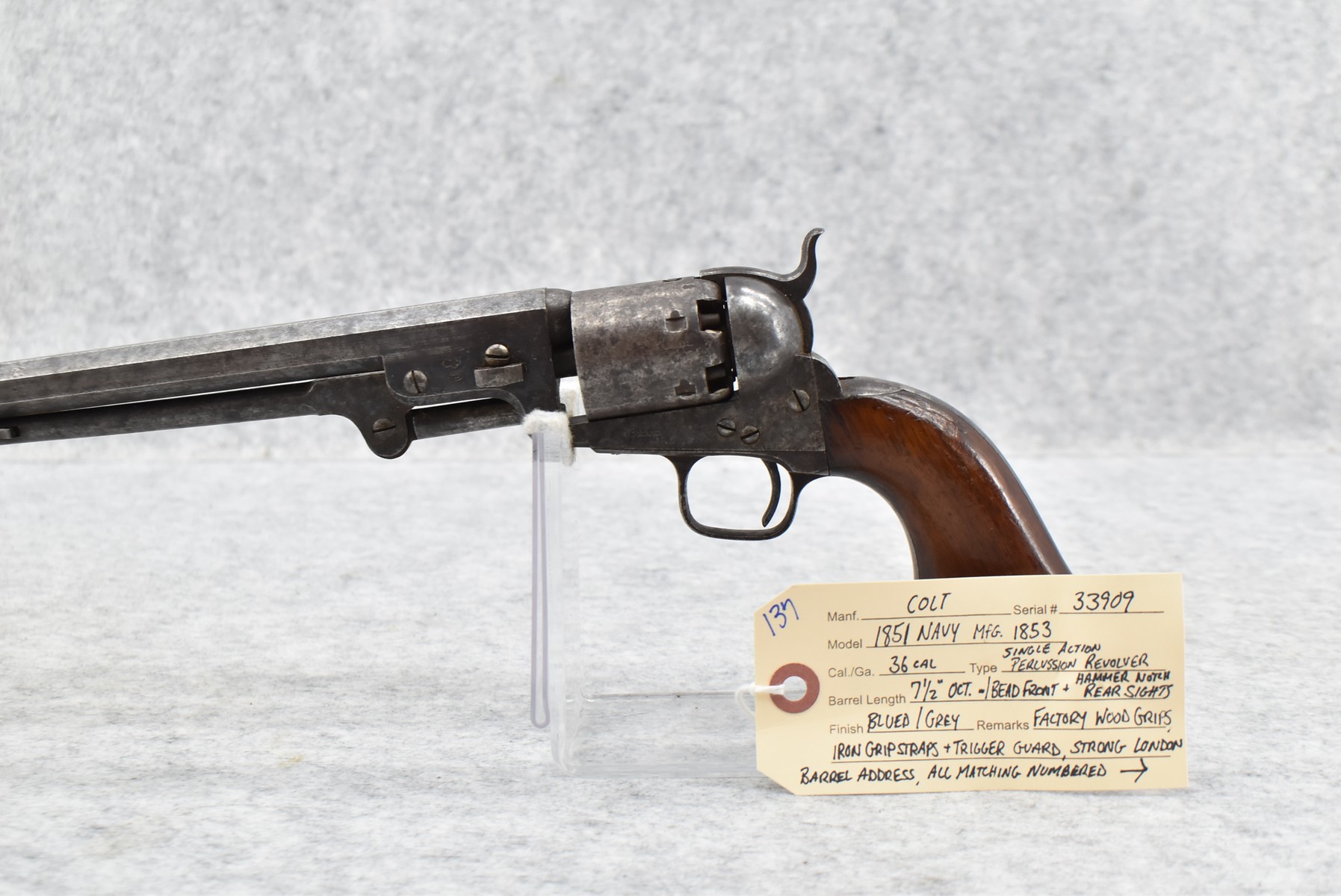 137. Colt – Mod. 1851 Navy – 36 Cal. Single Action Percussion Revolver – w/7 ½” Octagon Barrel w/Bead Front & Hammer Notch Rear Sights – Blued/Gray Finish – w/Factory Wood Grips – w/Iron Grip Straps & Trigger Guard – w/Strong London Barrel Address – All Matching Numbered – w/Unusual Markings on Barrel – Mfg. 1853