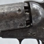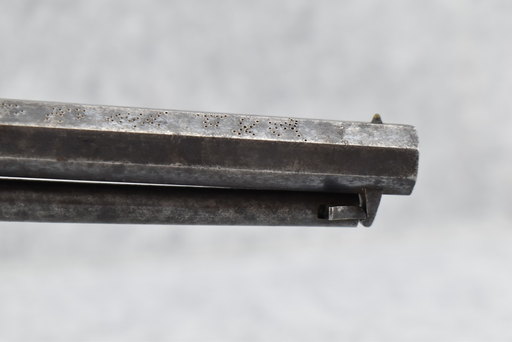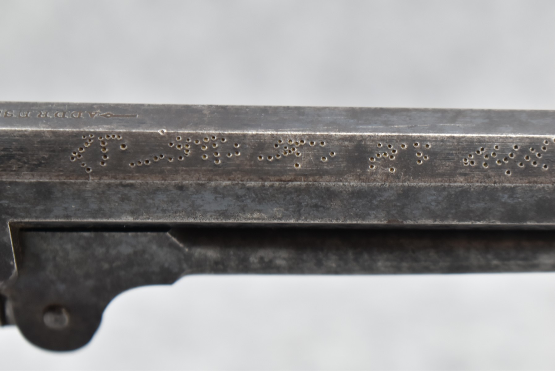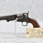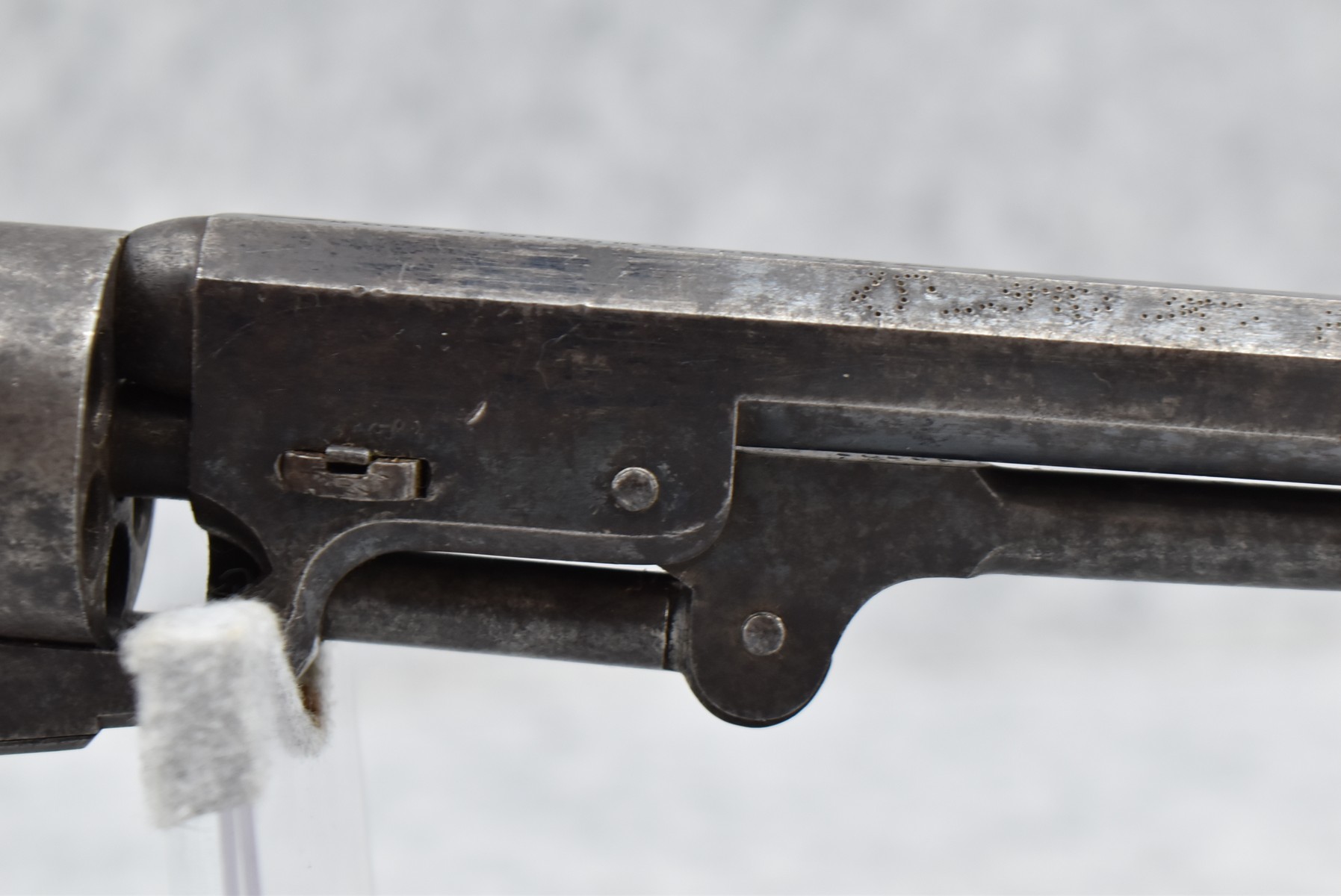 137. Colt – Mod. 1851 Navy – 36 Cal. Single Action Percussion Revolver – w/7 ½” Octagon Barrel w/Bead Front & Hammer Notch Rear Sights – Blued/Gray Finish – w/Factory Wood Grips – w/Iron Grip Straps & Trigger Guard – w/Strong London Barrel Address – All Matching Numbered – w/Unusual Markings on Barrel – Mfg. 1853