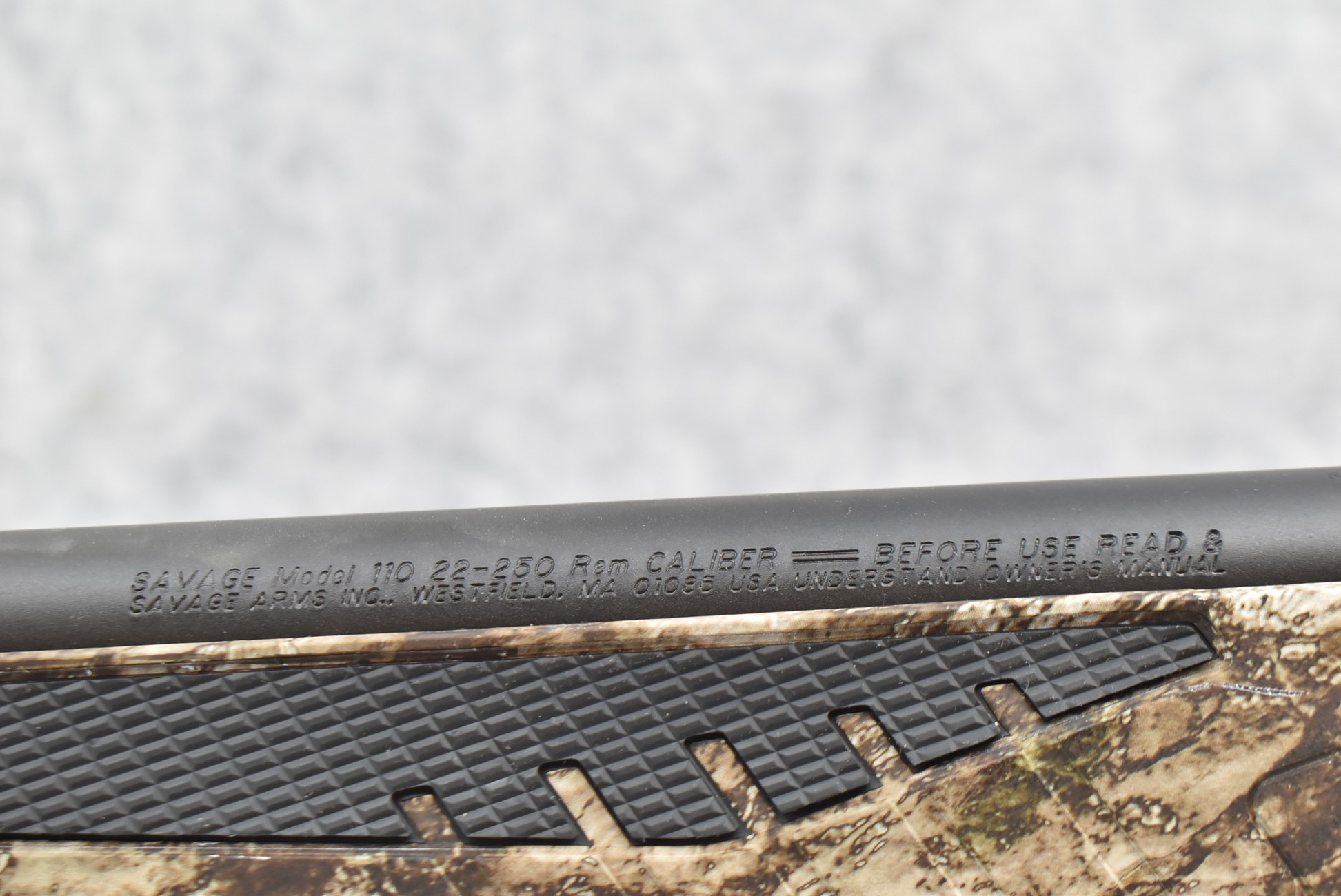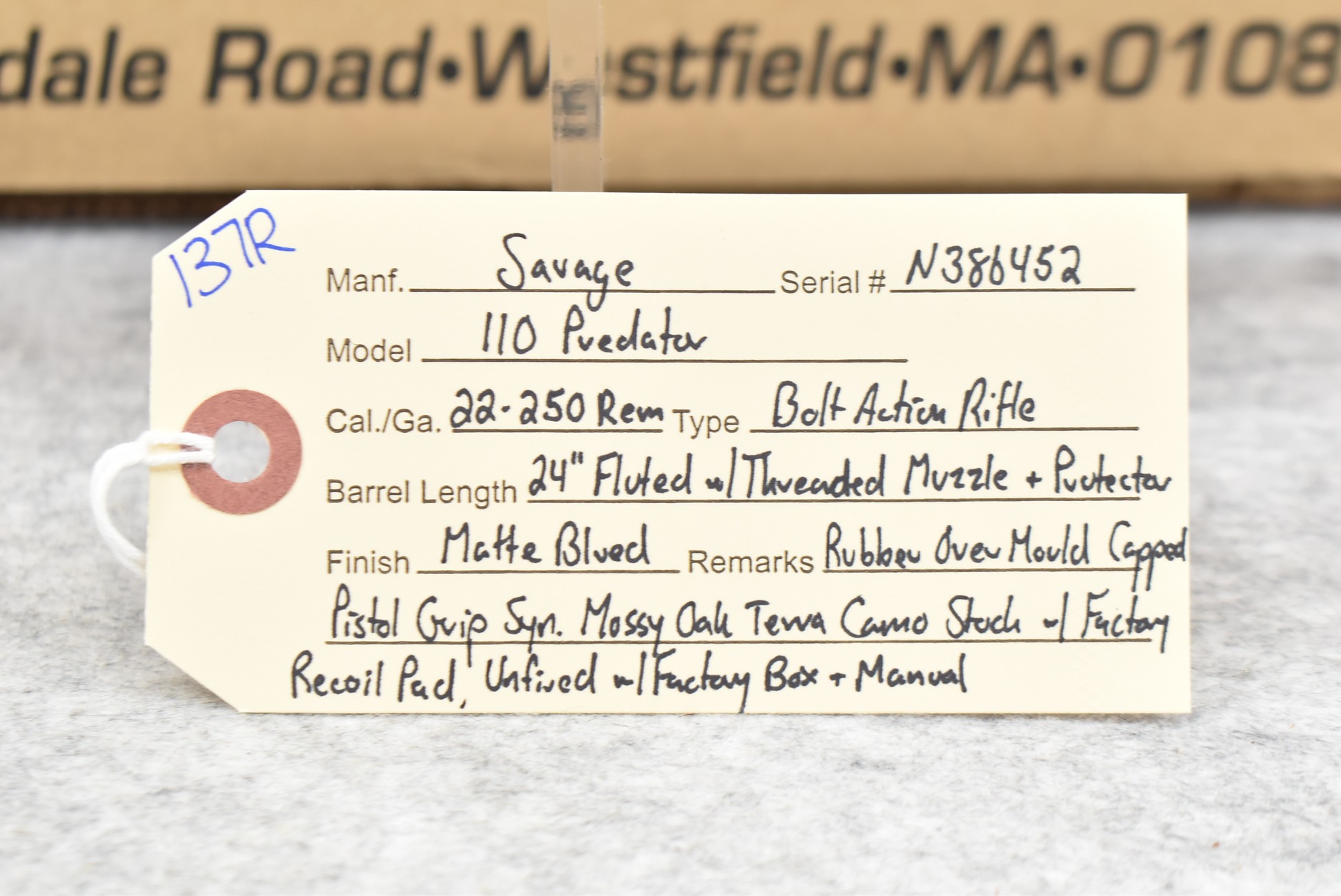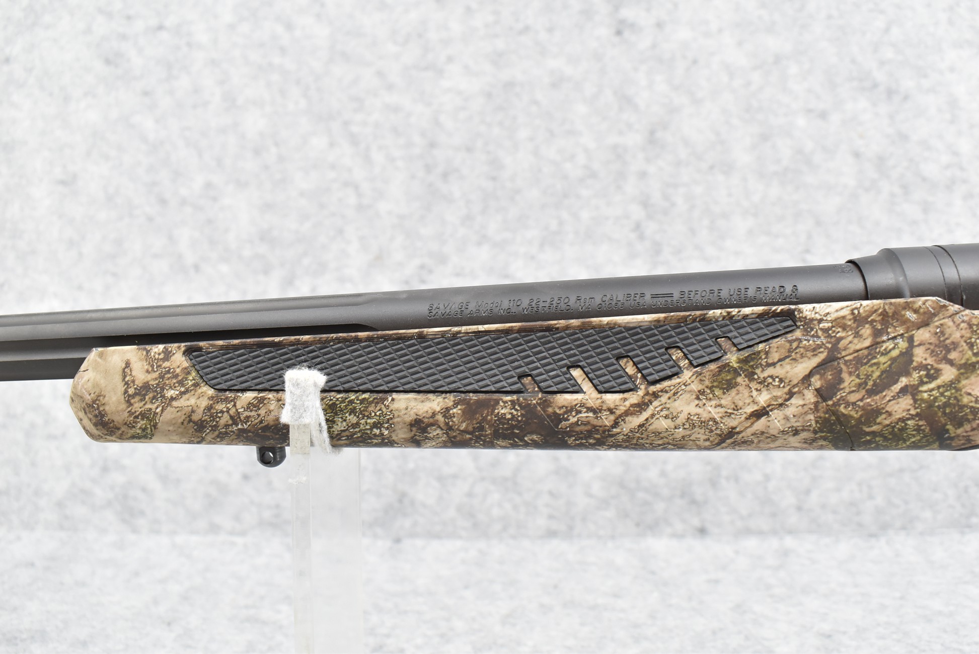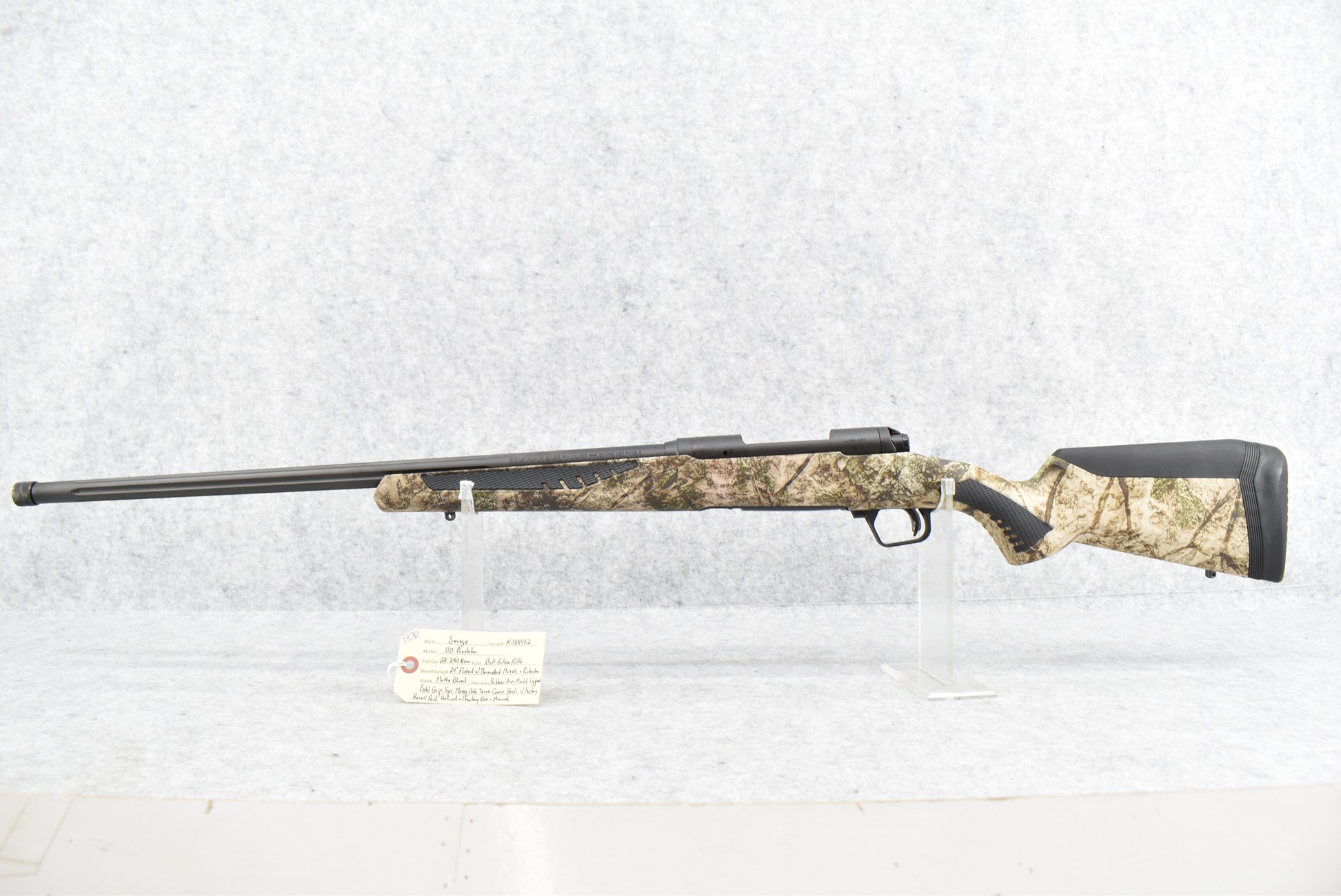 137R. Savage – Mod. 110 Predator – 22-250 Rem. Cal. Bolt Action Rifle – w/24” Fluted Barrel w/Threaded Muzzle & Protector – Matte Blued Finish – w/Rubber Over Mold Capped Pistol Grip Synthetic Mossy Oak Camo Stock w/Factory Recoil Pad – Unfired w/Factory Box & Manual