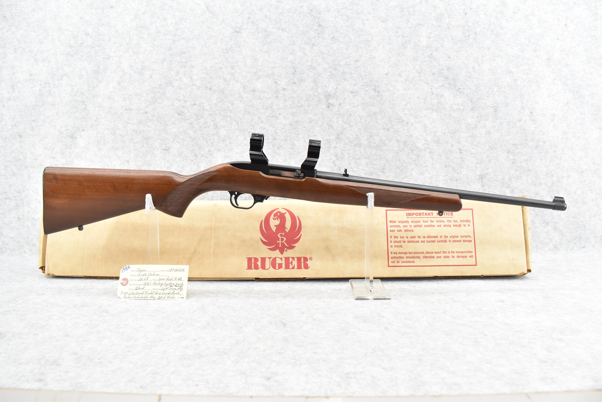 138R. Ruger – Mod. 10/22 Carbine – 22LR Cal. Semi-Auto Rifle – w/18½” Barrel w/Factory Sights – Blued Finish – w/Checkered Pistol Grip Wood Stock w/Butt Plate – w/Factory Detachable Magazine – w/Kwik See-Through Mounts – w/Factory Box