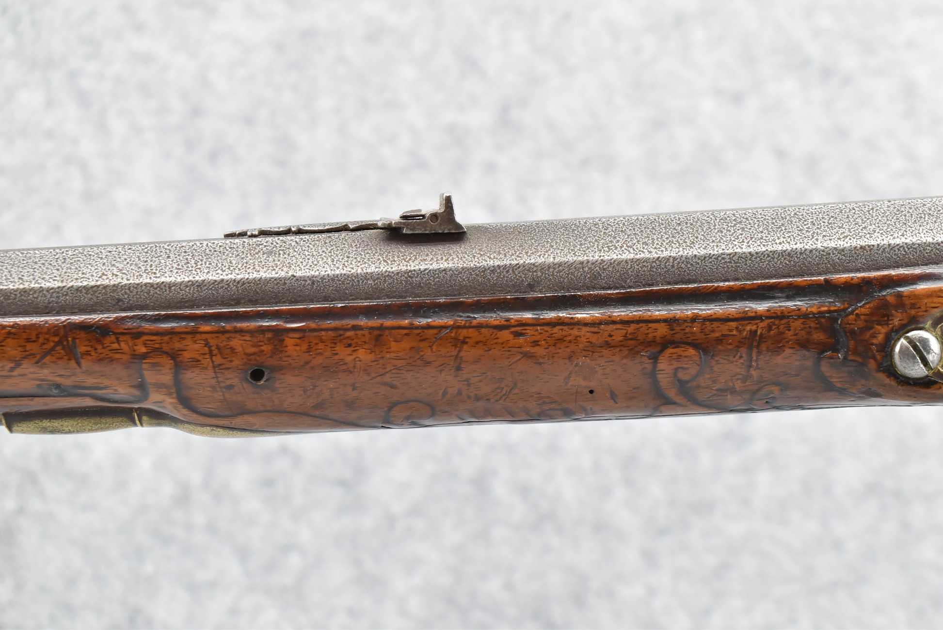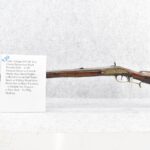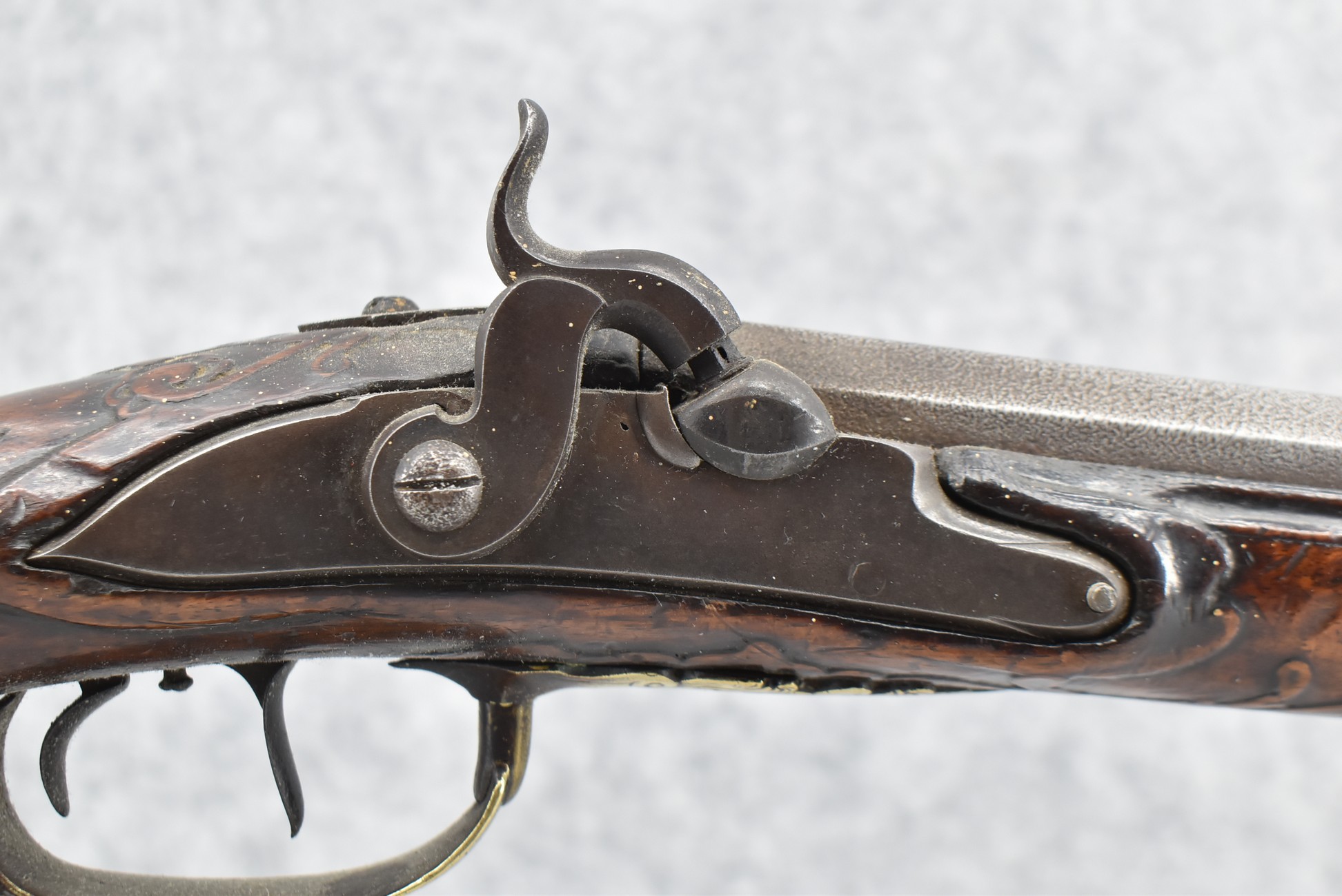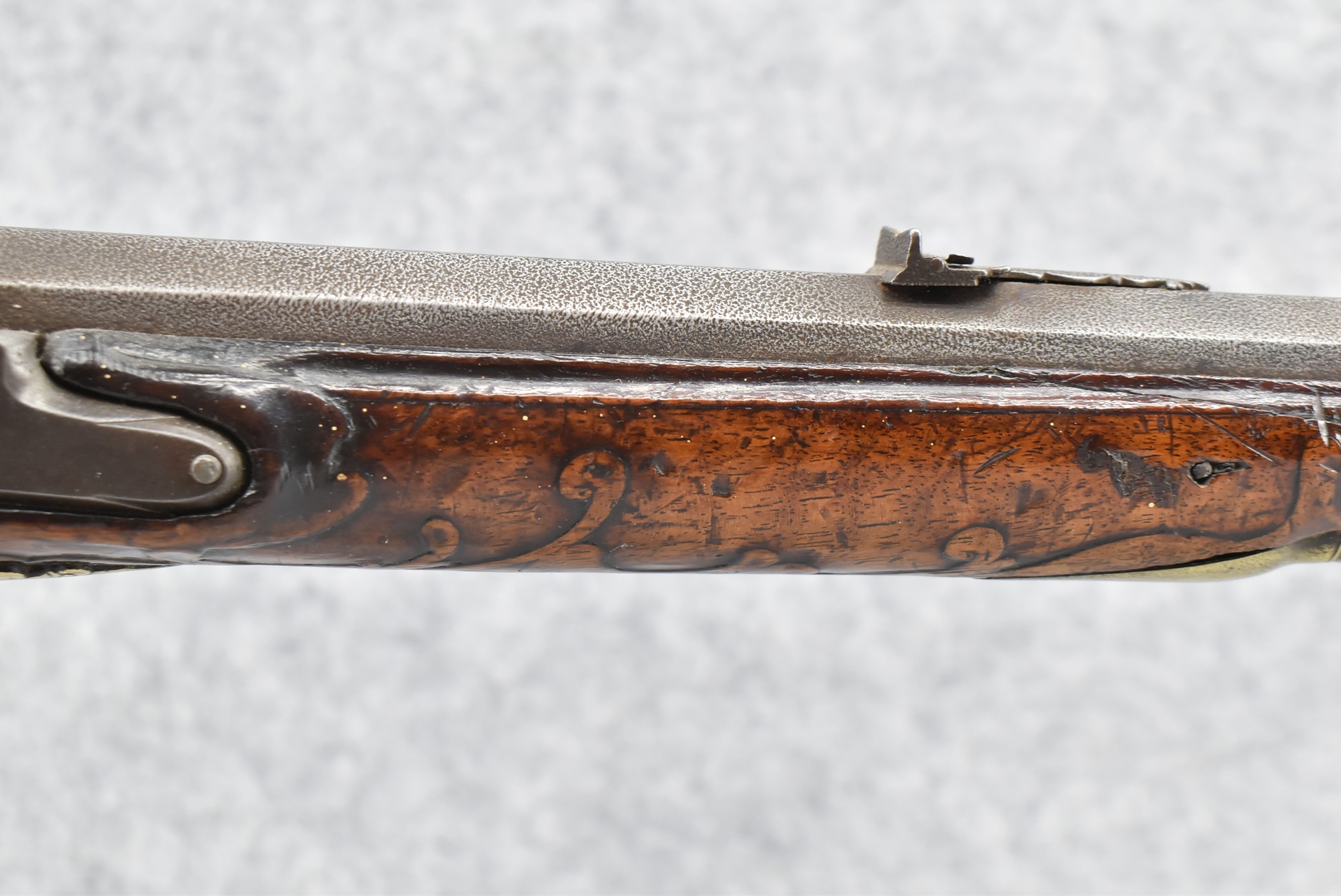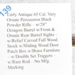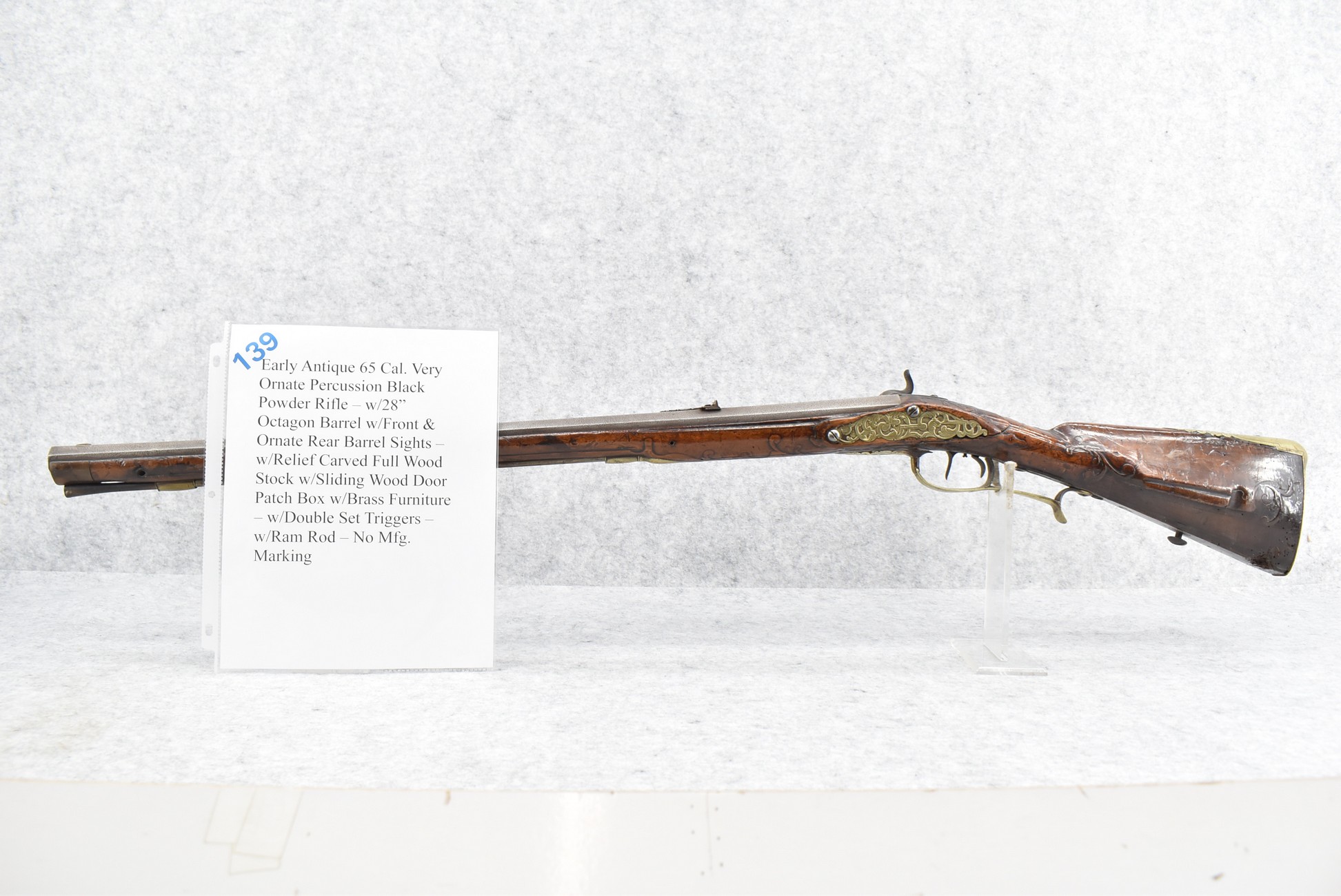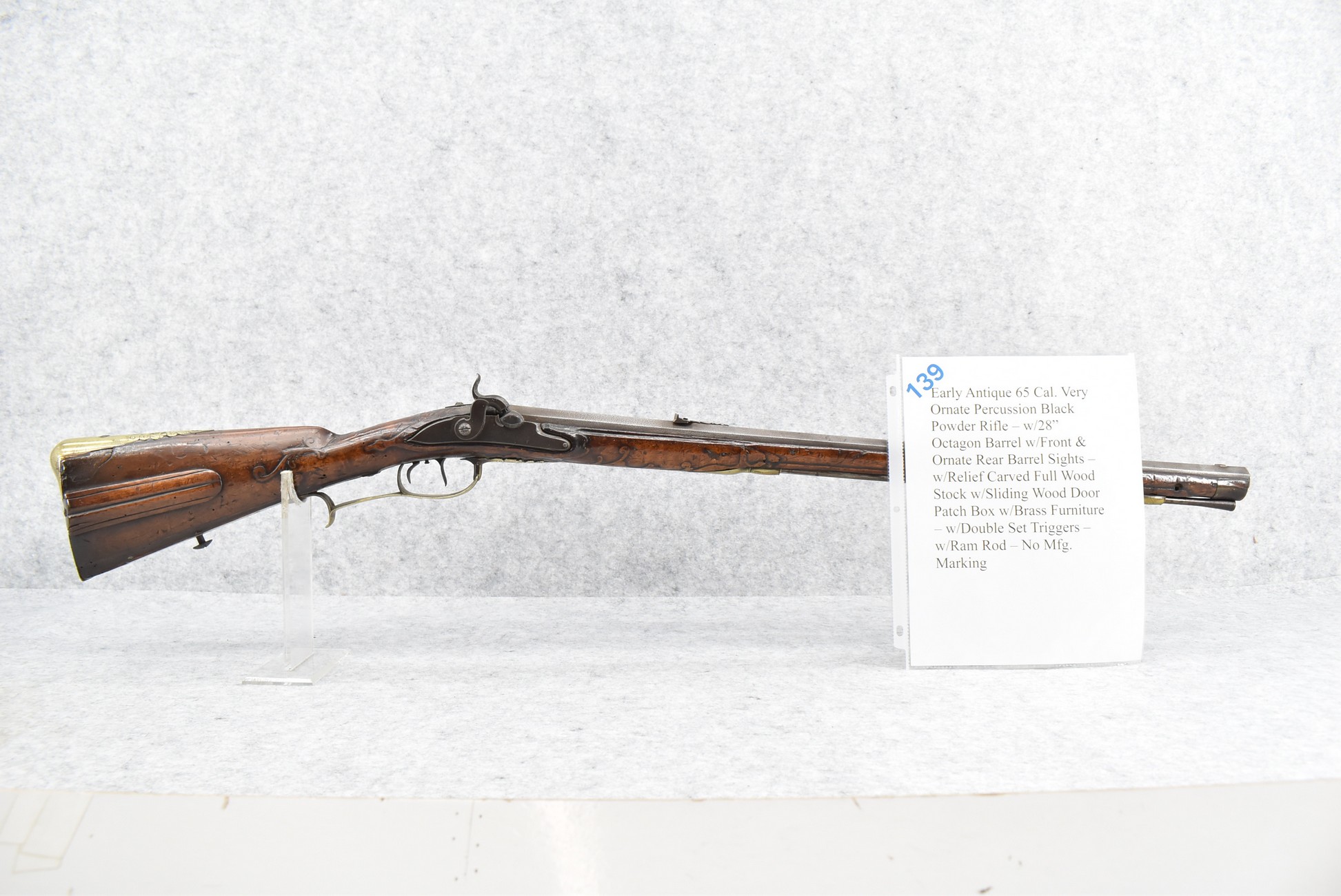 139. Early Antique 65 Cal. Very Ornate Percussion Black Powder Rifle – w/28” Octagon Barrel w/Front & Ornate Rear Barrel Sights – w/Relief Carved Full Wood Stock w/Sliding Wood Door Patch Box w/Brass Furniture – w/Double Set Triggers – w/Ram Rod – No Mfg. Marking