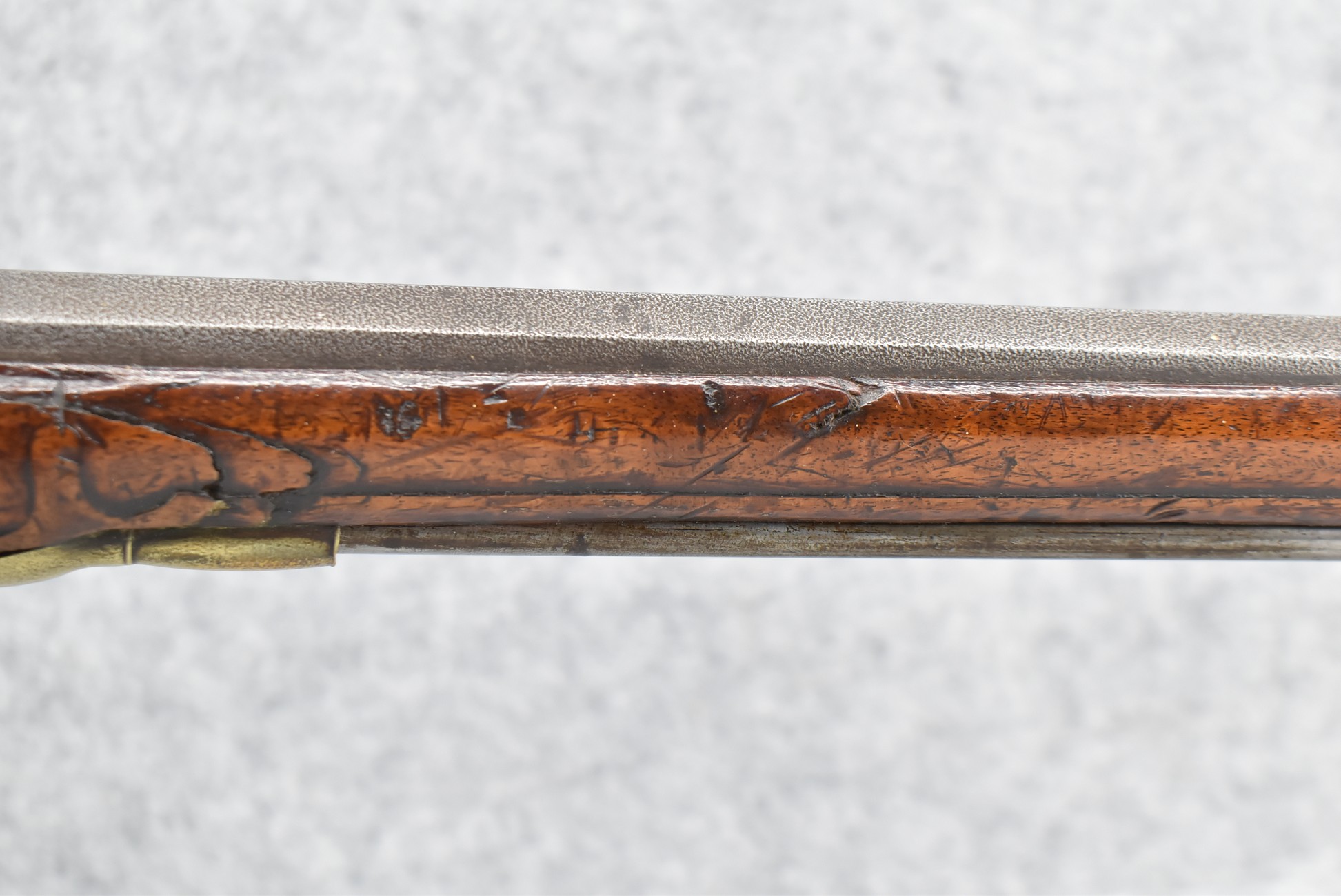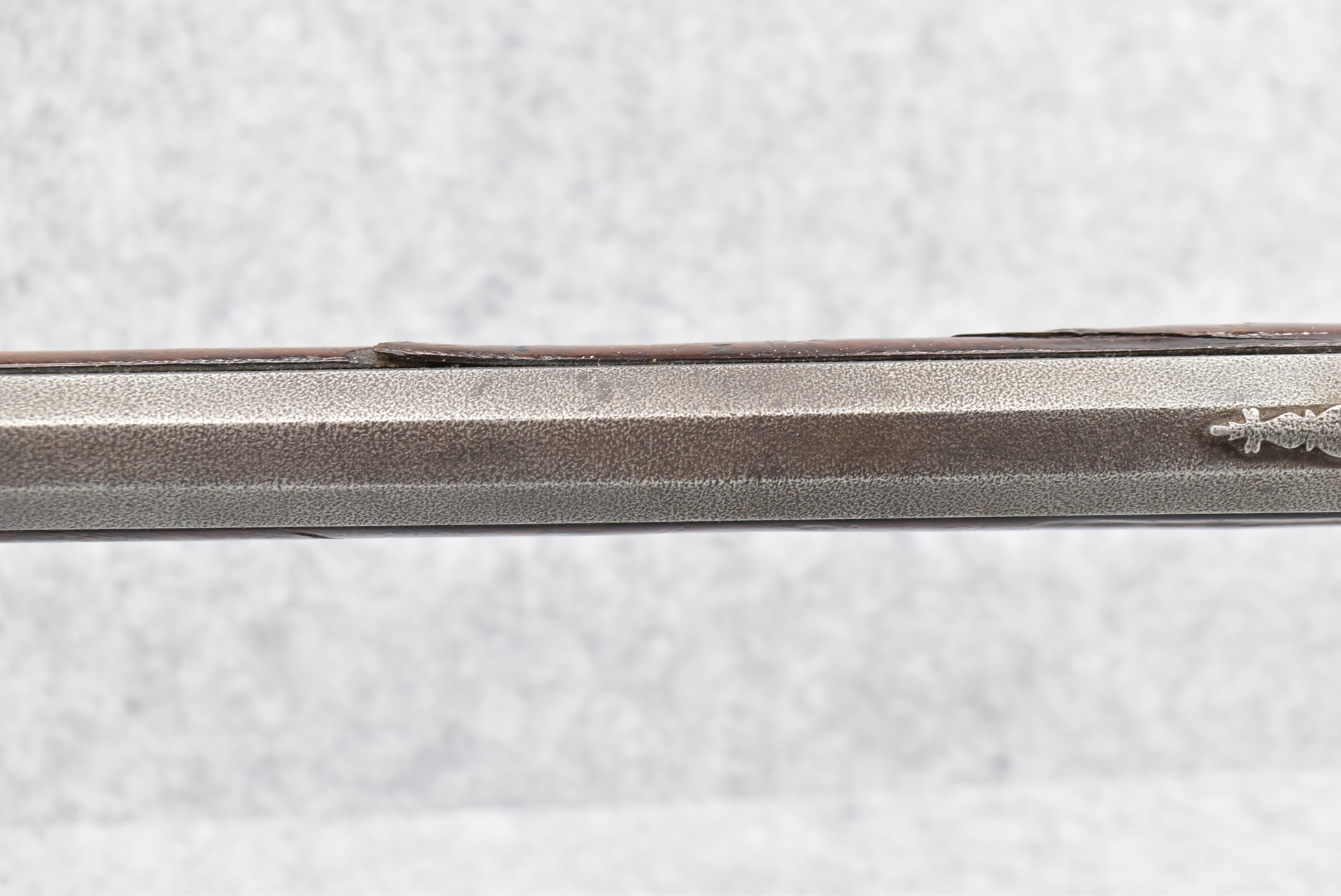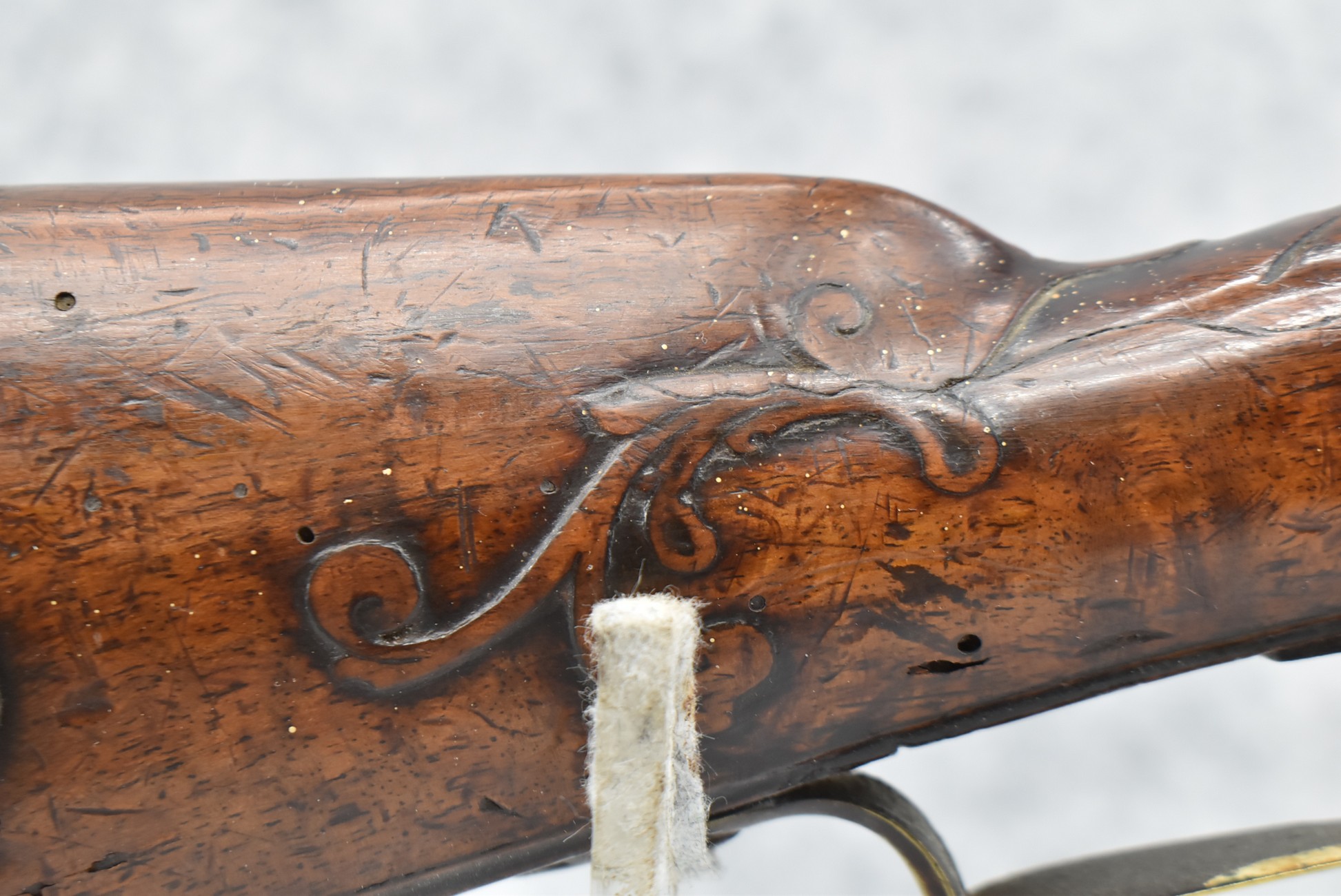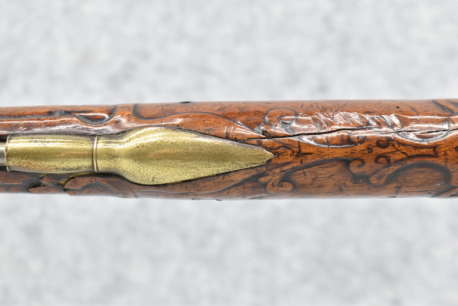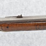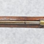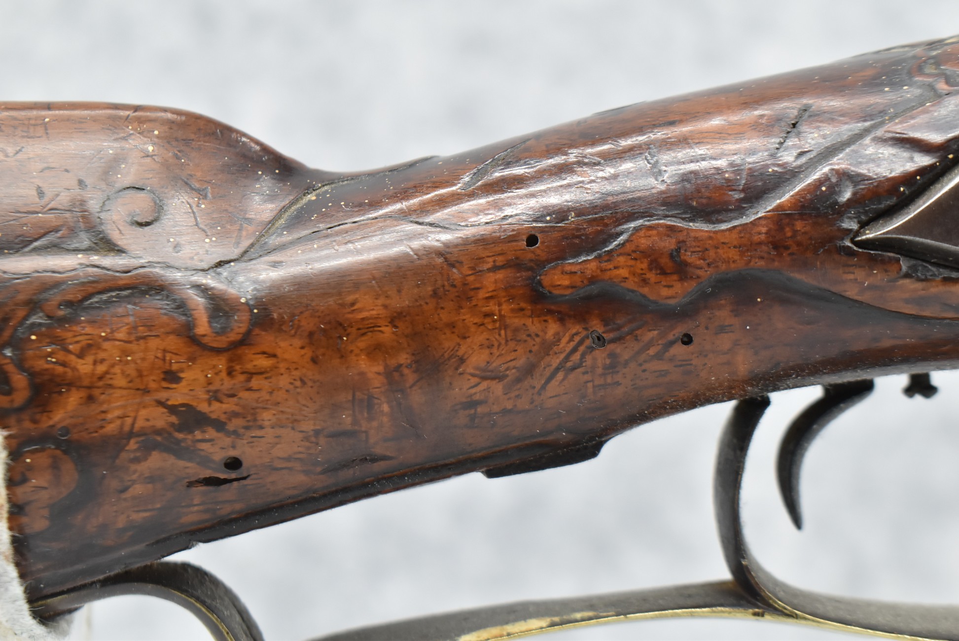 139. Early Antique 65 Cal. Very Ornate Percussion Black Powder Rifle – w/28” Octagon Barrel w/Front & Ornate Rear Barrel Sights – w/Relief Carved Full Wood Stock w/Sliding Wood Door Patch Box w/Brass Furniture – w/Double Set Triggers – w/Ram Rod – No Mfg. Marking