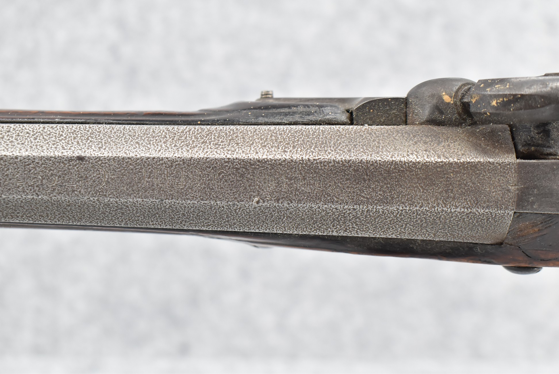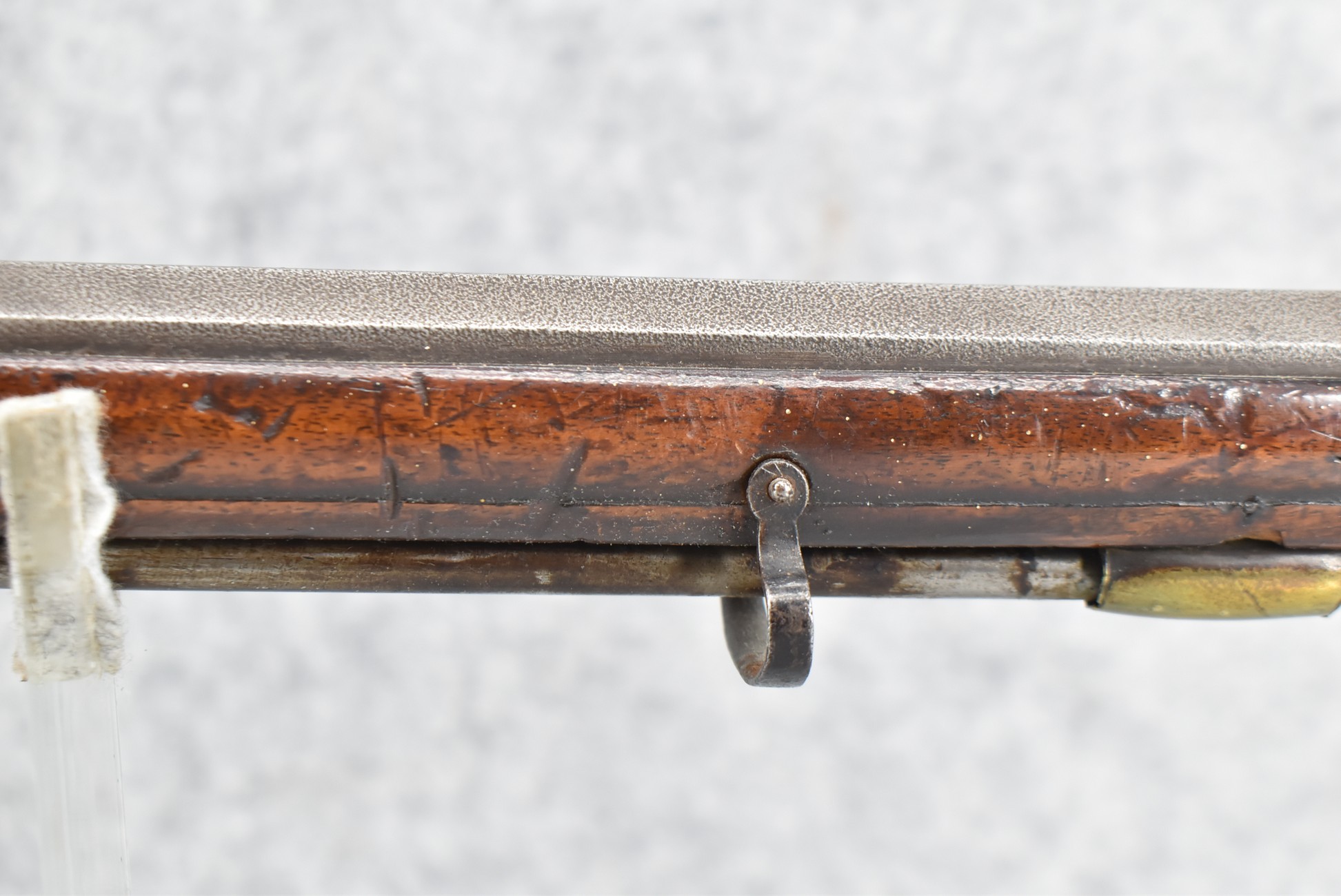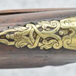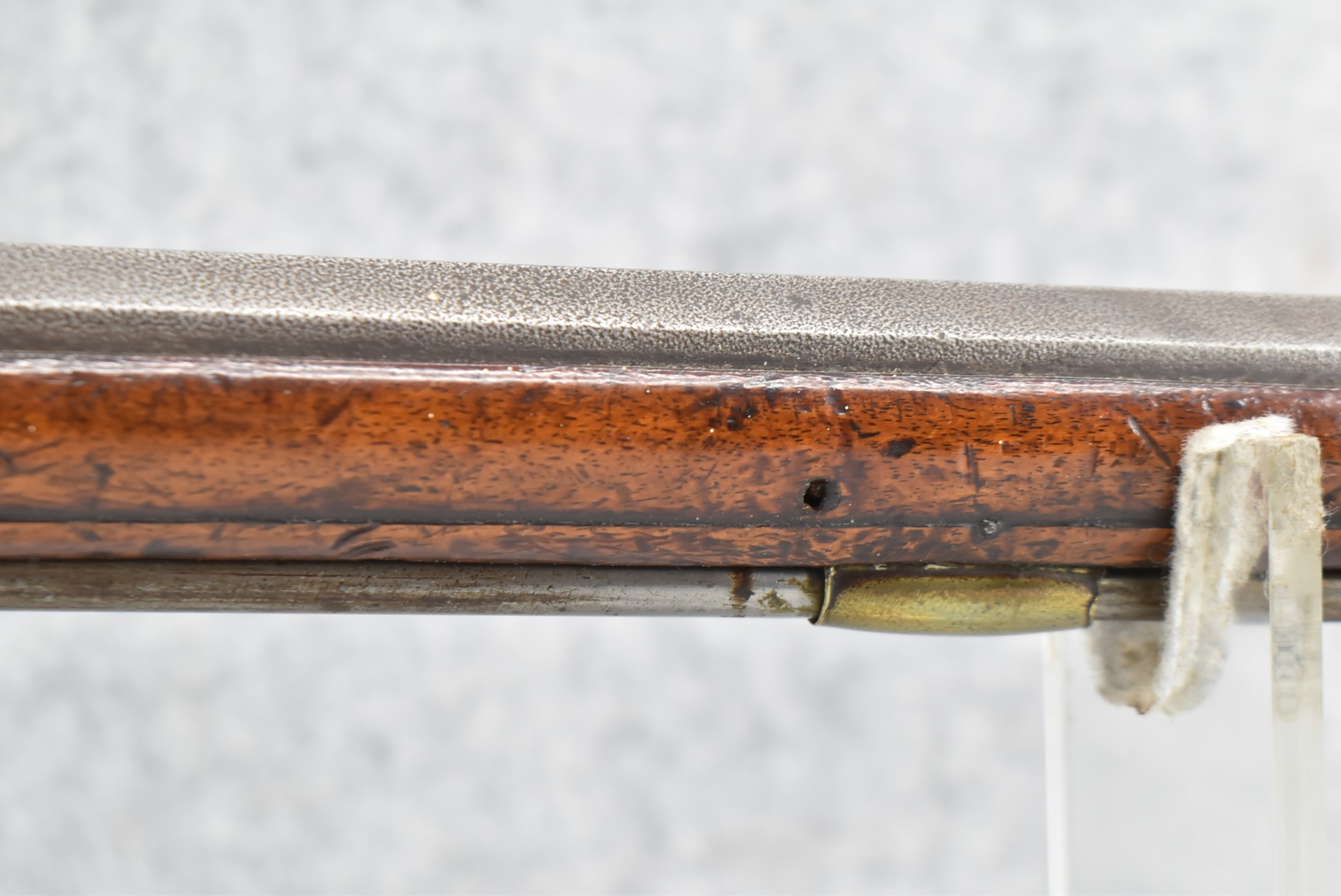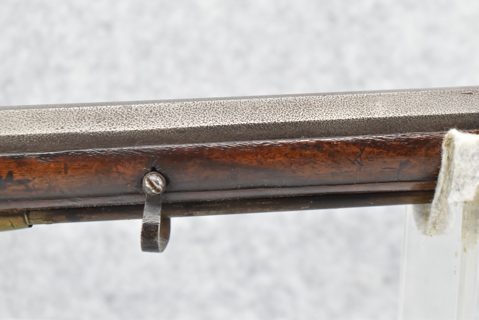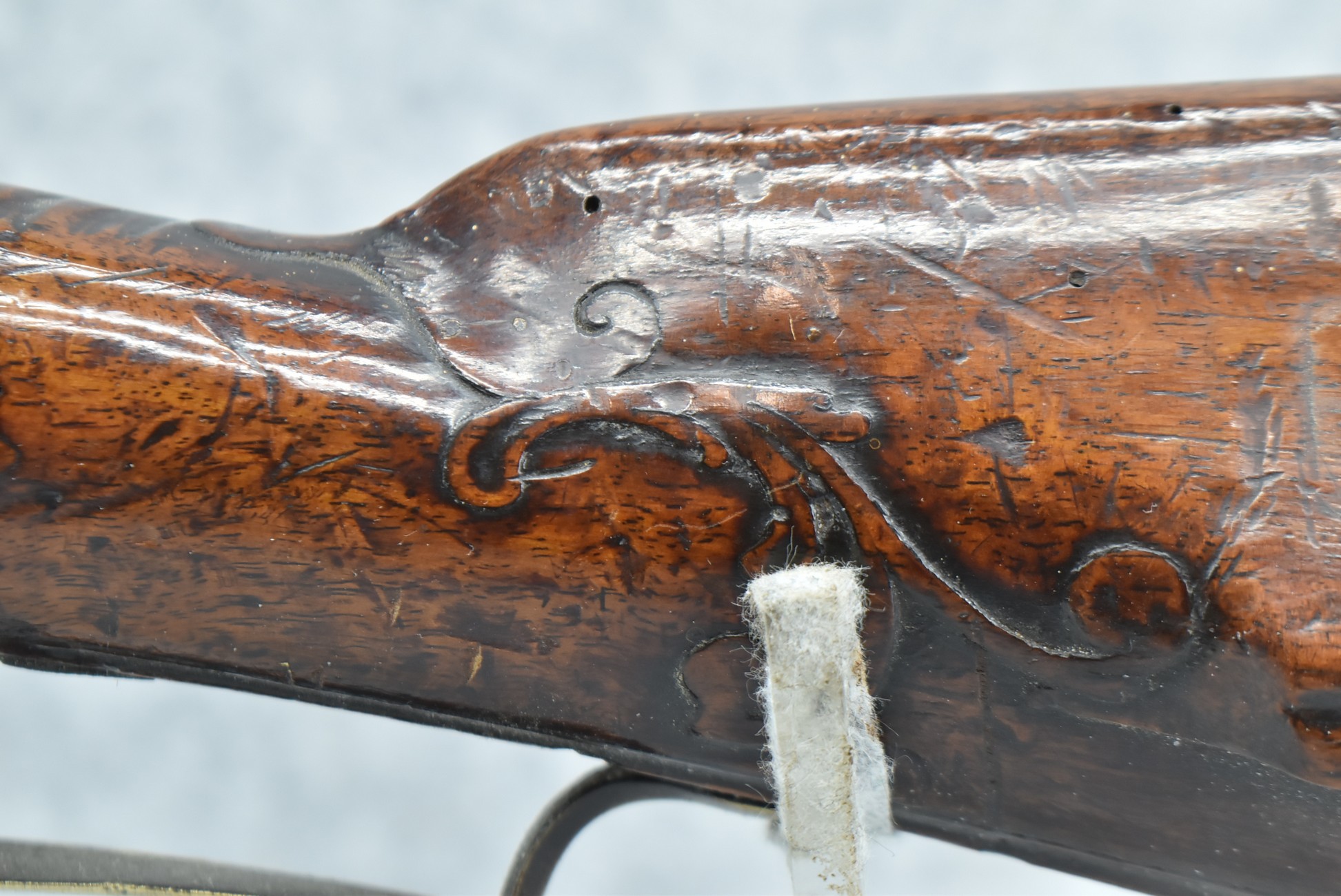 139. Early Antique 65 Cal. Very Ornate Percussion Black Powder Rifle – w/28” Octagon Barrel w/Front & Ornate Rear Barrel Sights – w/Relief Carved Full Wood Stock w/Sliding Wood Door Patch Box w/Brass Furniture – w/Double Set Triggers – w/Ram Rod – No Mfg. Marking