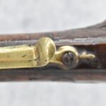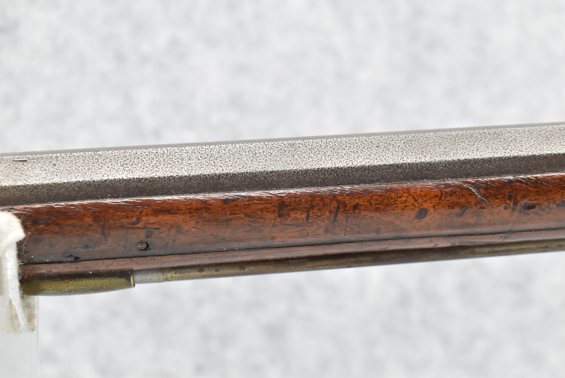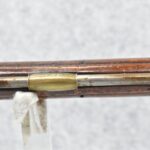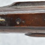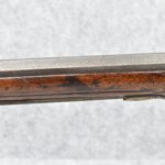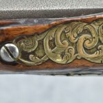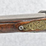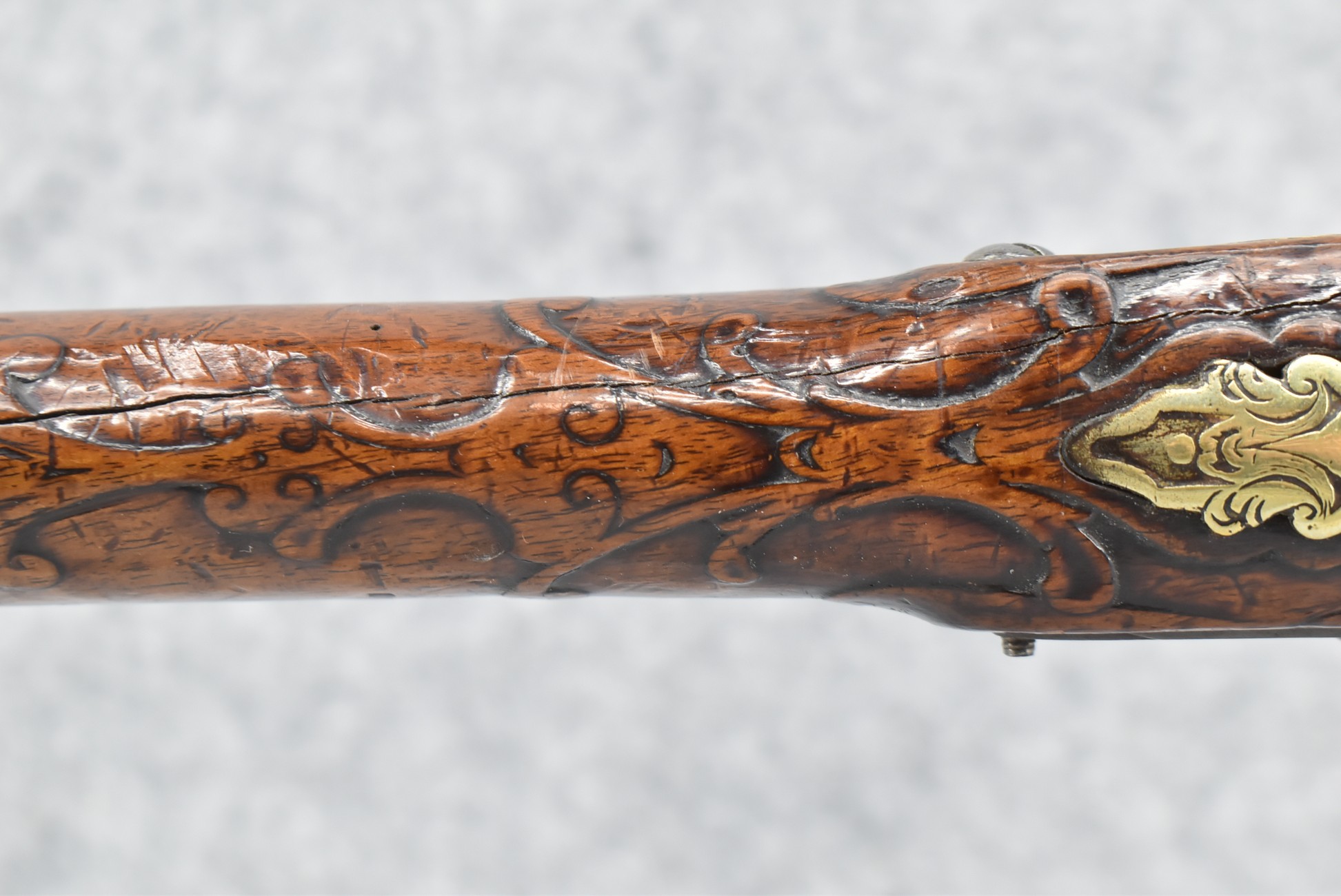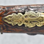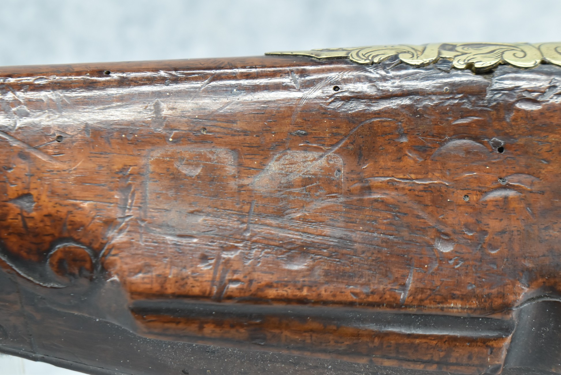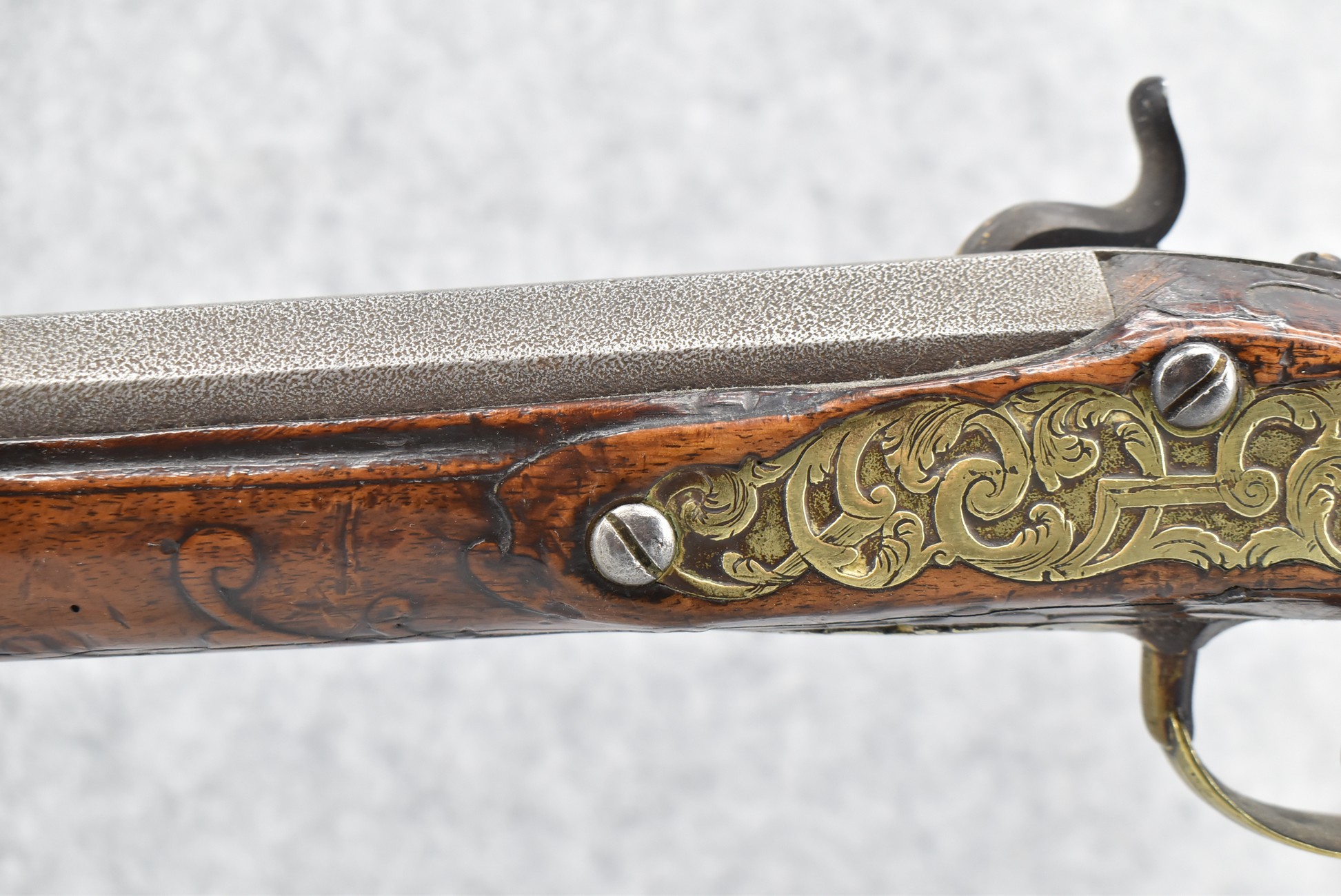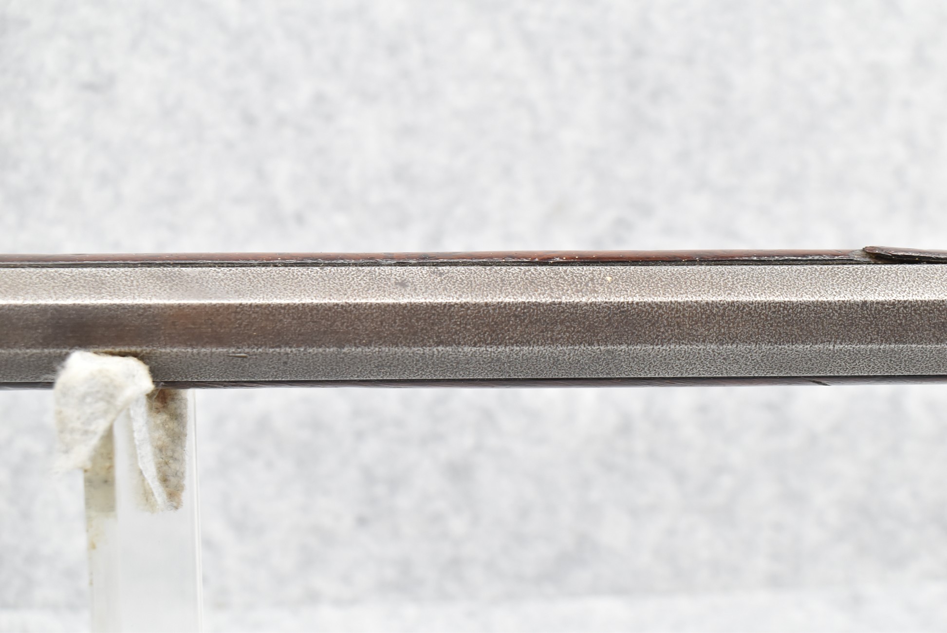 139. Early Antique 65 Cal. Very Ornate Percussion Black Powder Rifle – w/28” Octagon Barrel w/Front & Ornate Rear Barrel Sights – w/Relief Carved Full Wood Stock w/Sliding Wood Door Patch Box w/Brass Furniture – w/Double Set Triggers – w/Ram Rod – No Mfg. Marking