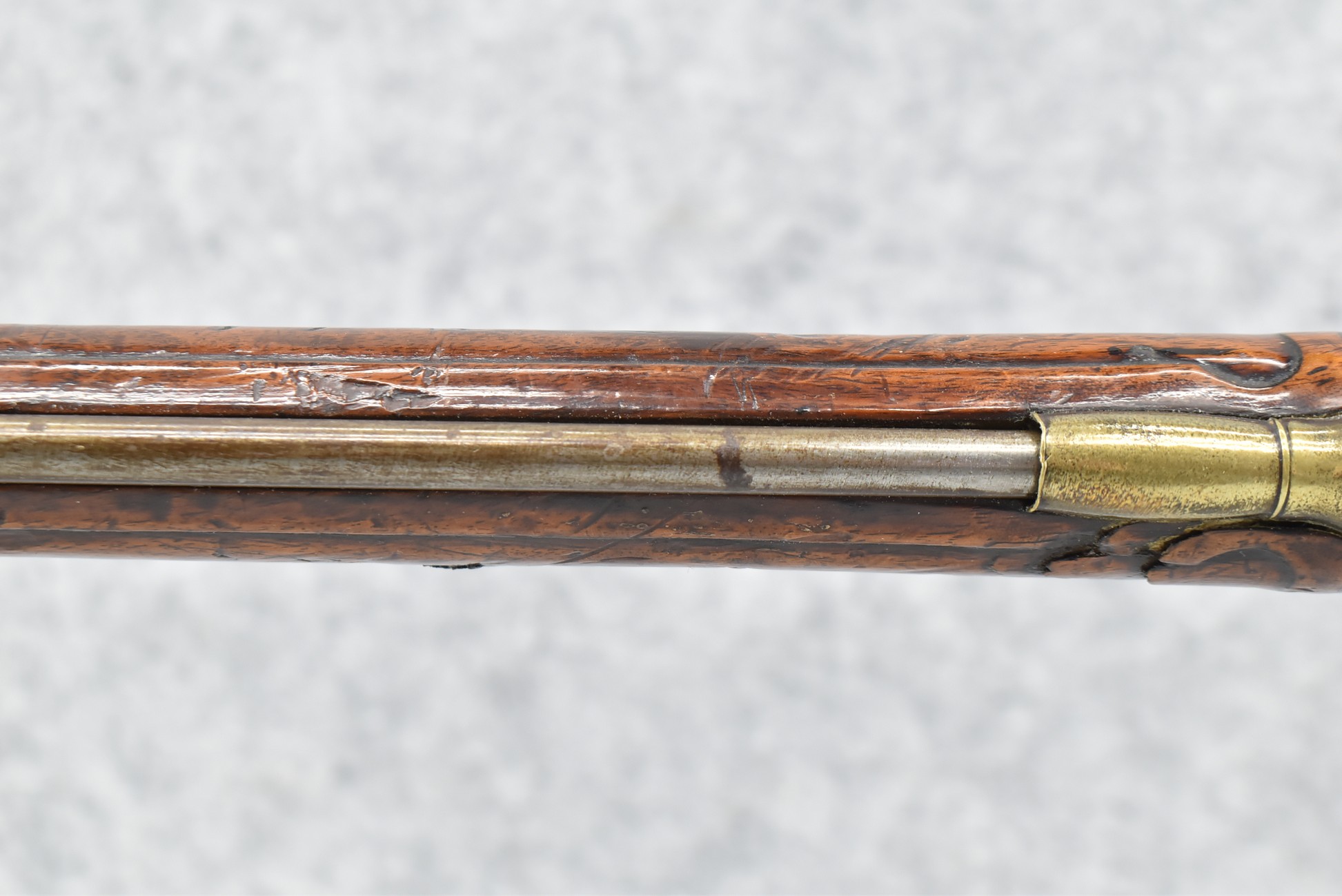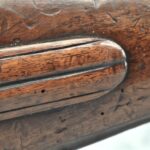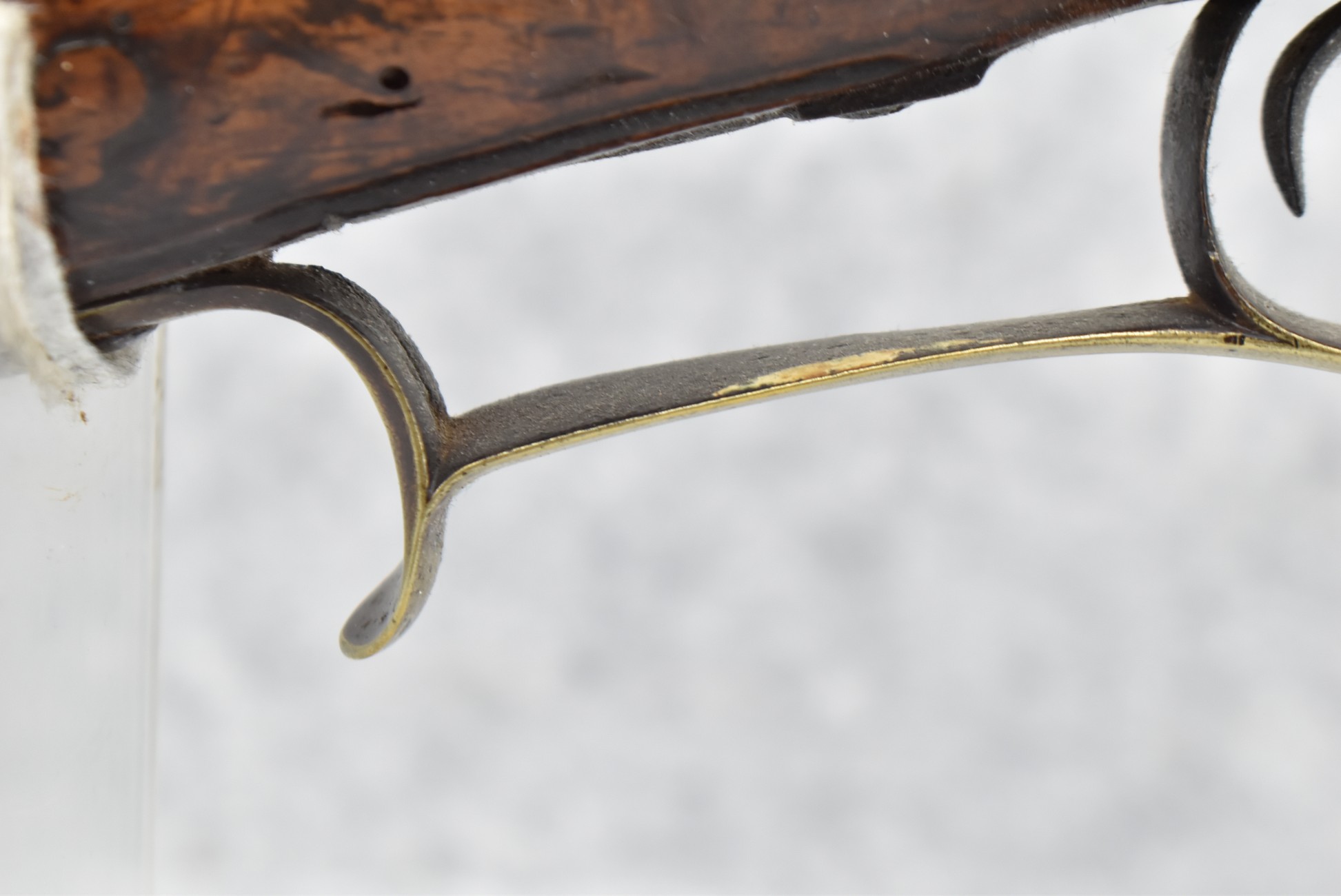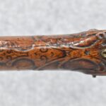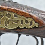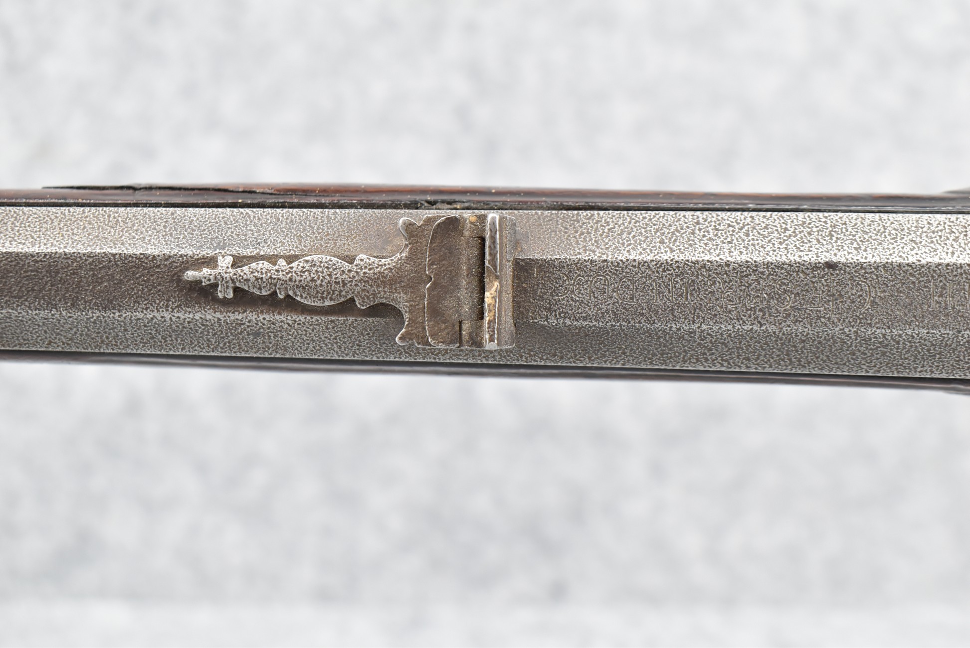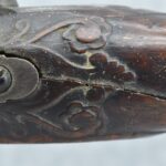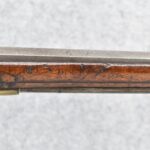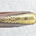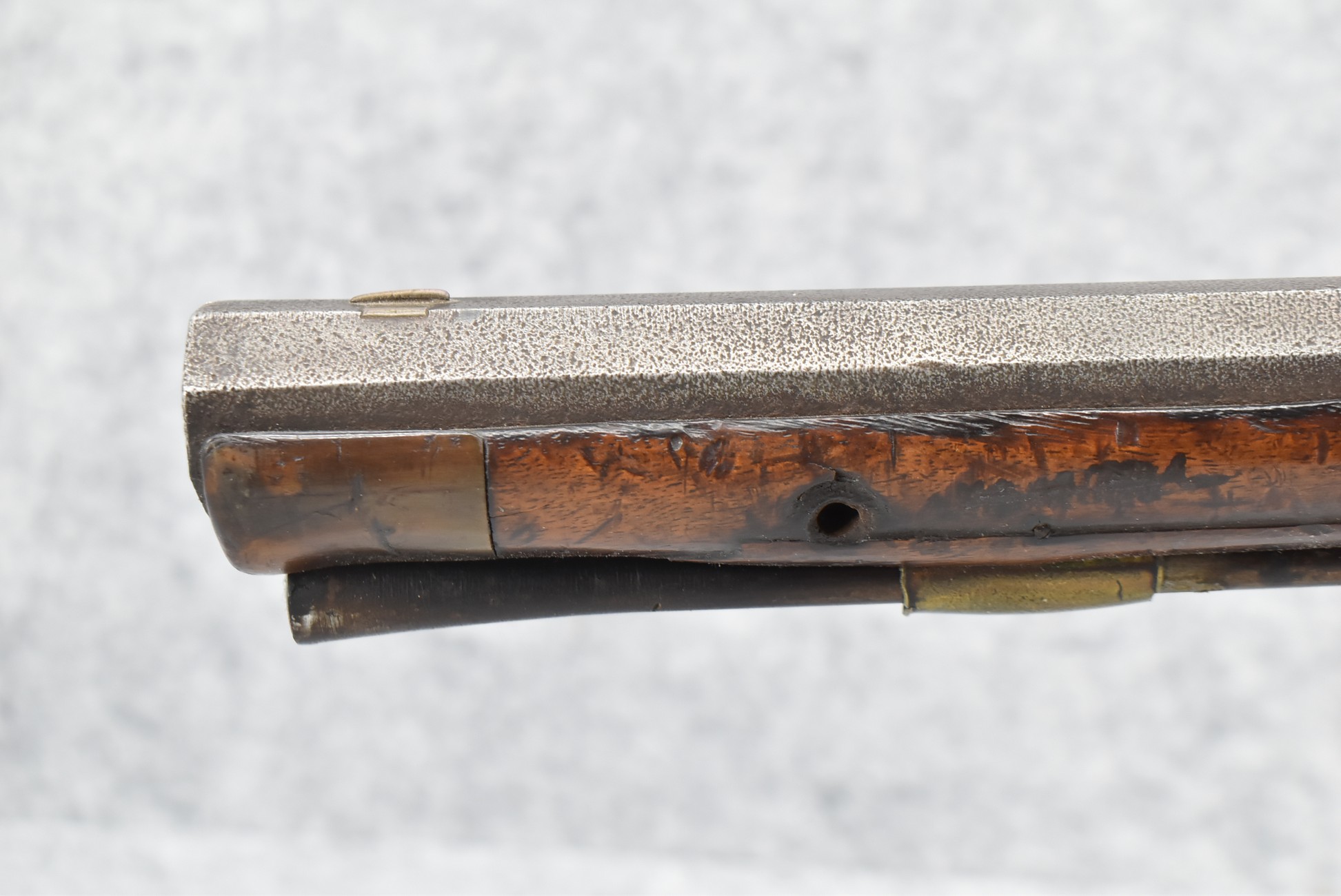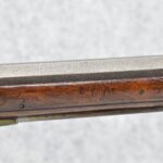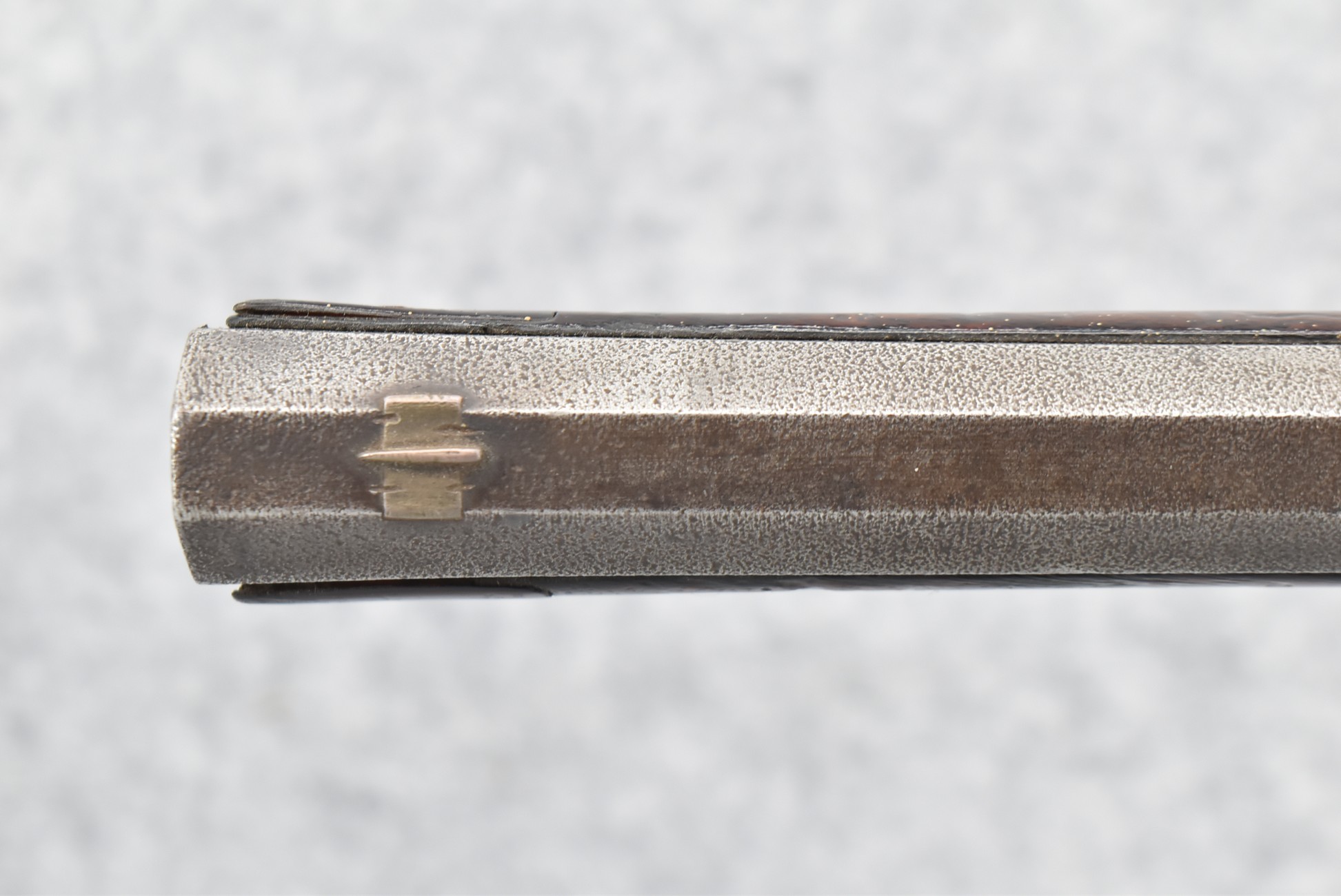 139. Early Antique 65 Cal. Very Ornate Percussion Black Powder Rifle – w/28” Octagon Barrel w/Front & Ornate Rear Barrel Sights – w/Relief Carved Full Wood Stock w/Sliding Wood Door Patch Box w/Brass Furniture – w/Double Set Triggers – w/Ram Rod – No Mfg. Marking